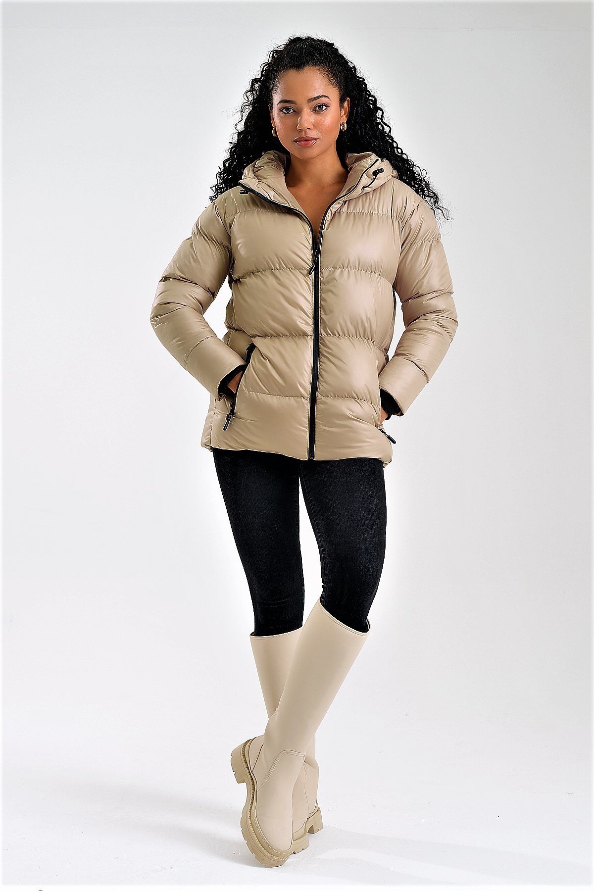 معطف منتفخ بغطاء للرأس باللون البيج وأكمام مضلعة