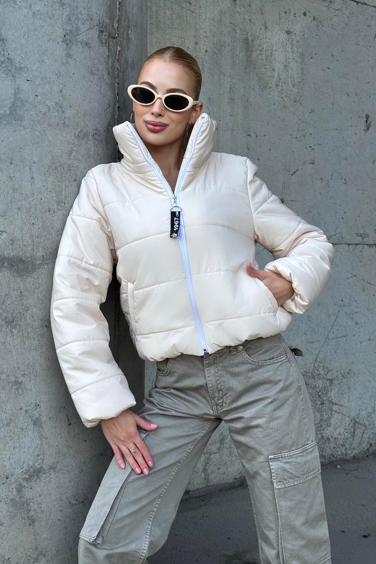 Pembe Sırtı Taş Baskılı Dik Yaka Kısa Şişme Mont