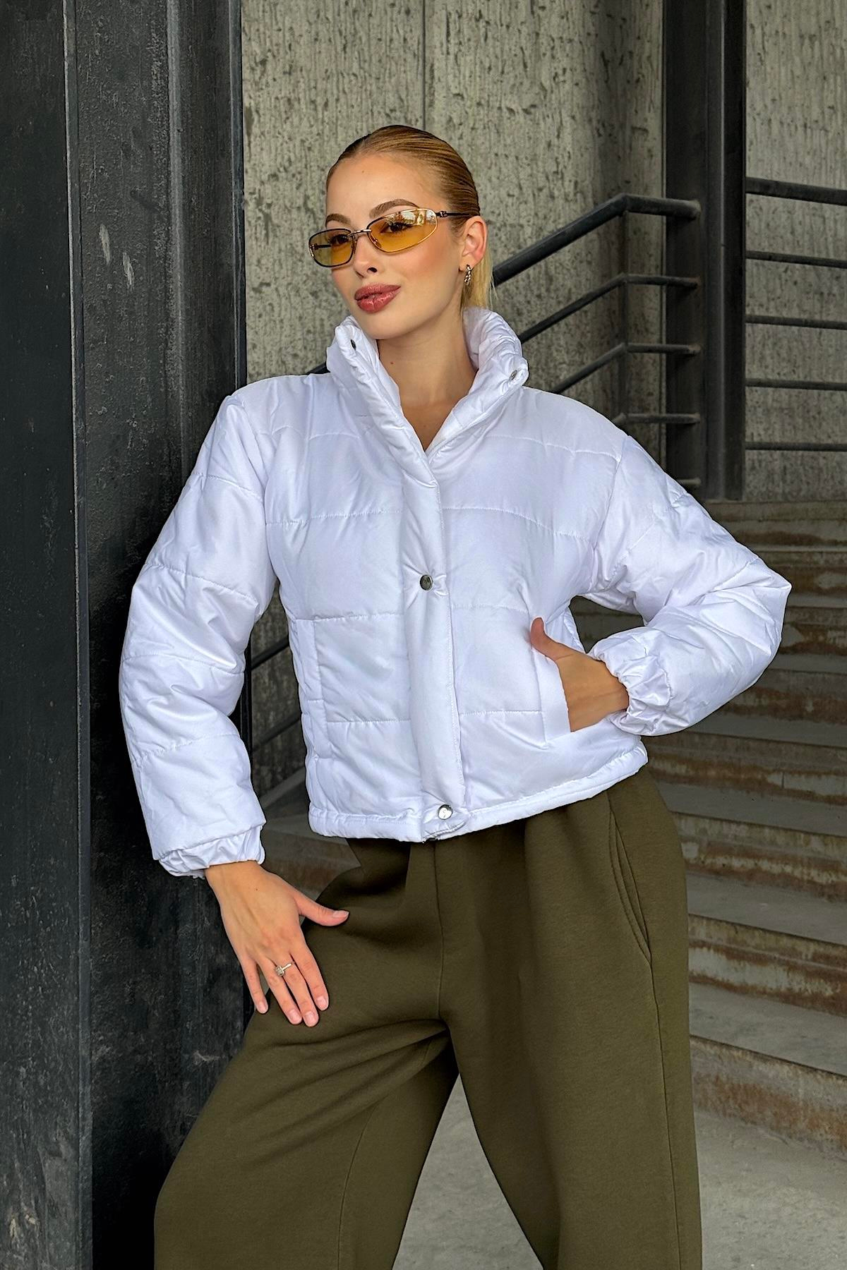 ياقة واقفة بيضاء، وسترة منتفخة قصيرة بسحاب وإبزيم
