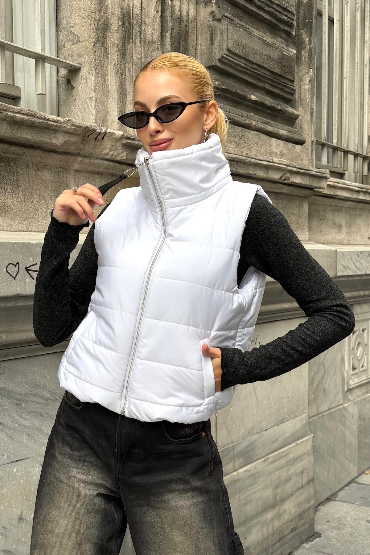 Beyaz Sırtı Taş İşlemeli Dik Yaka Kısa Şişme Yelek