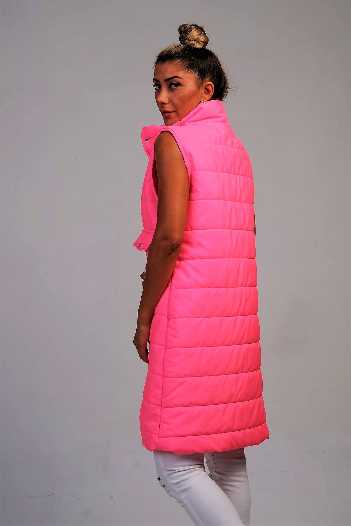 سترة منتفخة طويلة بياقة عالية وتفاصيل جيوب باللون الفوشيا
