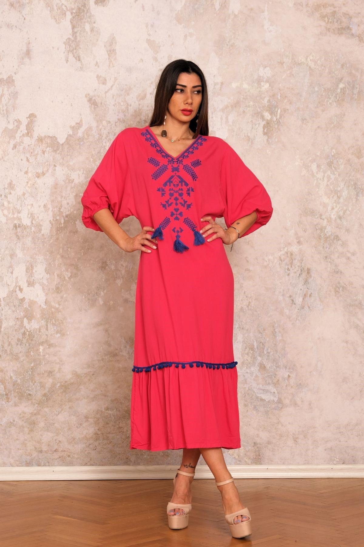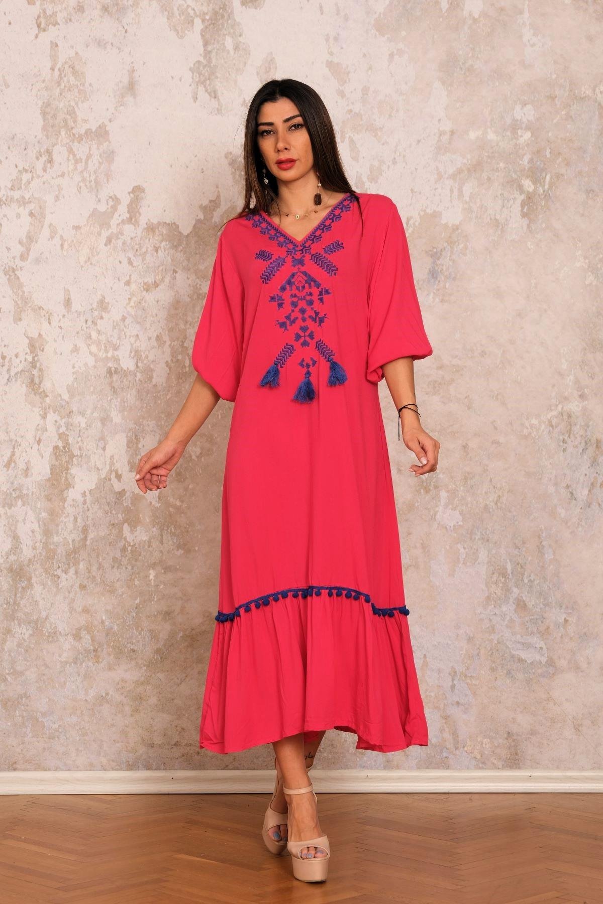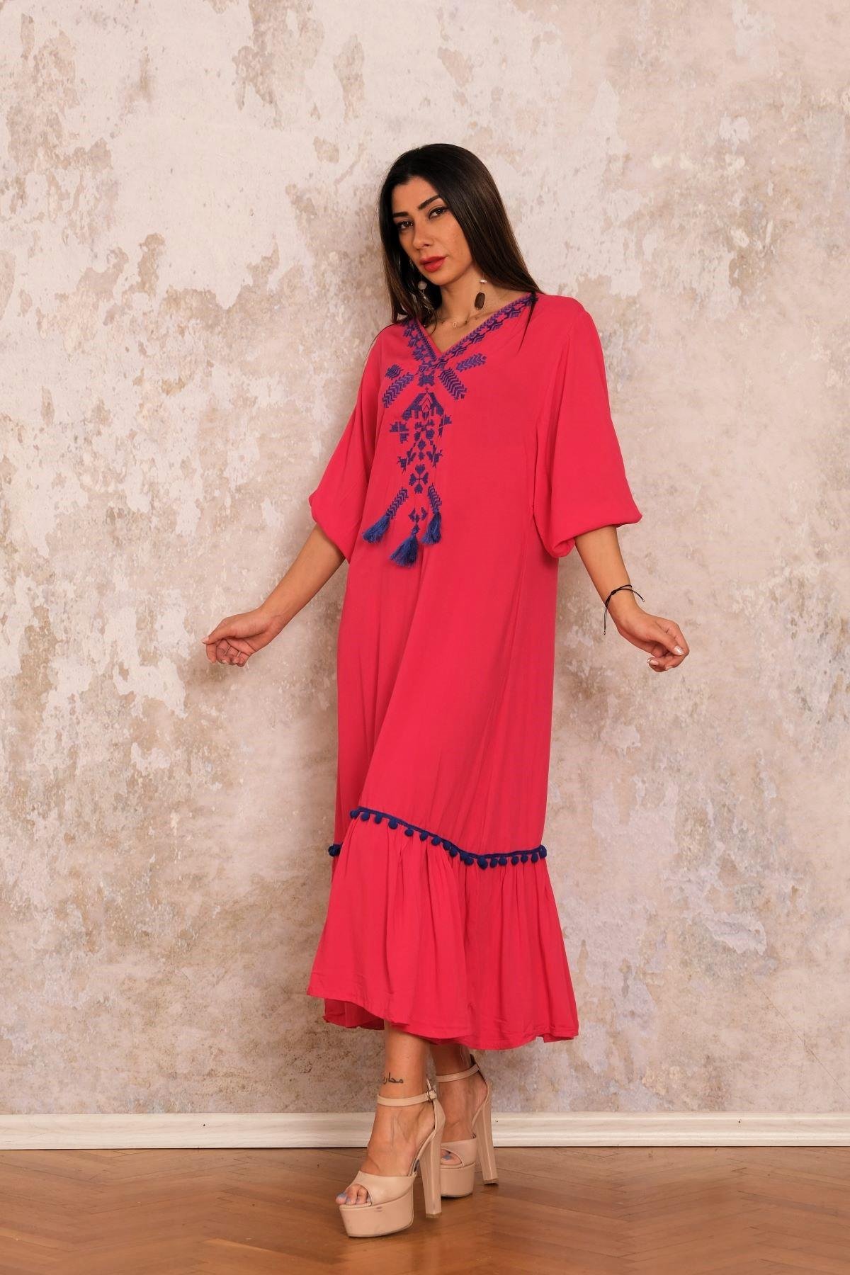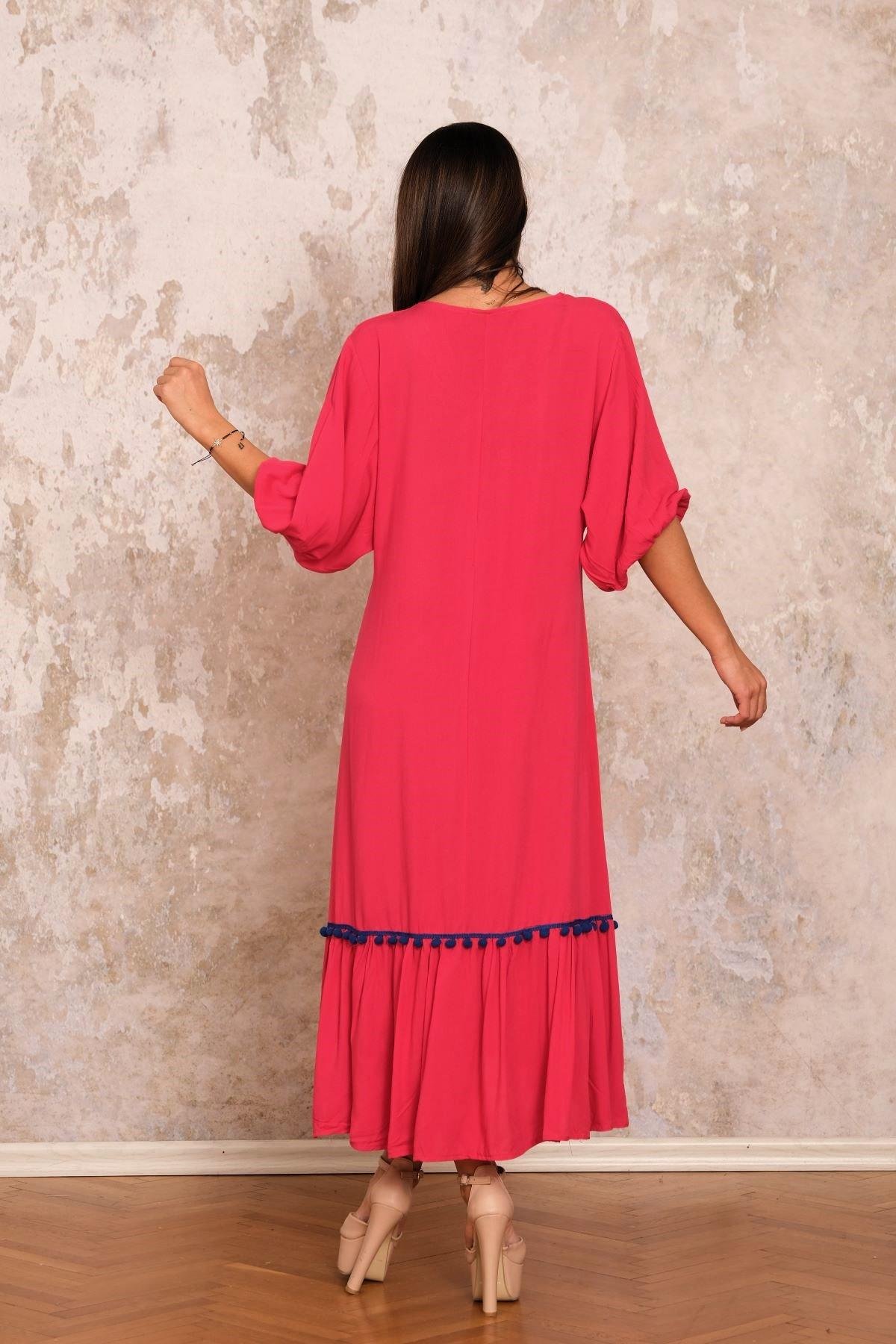 فستان طويل فوشيا بفتحة عنق على شكل حرف V ومطرز بشراريب أمامية مع كشكشة وكريات