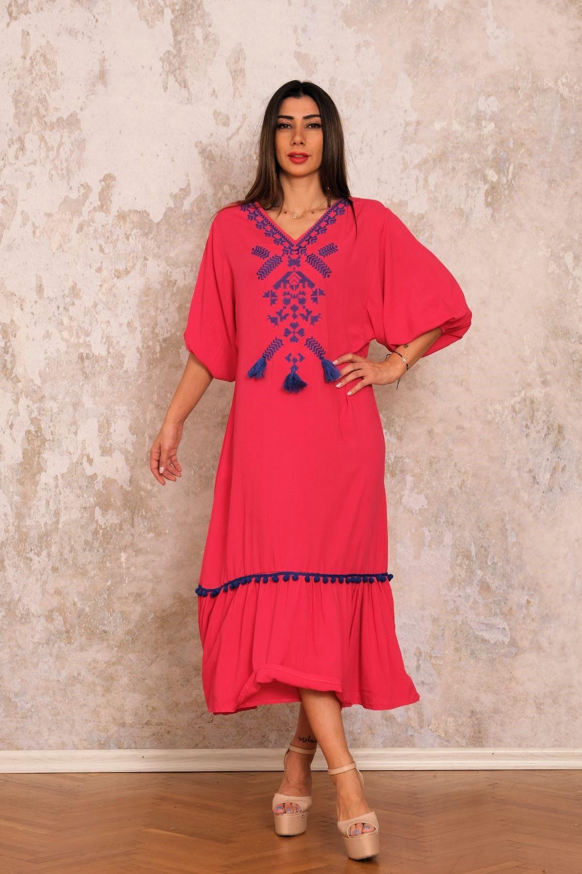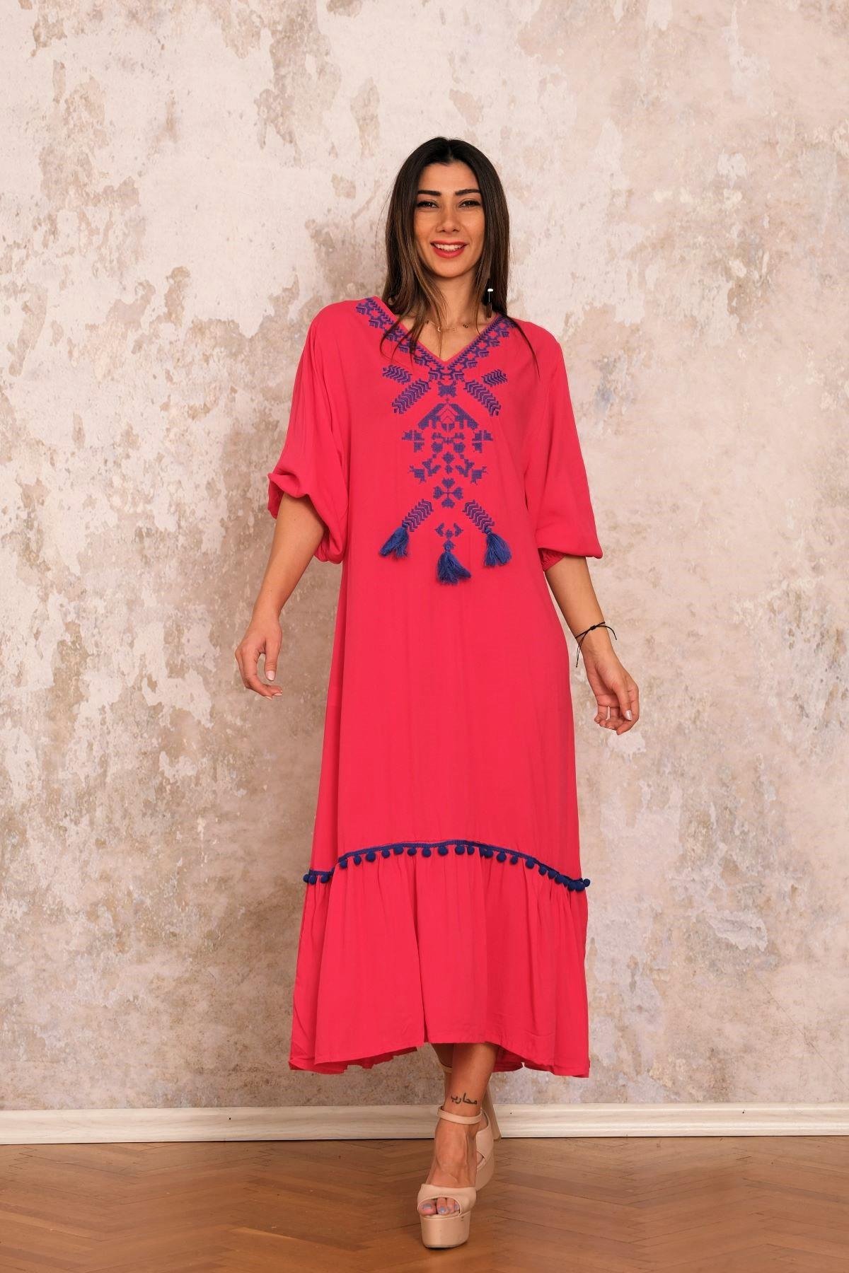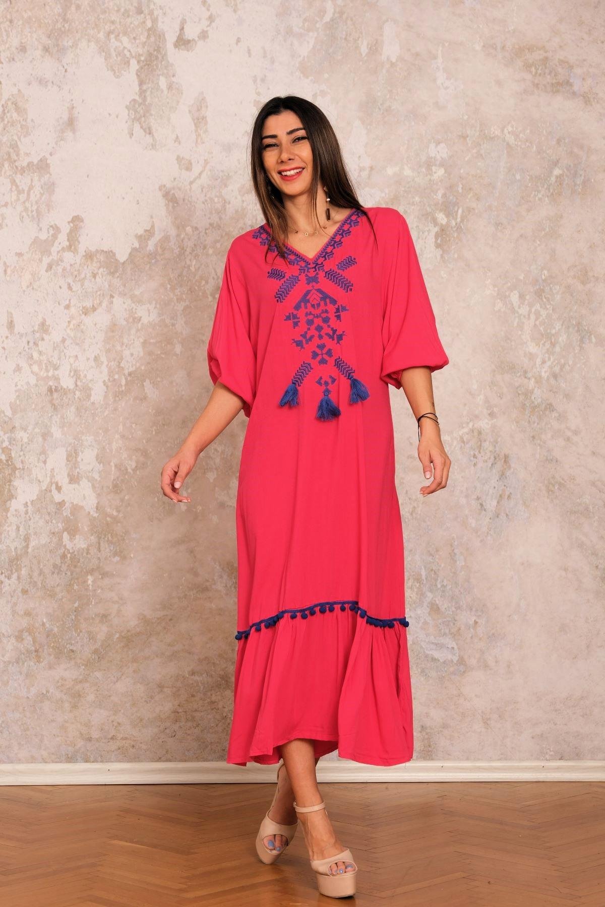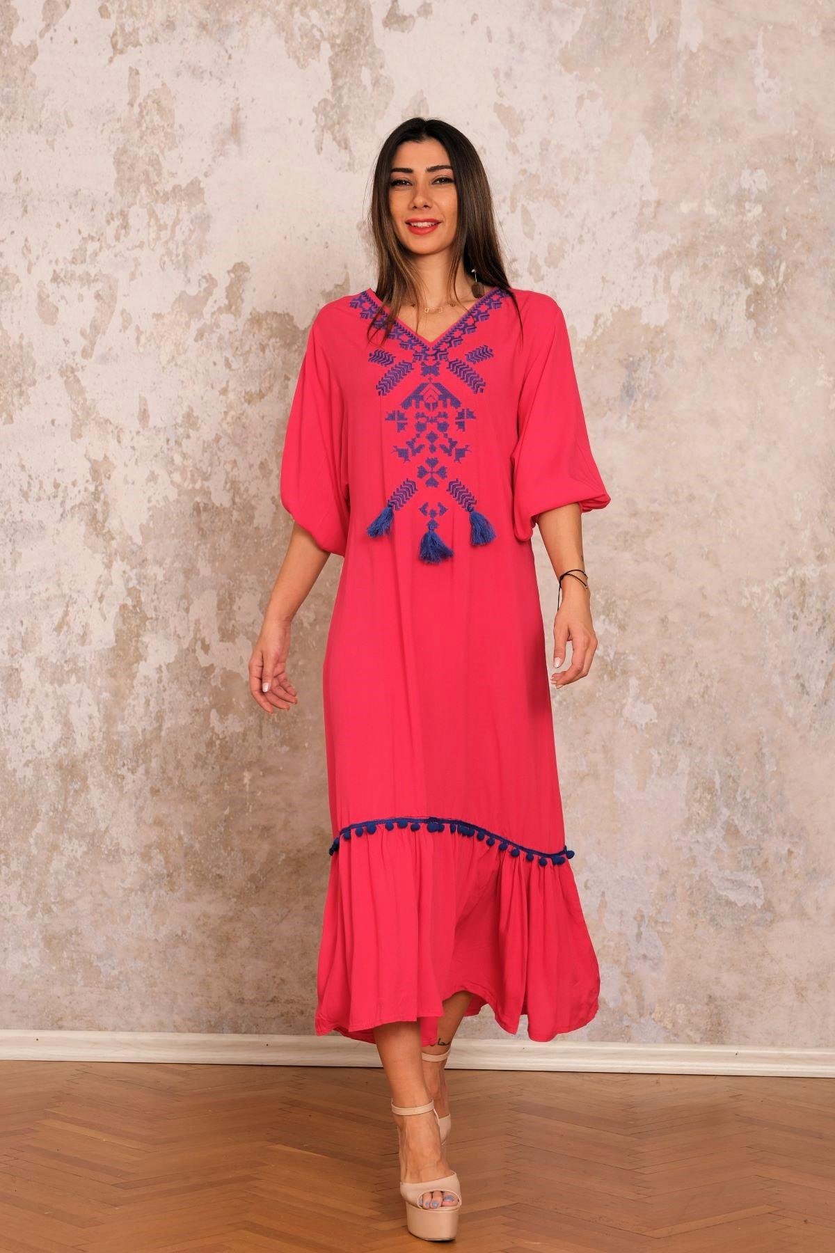 فستان طويل فوشيا بفتحة عنق على شكل حرف V ومطرز بشراريب أمامية مع كشكشة وكريات