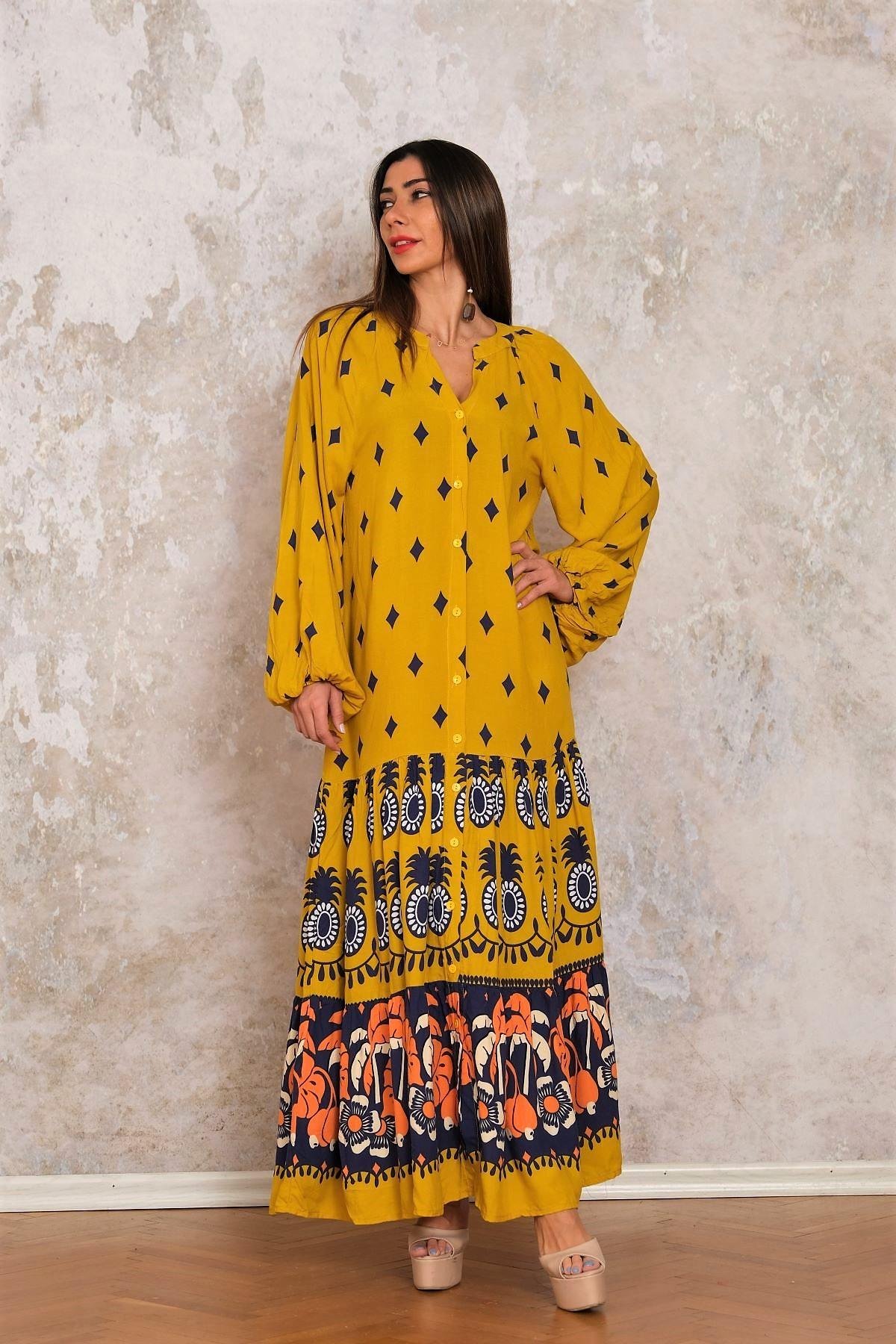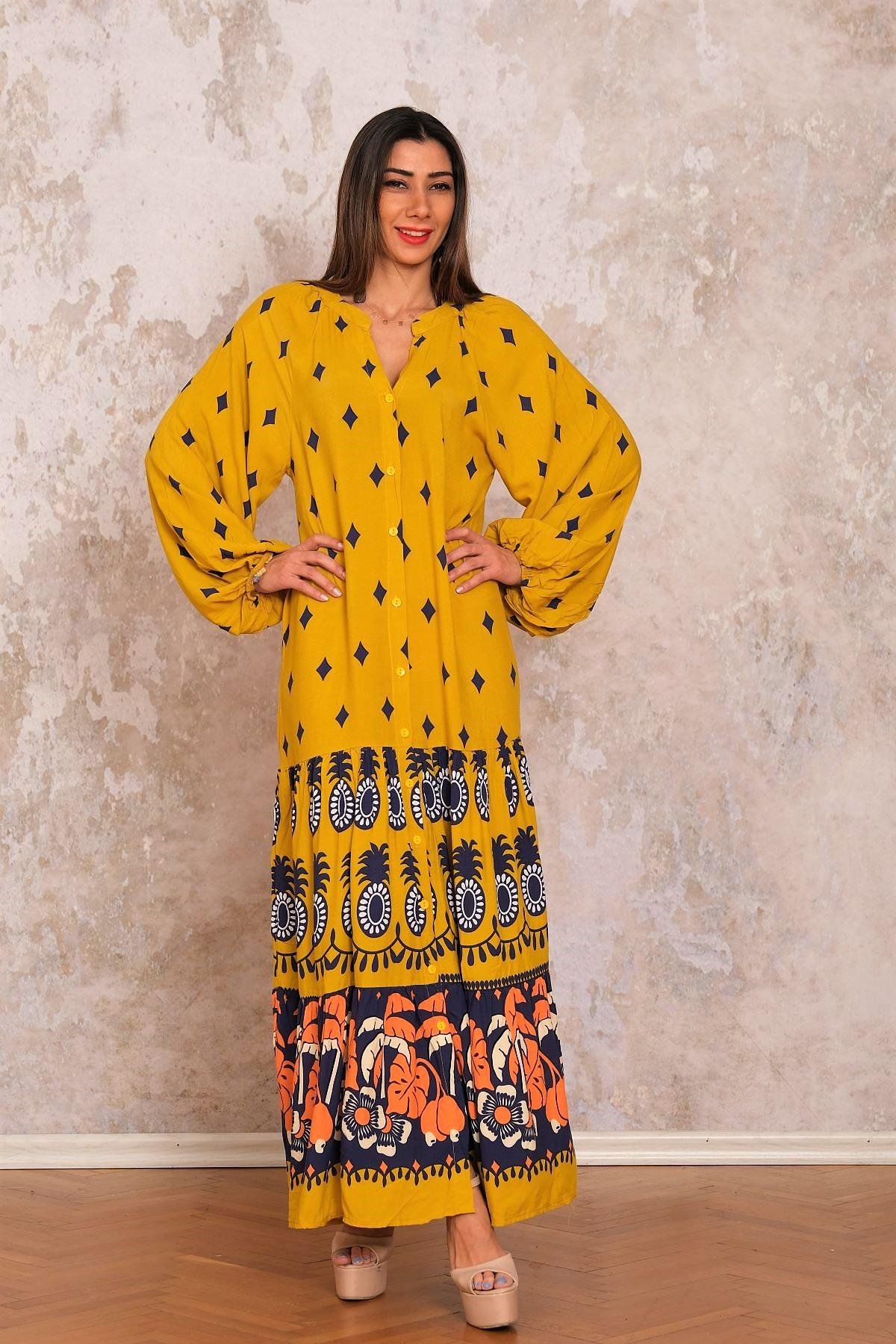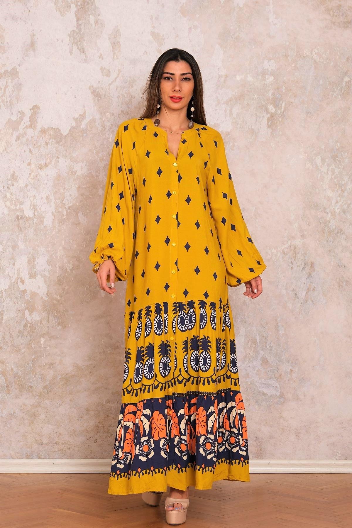 فستان طويل ذو طبقات بلون الخردل منقوش عرقيًا وأكمام بالونية وأكمام بالون من الأمام