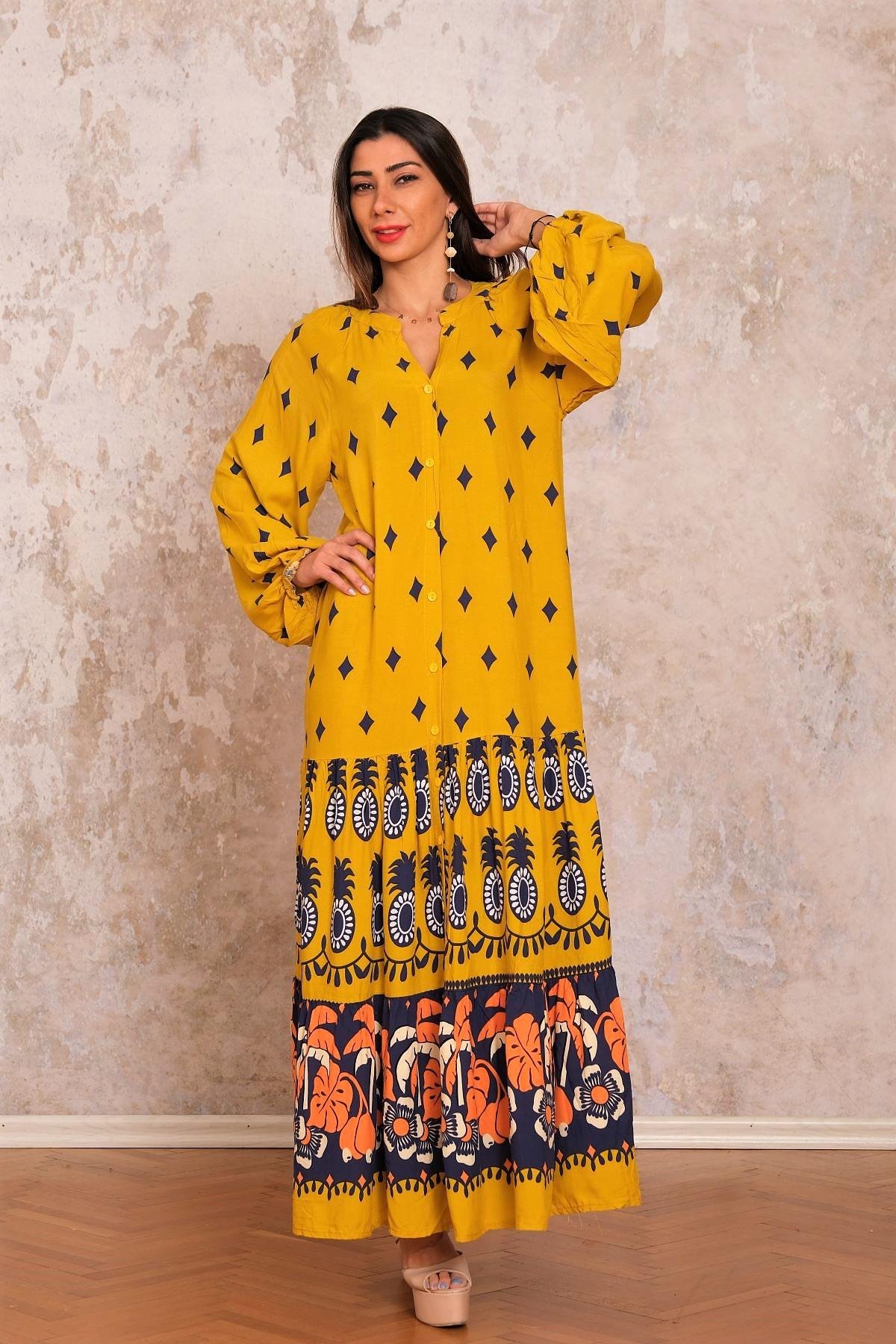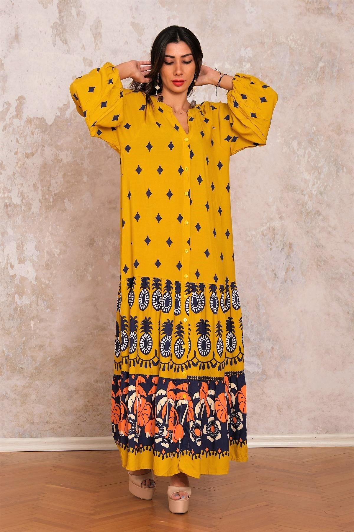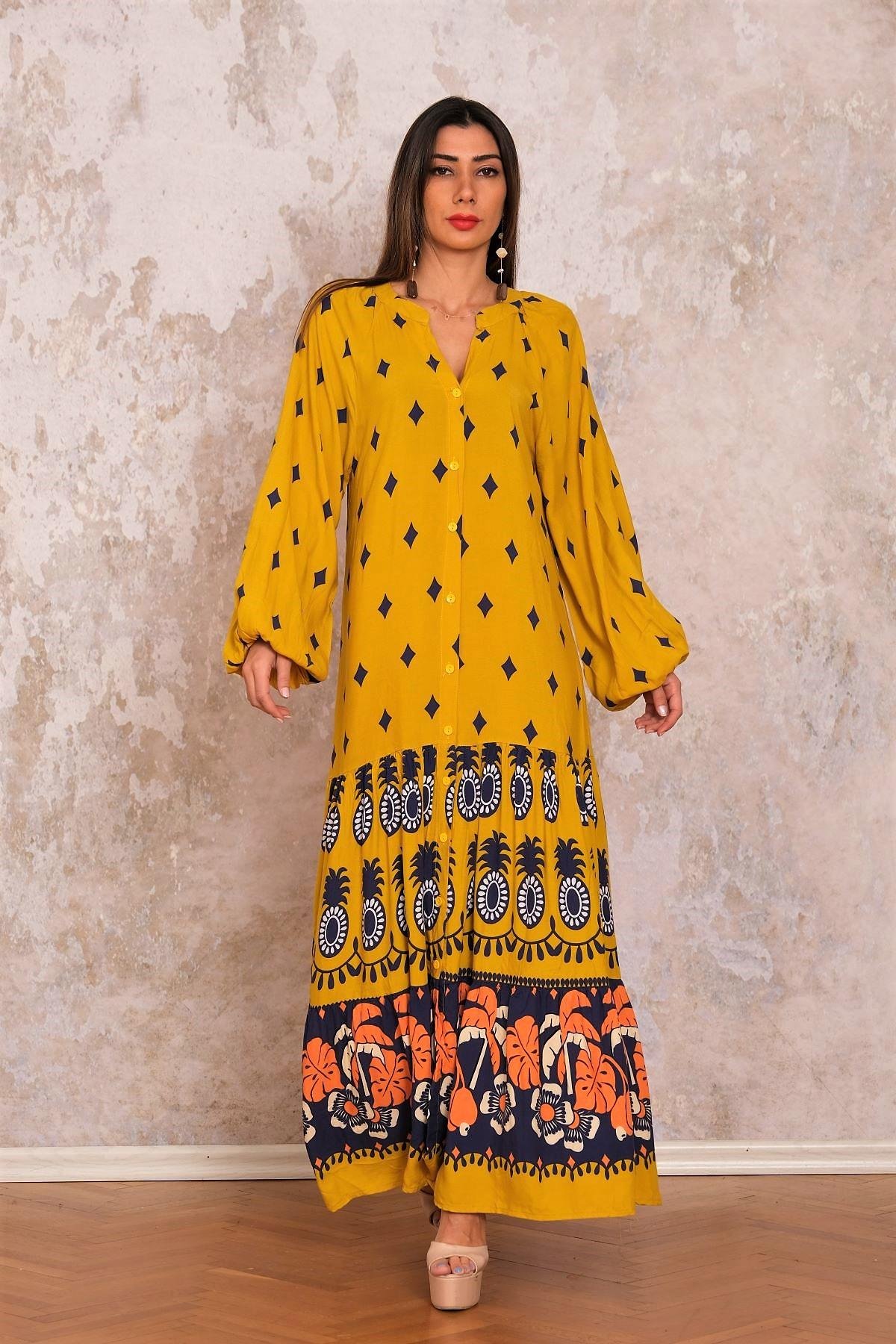 فستان طويل ذو طبقات بلون الخردل منقوش عرقيًا وأكمام بالونية وأكمام بالون من الأمام