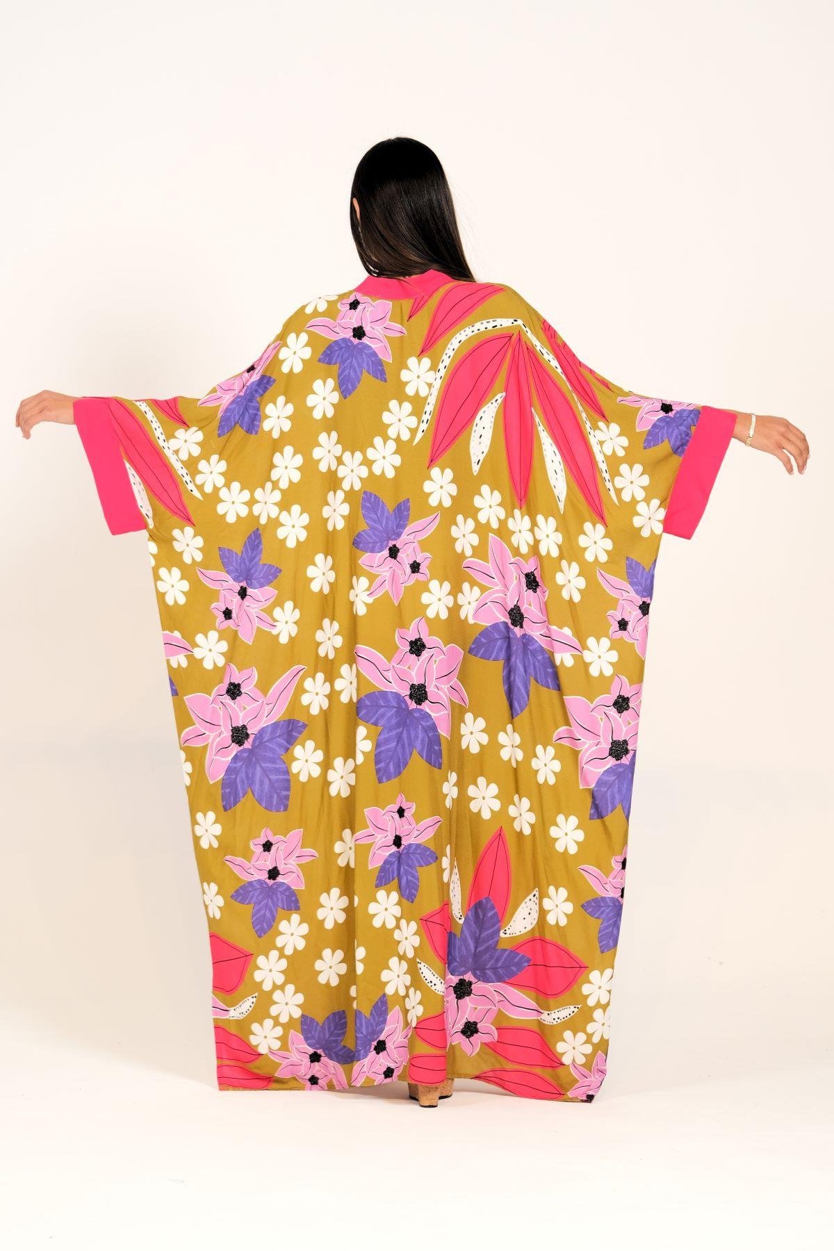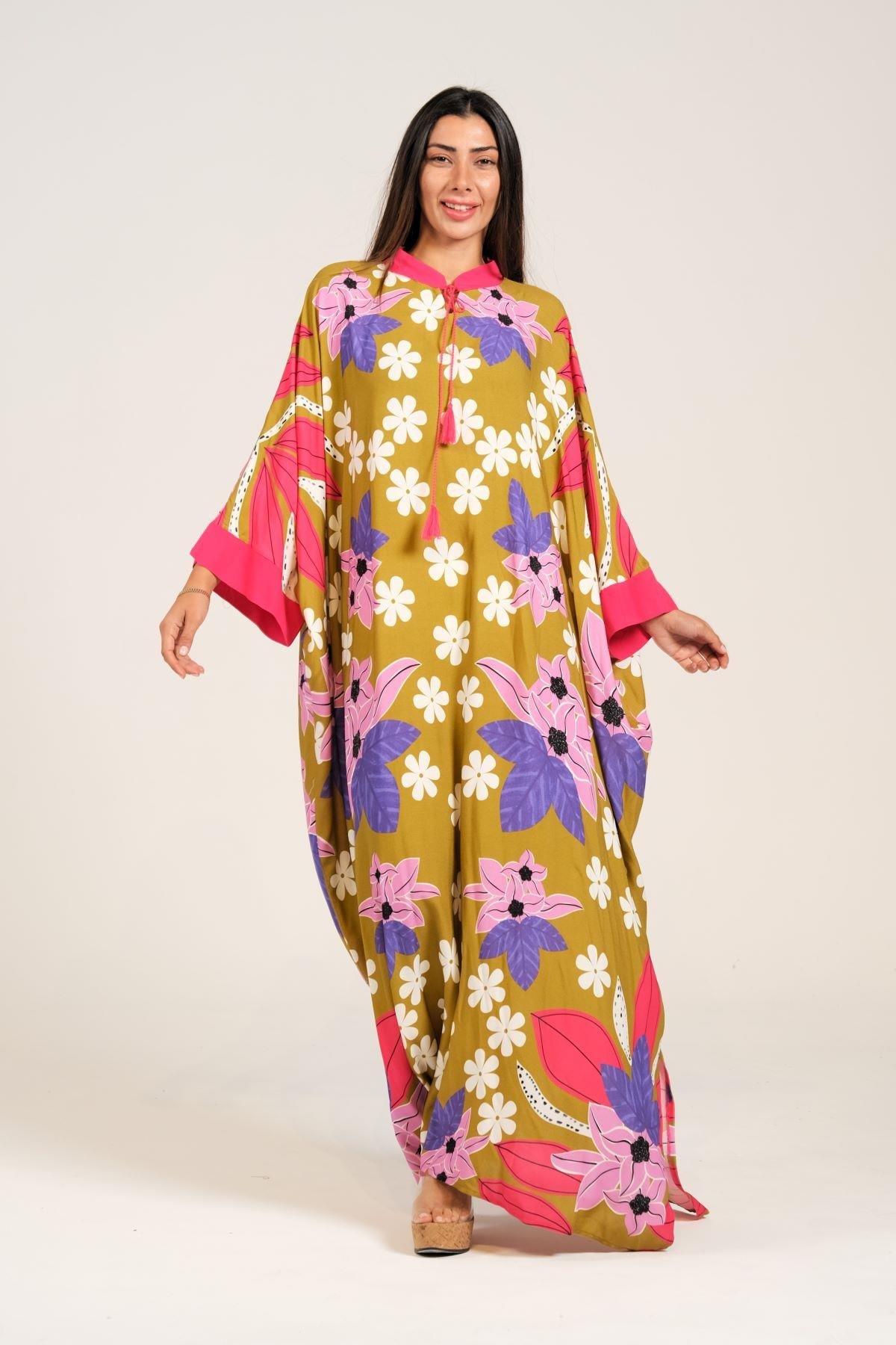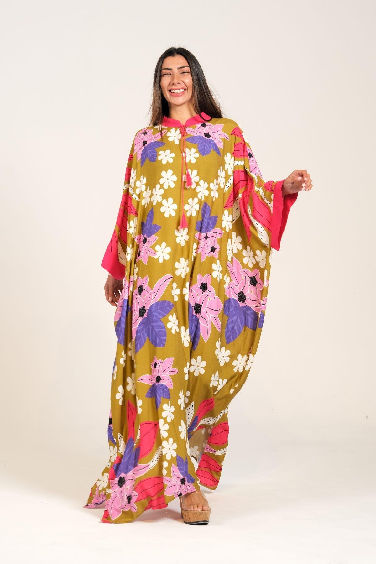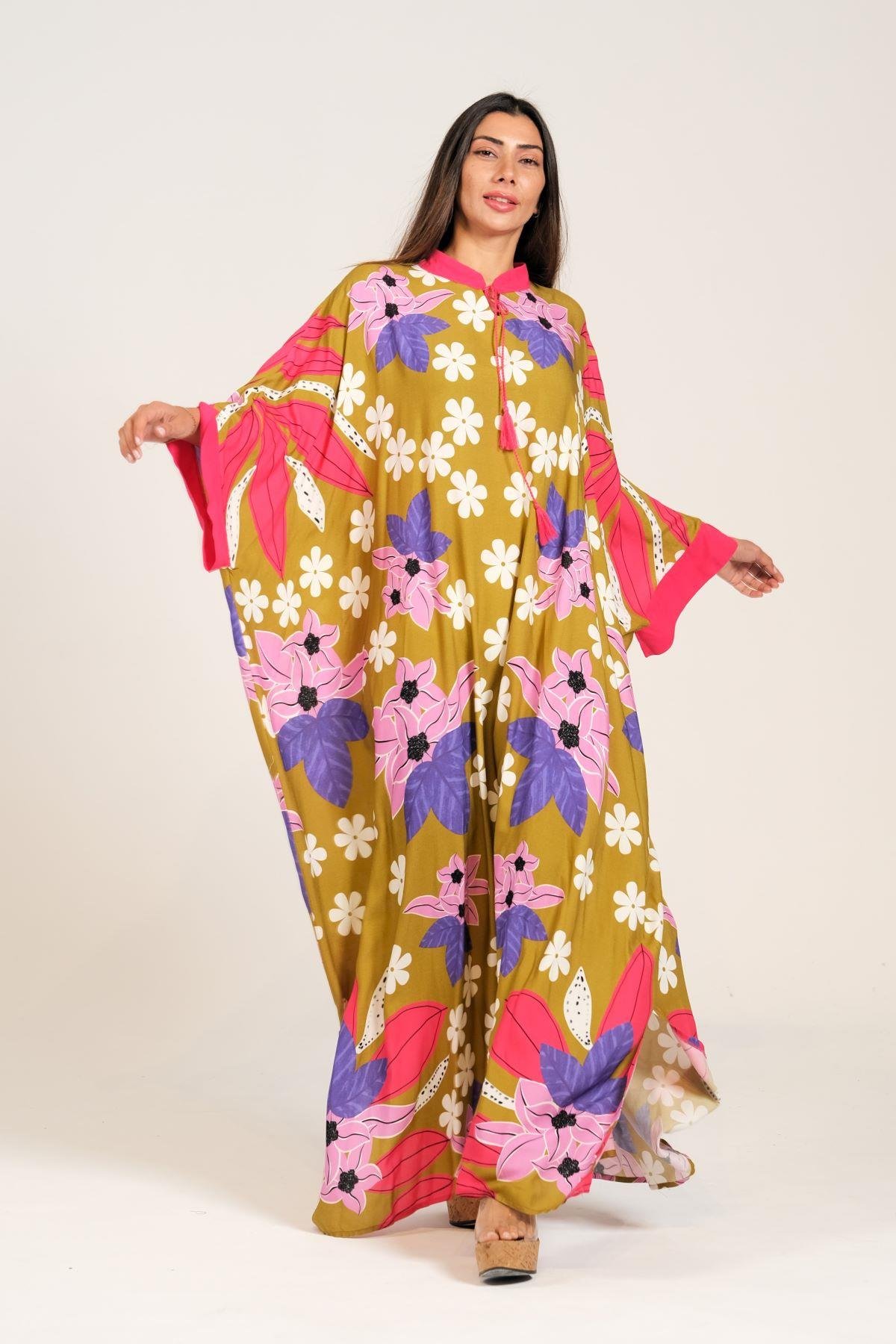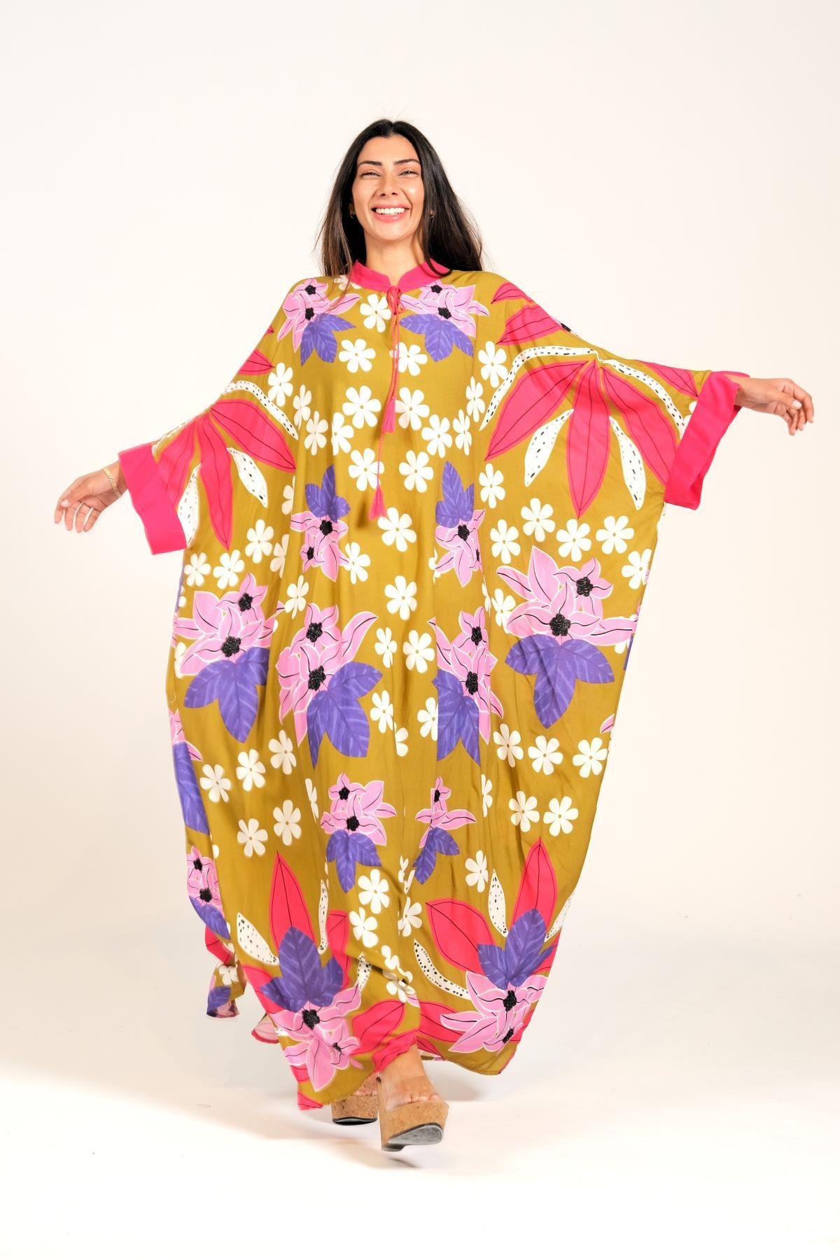 فستان طويل كبير الحجم ذو لون الخردل ومزين بنقشة الزهور وأكمام واسعة