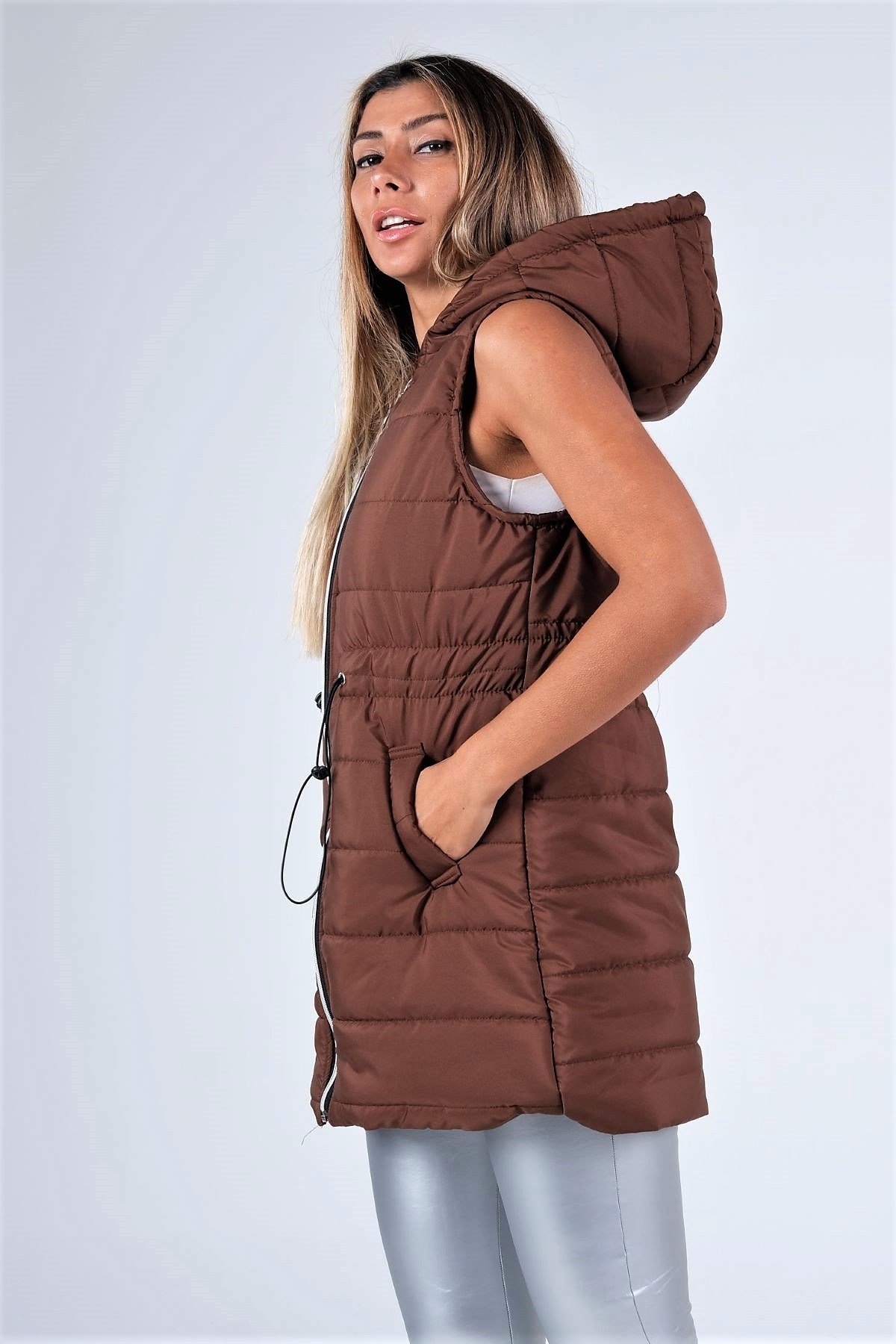 سترة منتفخة بغطاء رأس وجيوب باللون البني