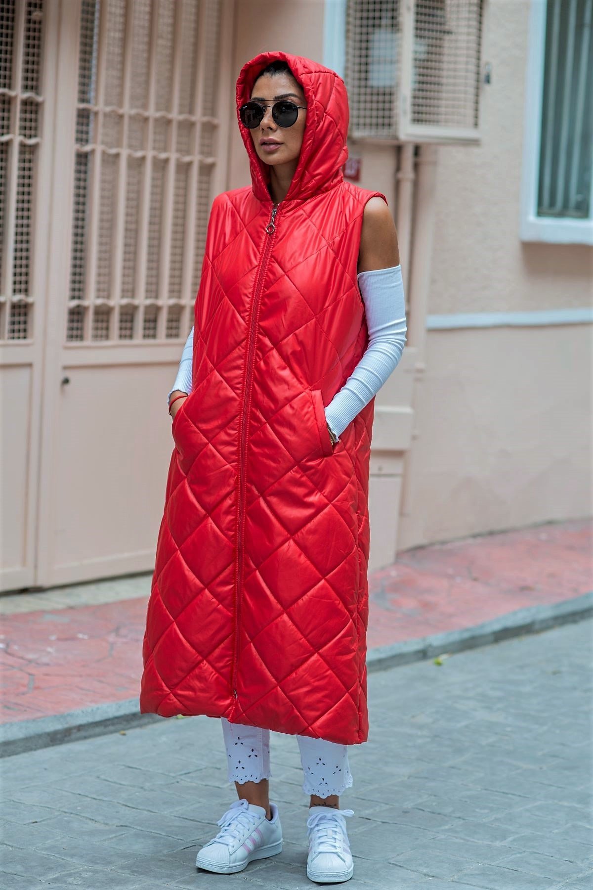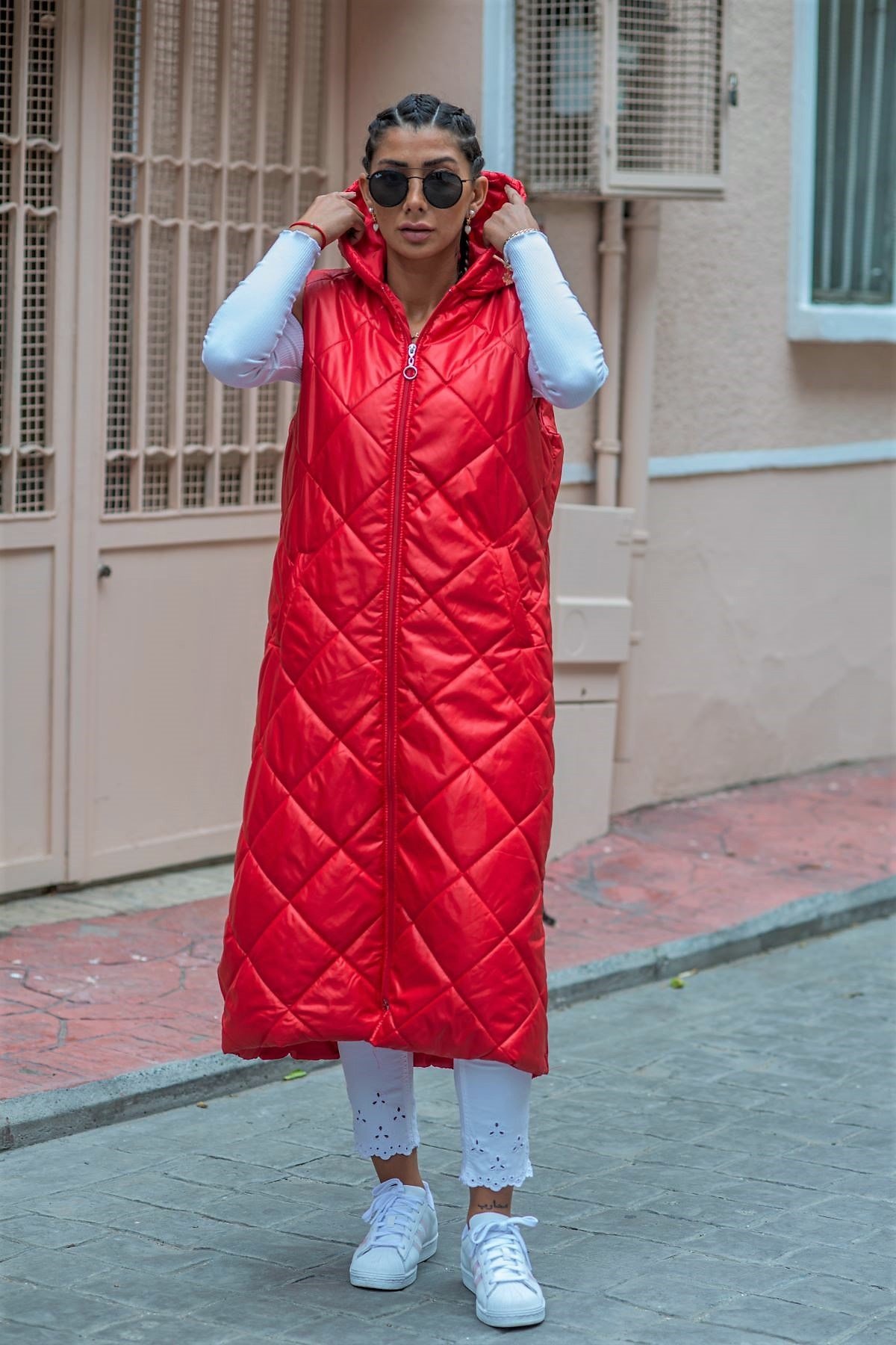 سترة منتفخة طويلة بغطاء للرأس وجيب ونمط ماسي باللون الأحمر