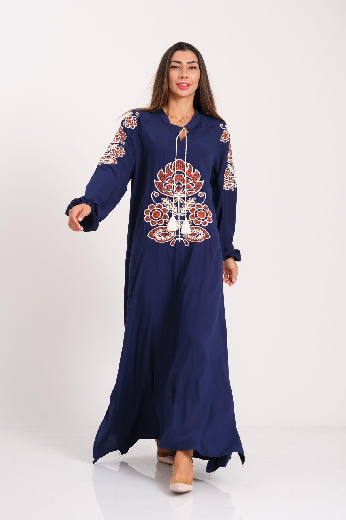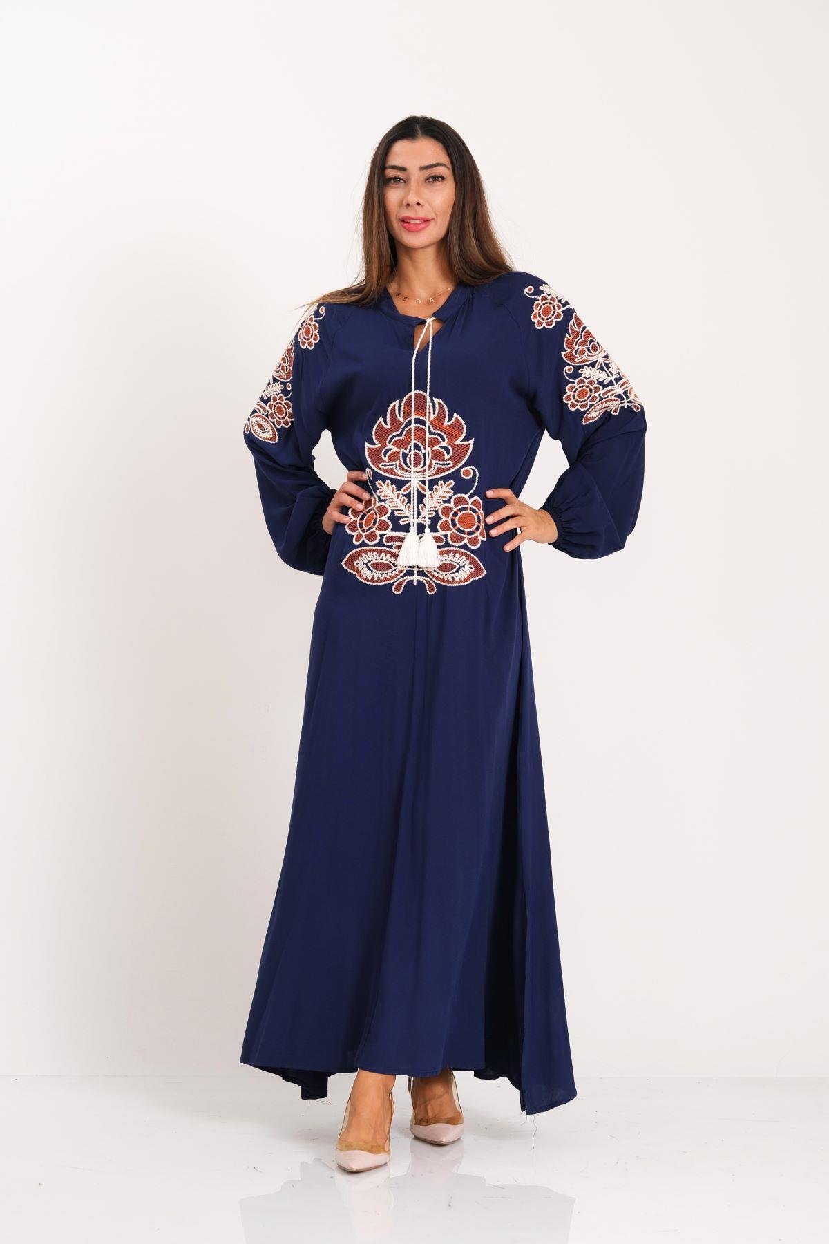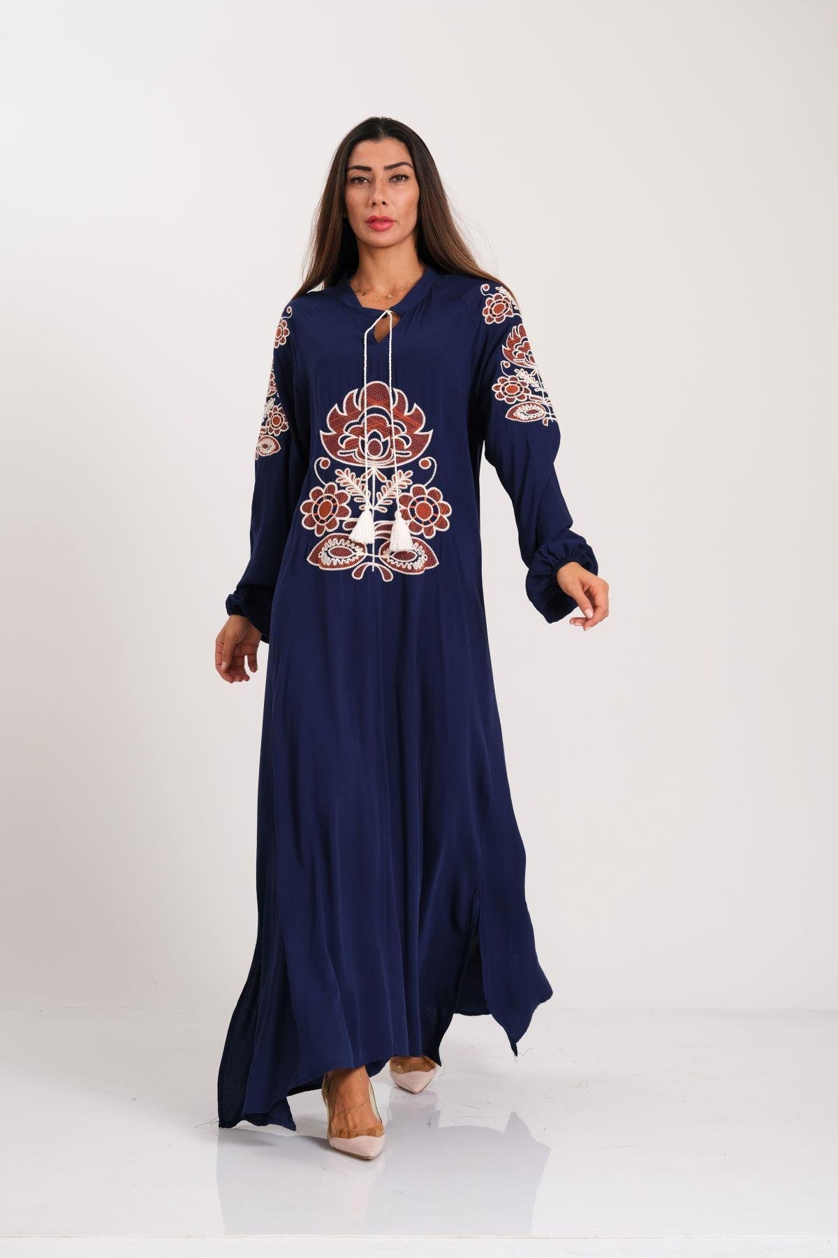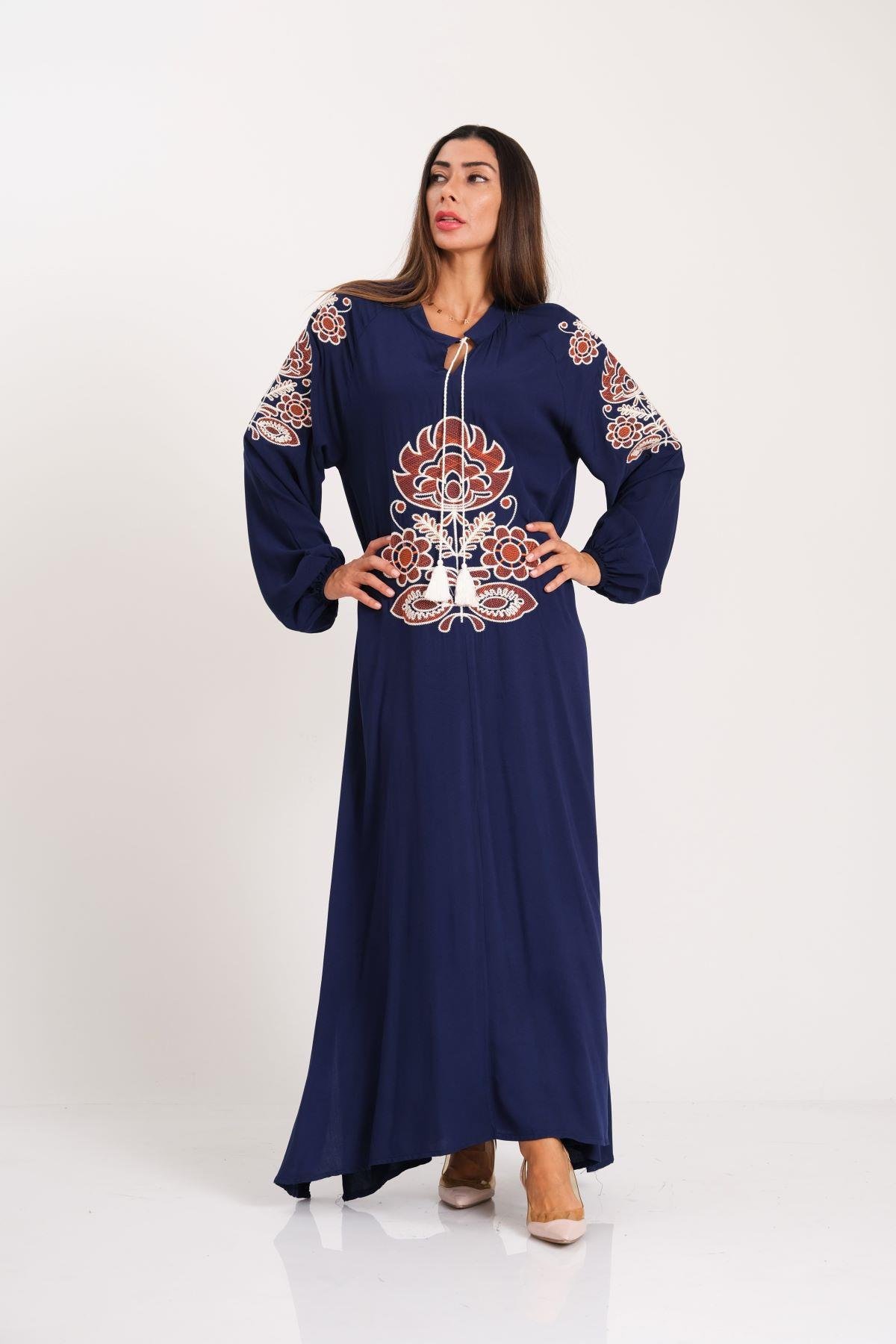 فستان طويل بأكمام بالون باللون الأزرق الداكن مع تطريز أصلي على الجهة الأمامية والأكمام