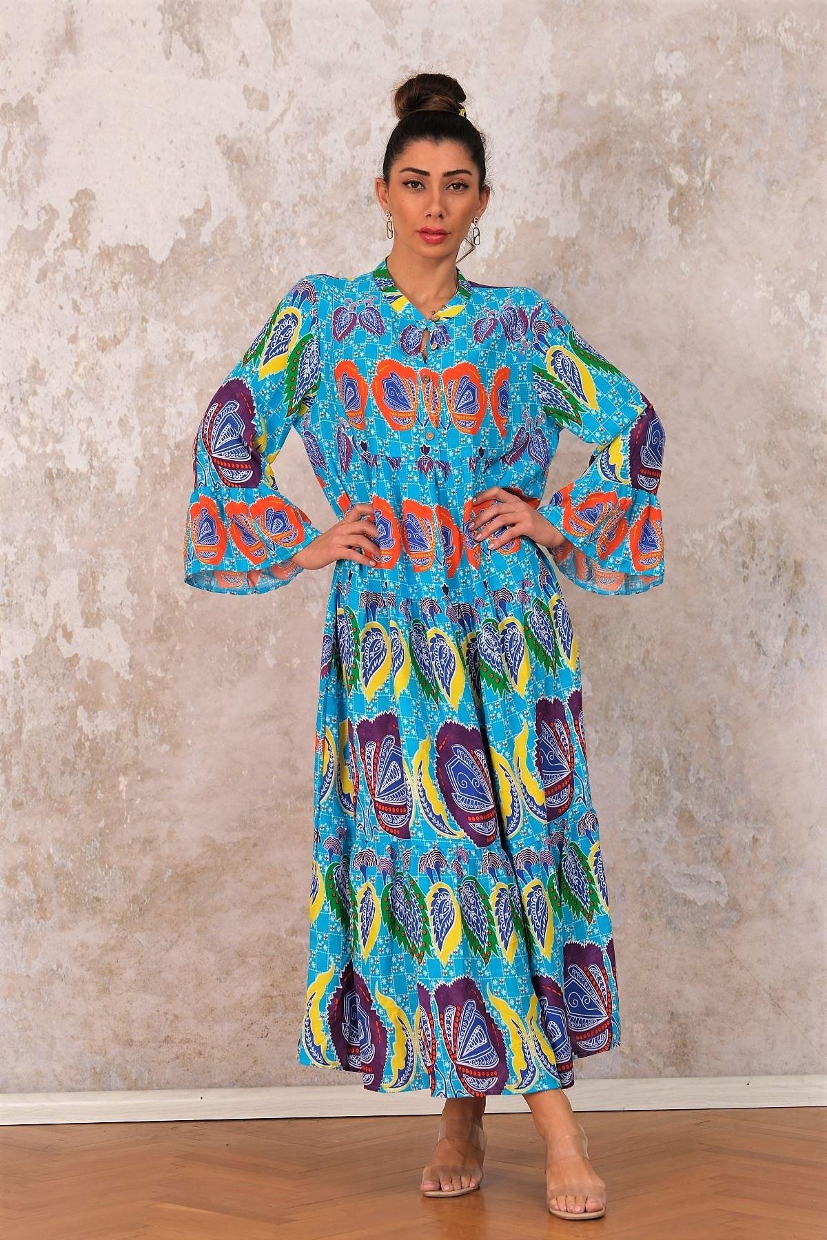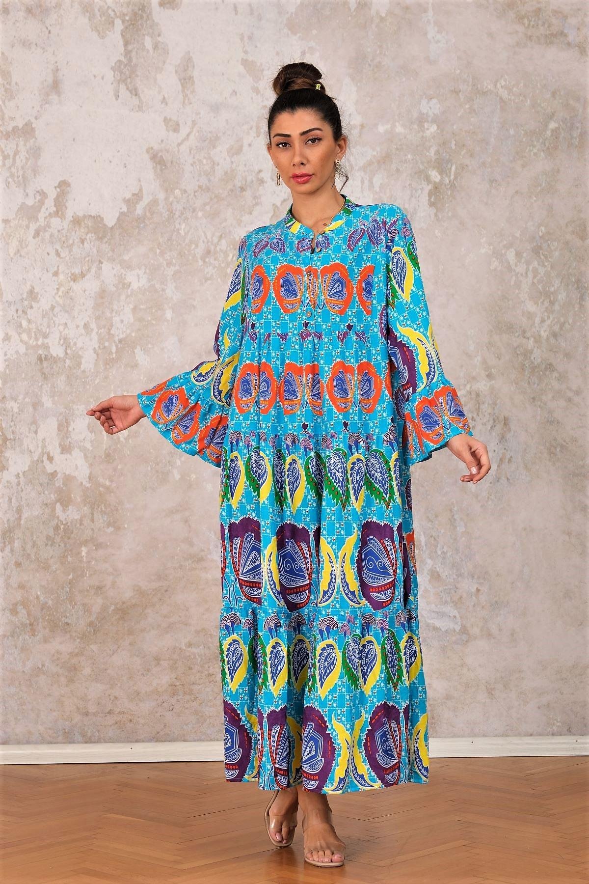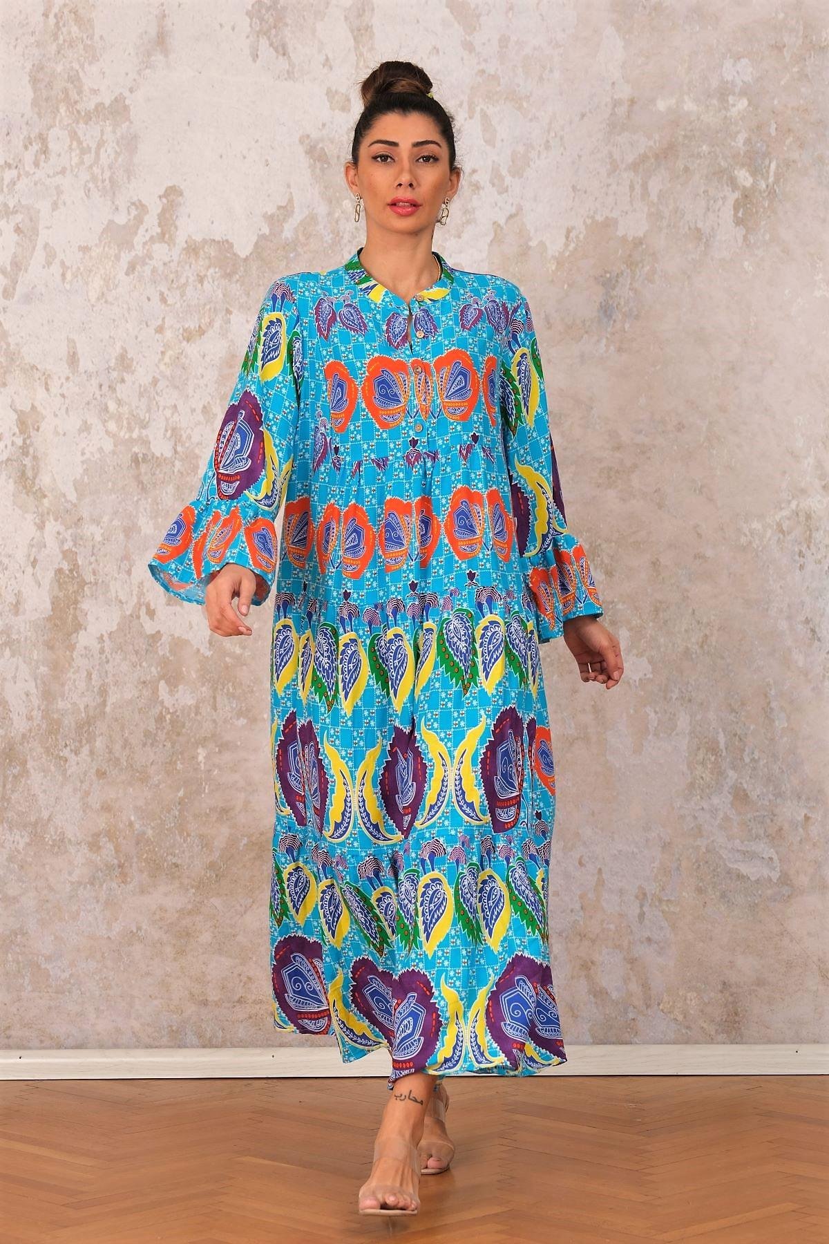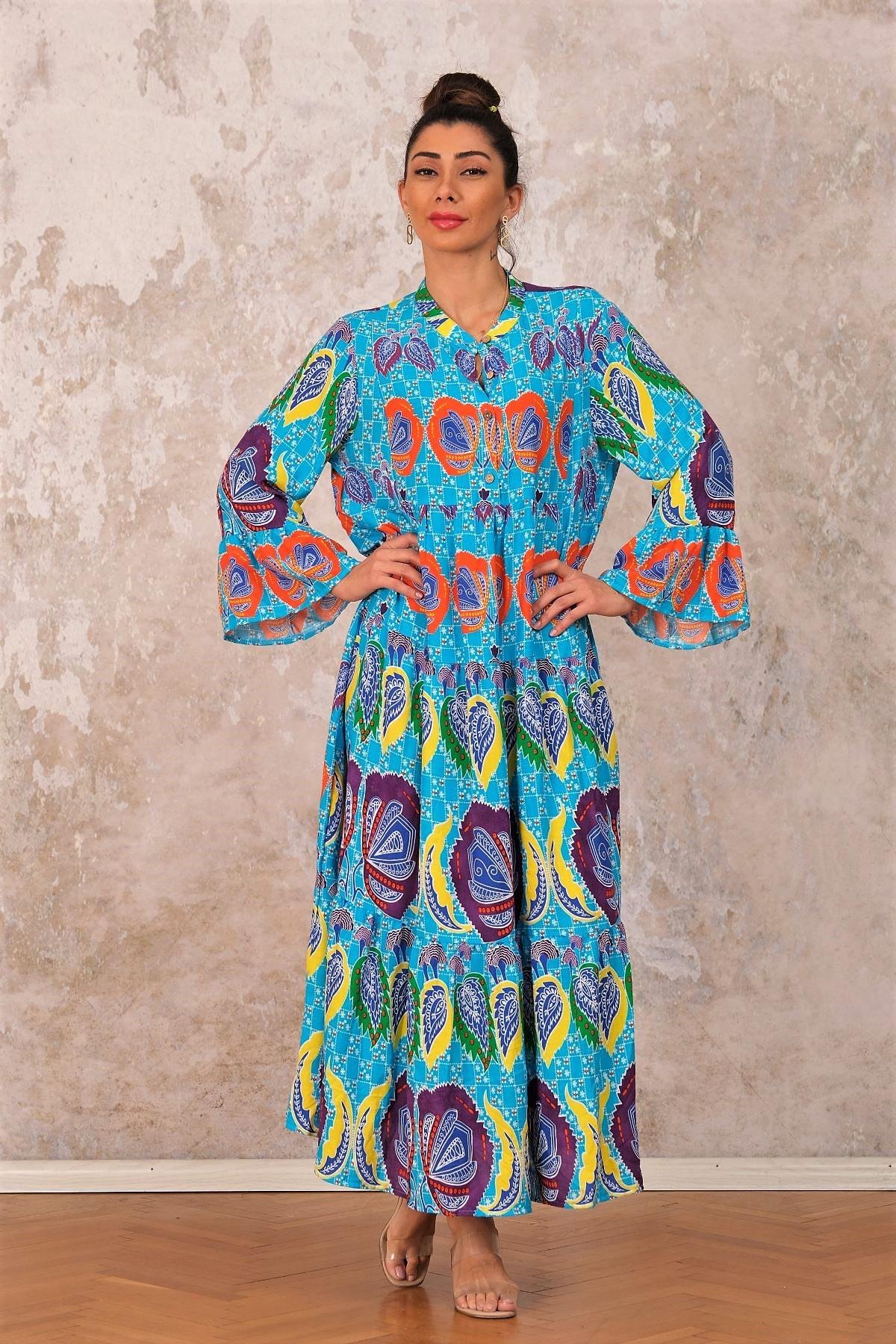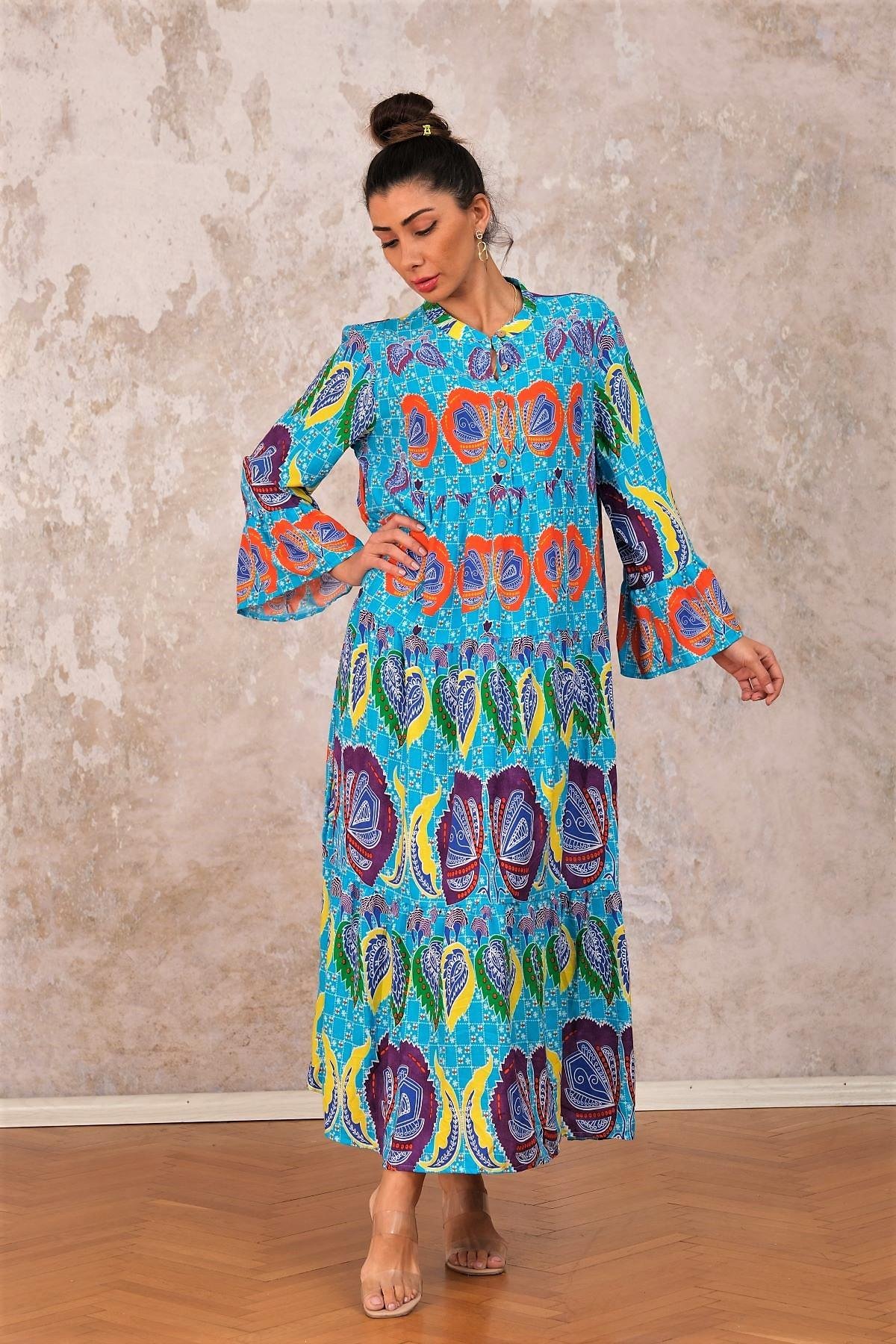 فستان طويل أزرق بأكمام منتفخة وأزرار أمامية وطبقات منقوش استوائي