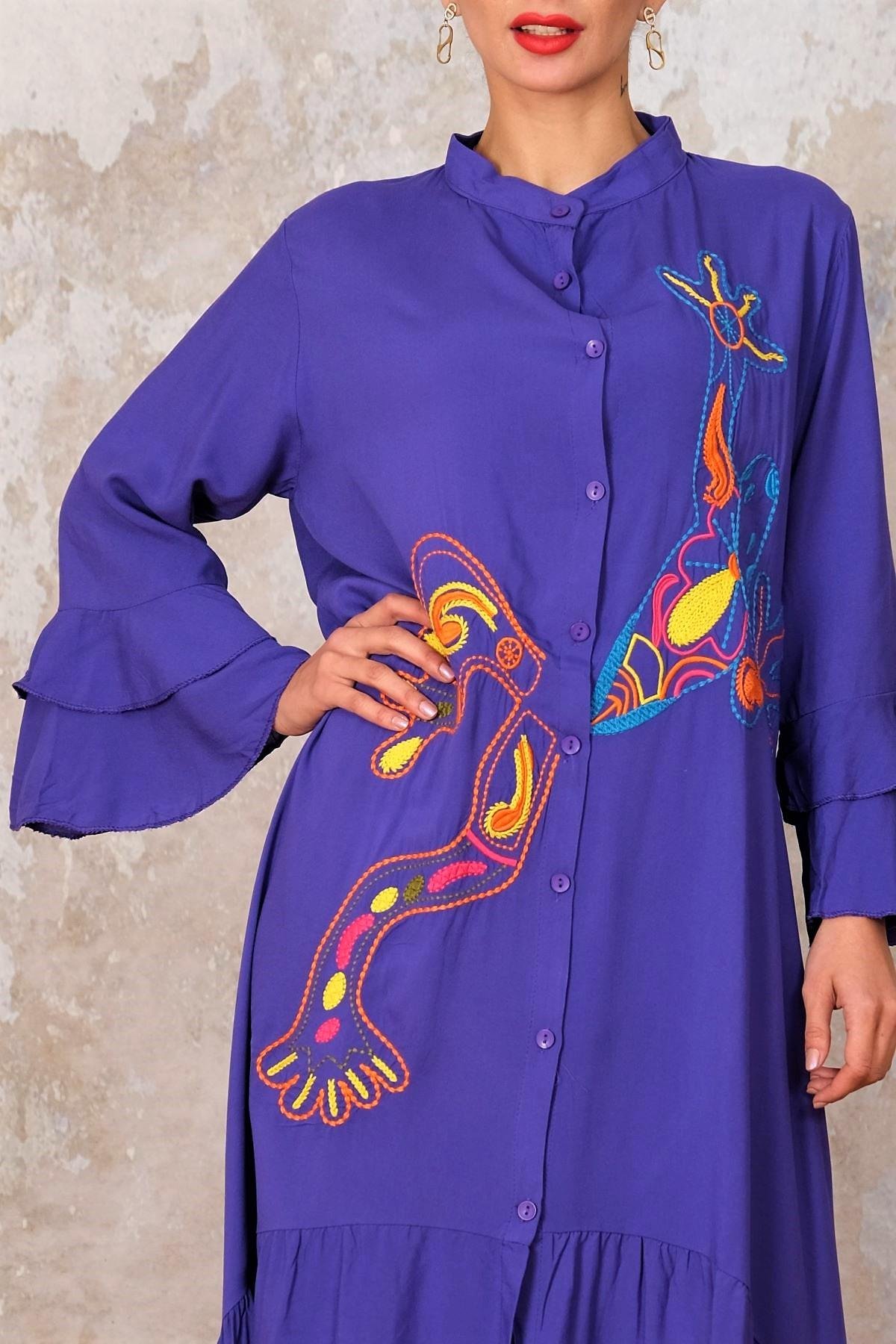 فستان طويل كبير الحجم بأكمام بياقة عالية باللون الأرجواني وحاشية مكشكشة، وجيب مطرز