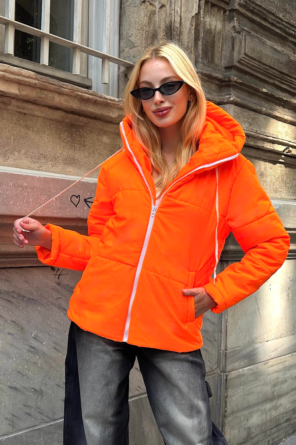 سترة منتفخة مقاومة للماء باللون البرتقالي النيون