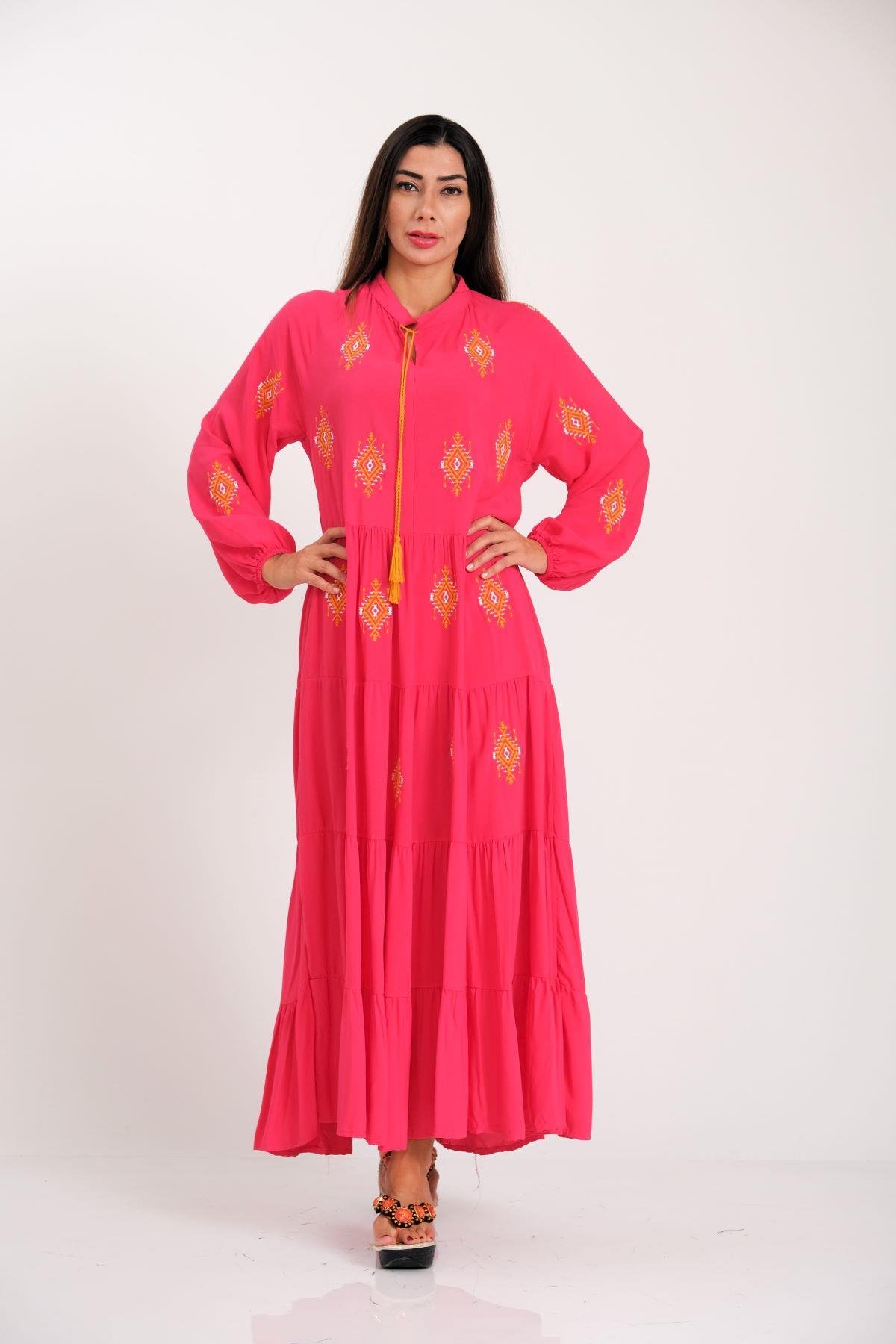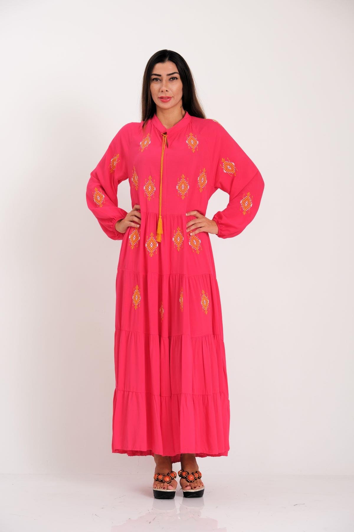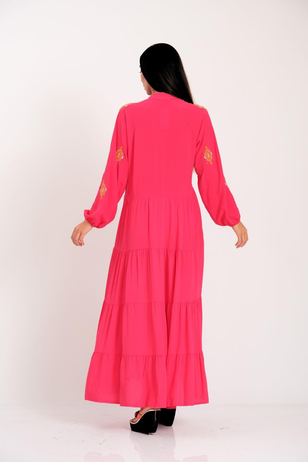 فستان طويل مطرز من الأمام والأكمام باللون الوردي مع تنورة ذات طبقات