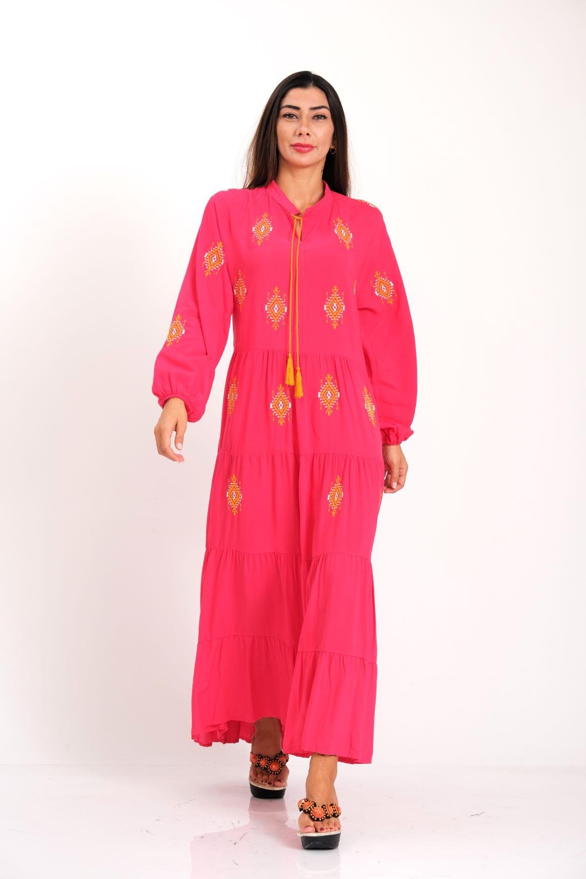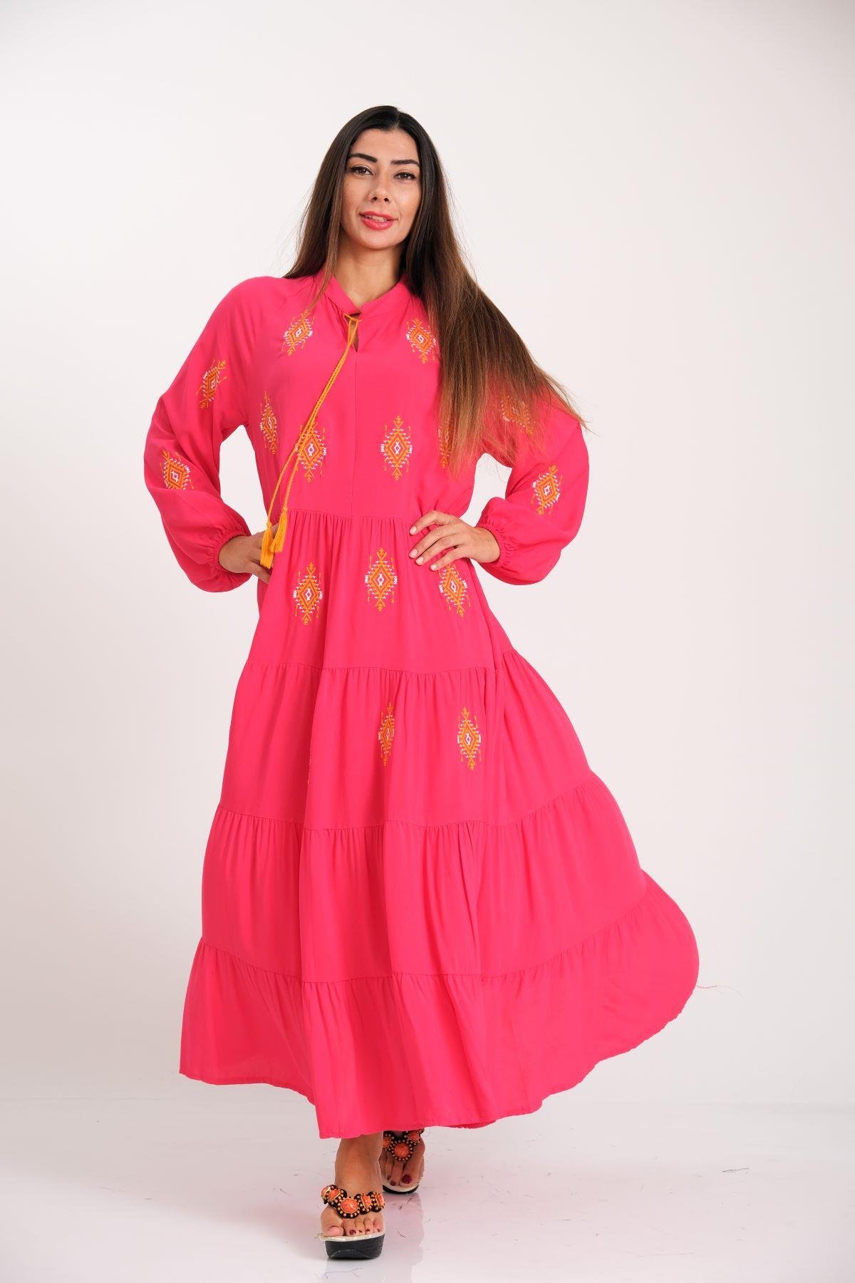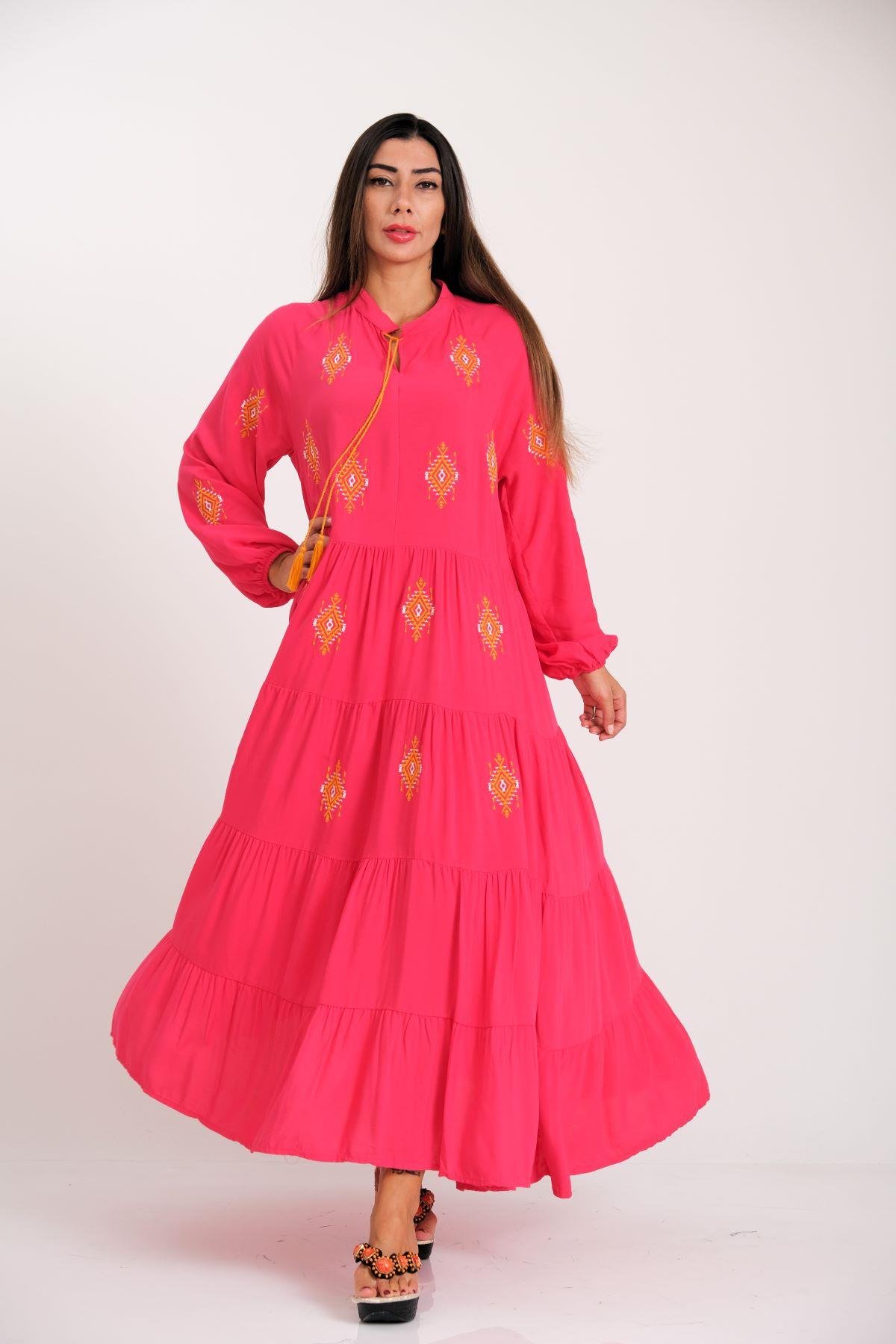 فستان طويل مطرز من الأمام والأكمام باللون الوردي مع تنورة ذات طبقات