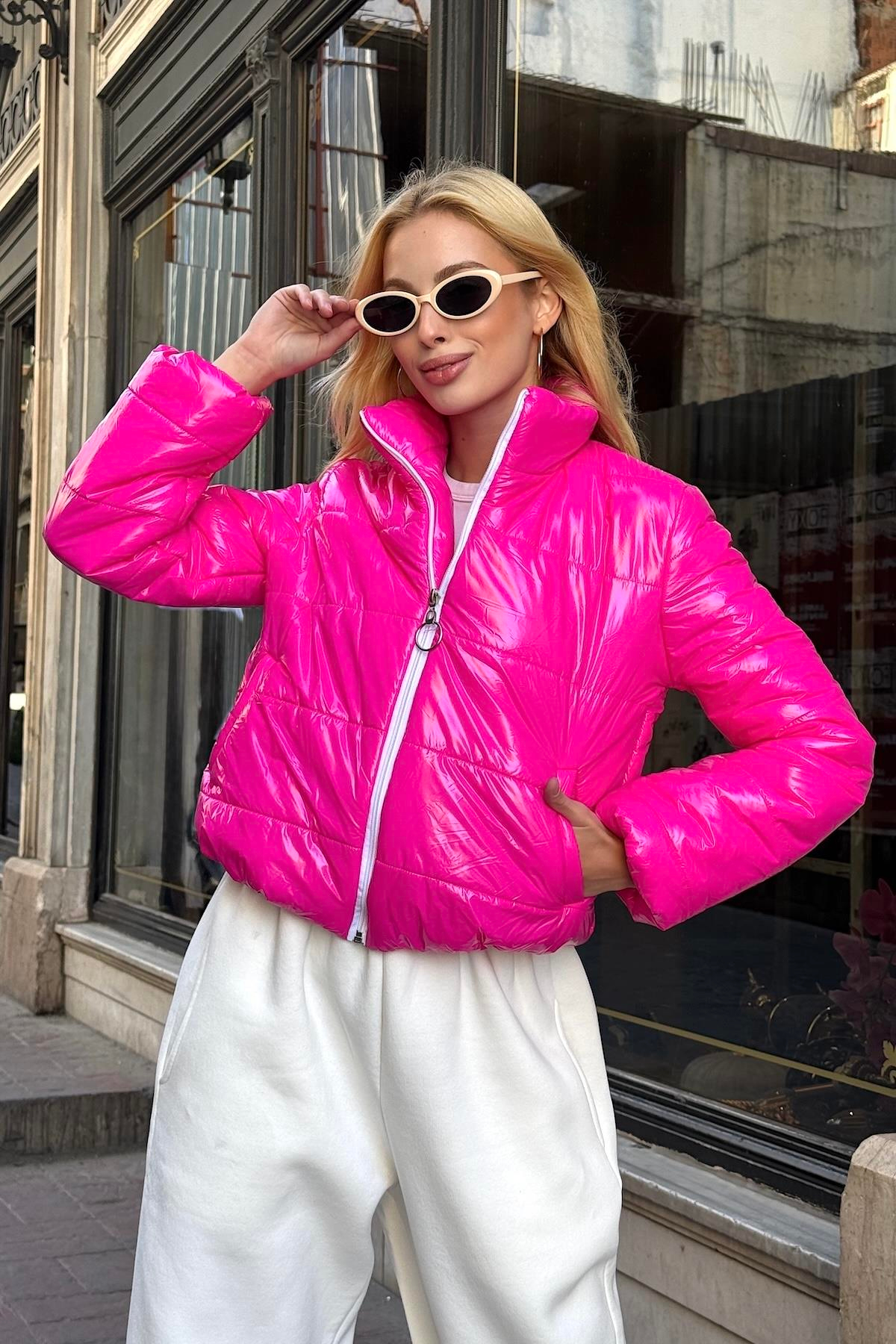 سترة منتفخة قصيرة وردية اللون لامعة طاردة للماء