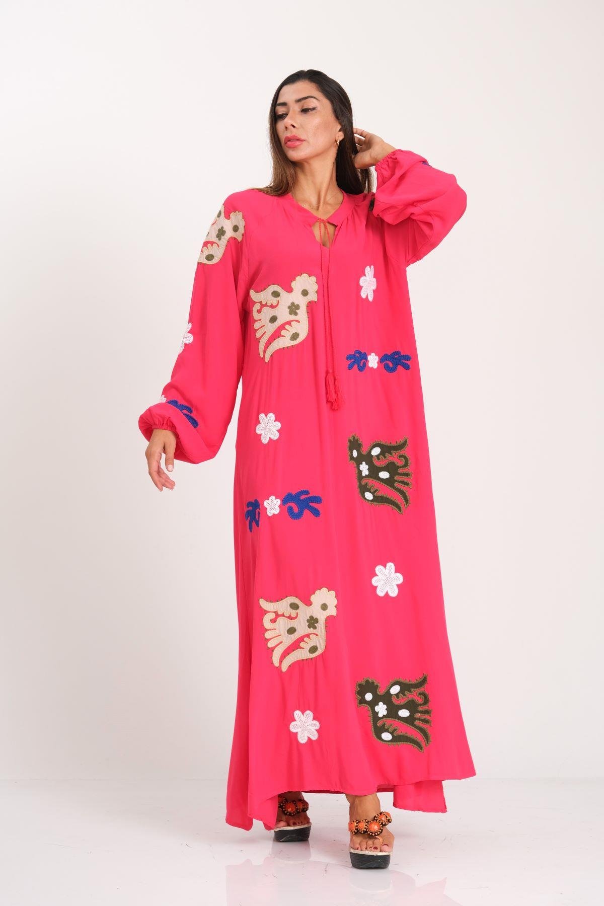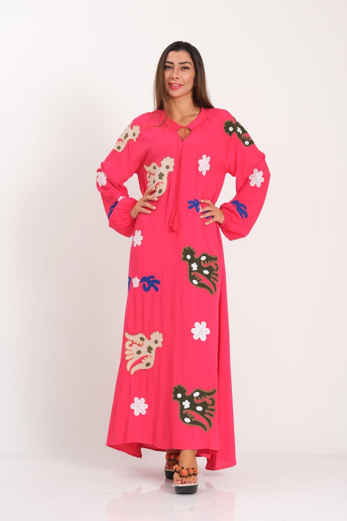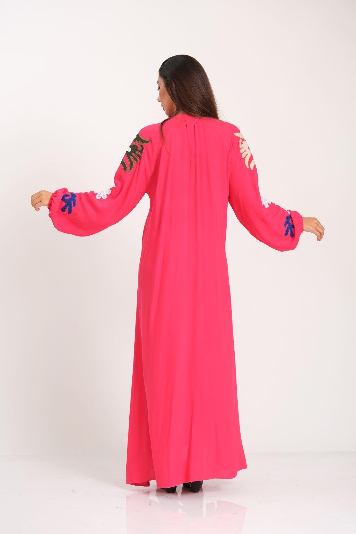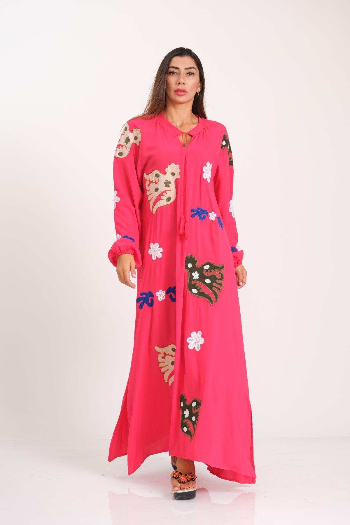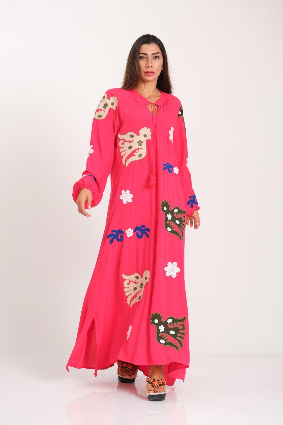 فستان طويل وردي اللون بياقة دائرية وأكمام طويلة ومطرز بشراشيب