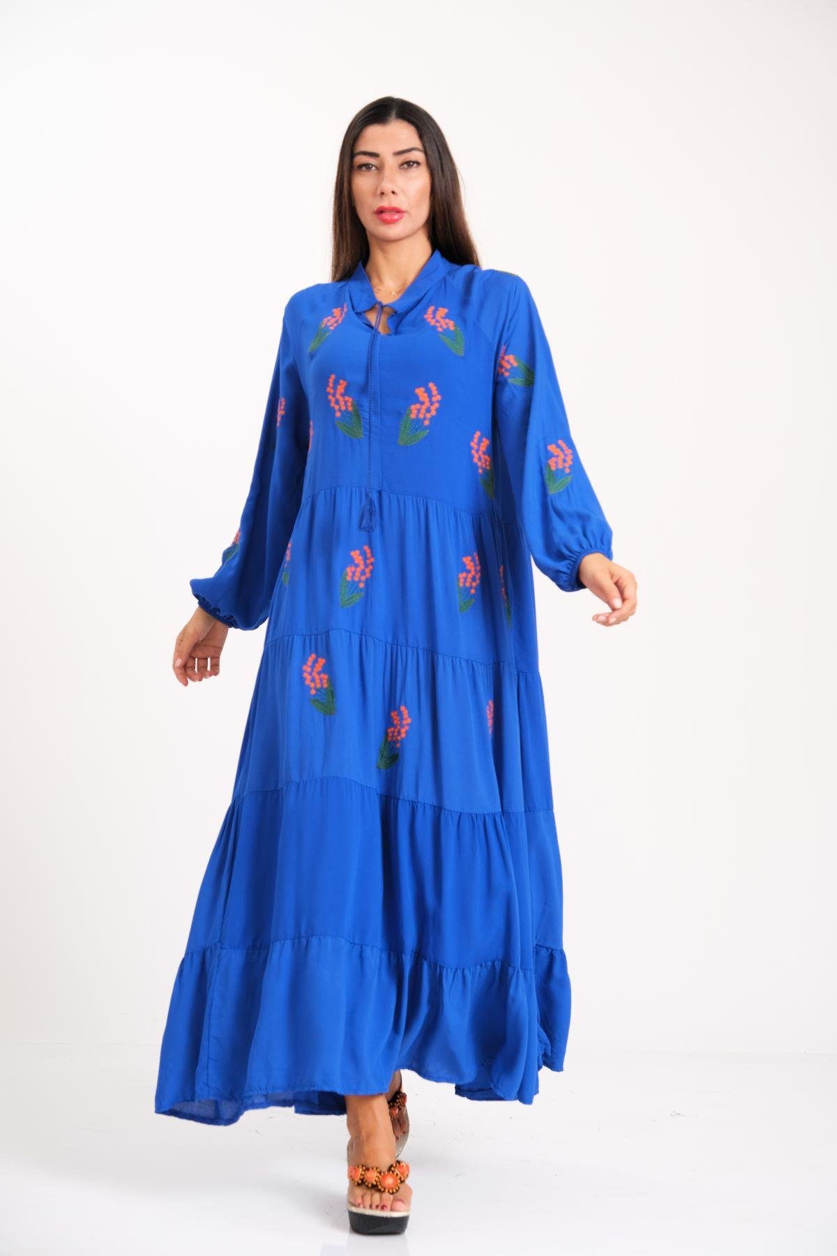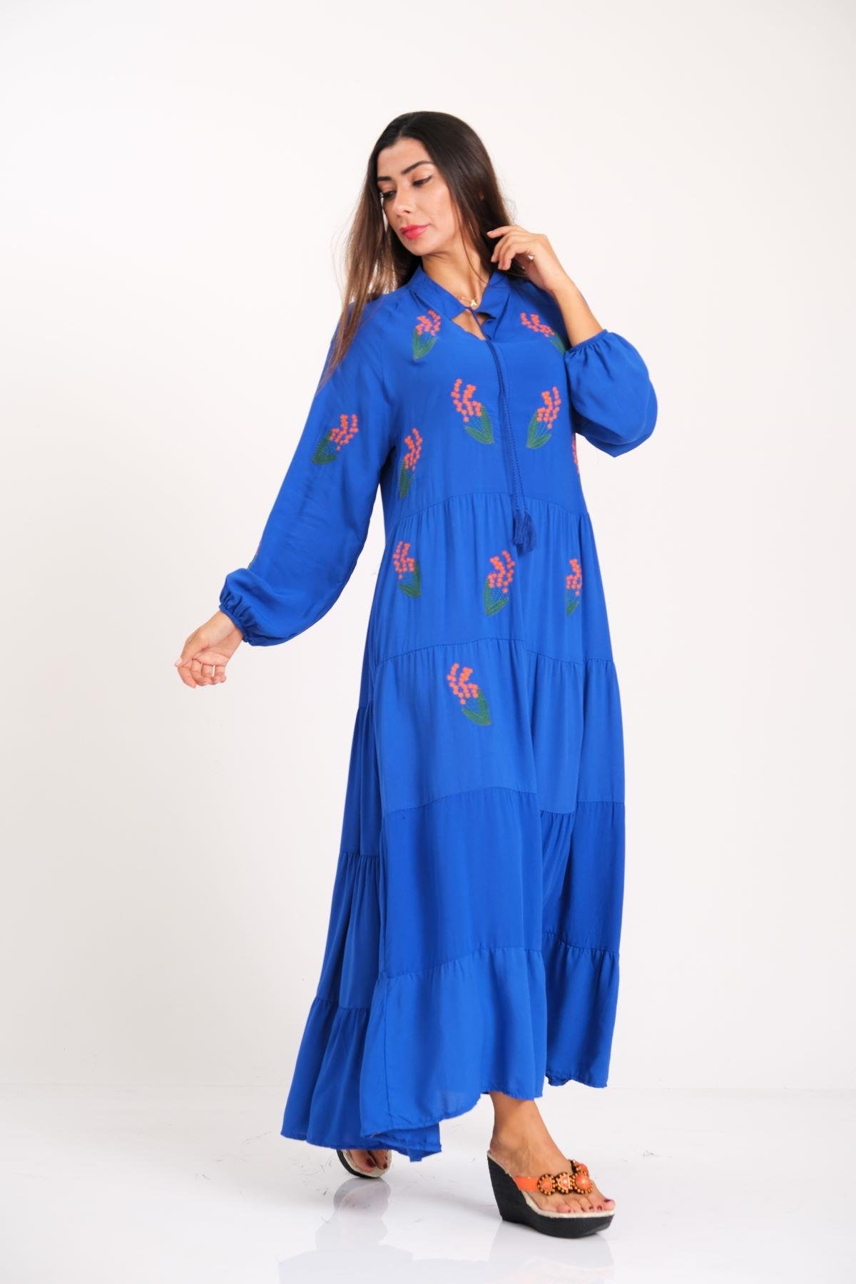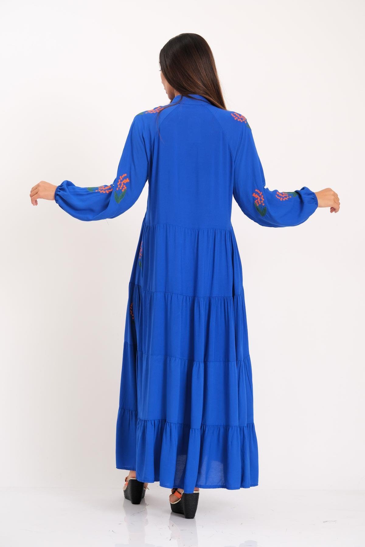 فستان طويل باللون الأزرق الساكس مع تطريز الزهور على الجهة الأمامية والأكمام وتنورة ذات طبقات