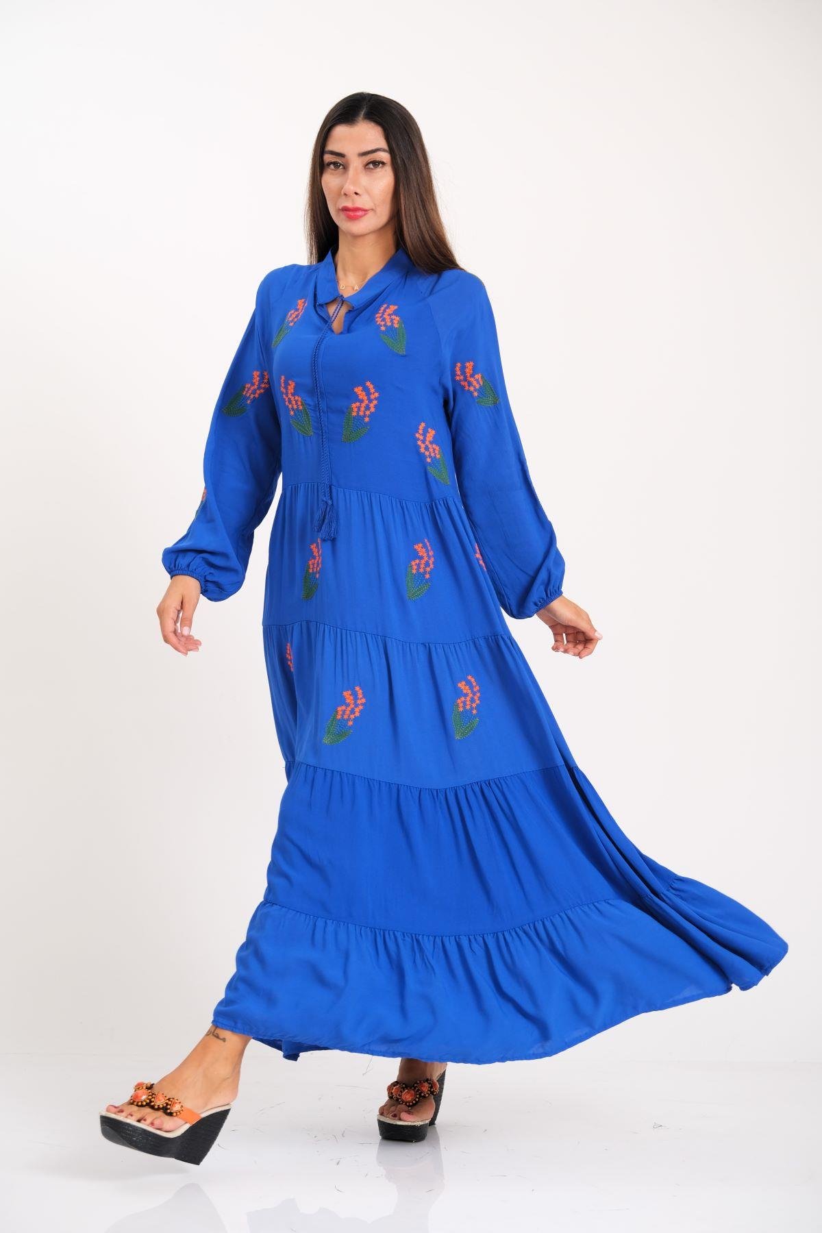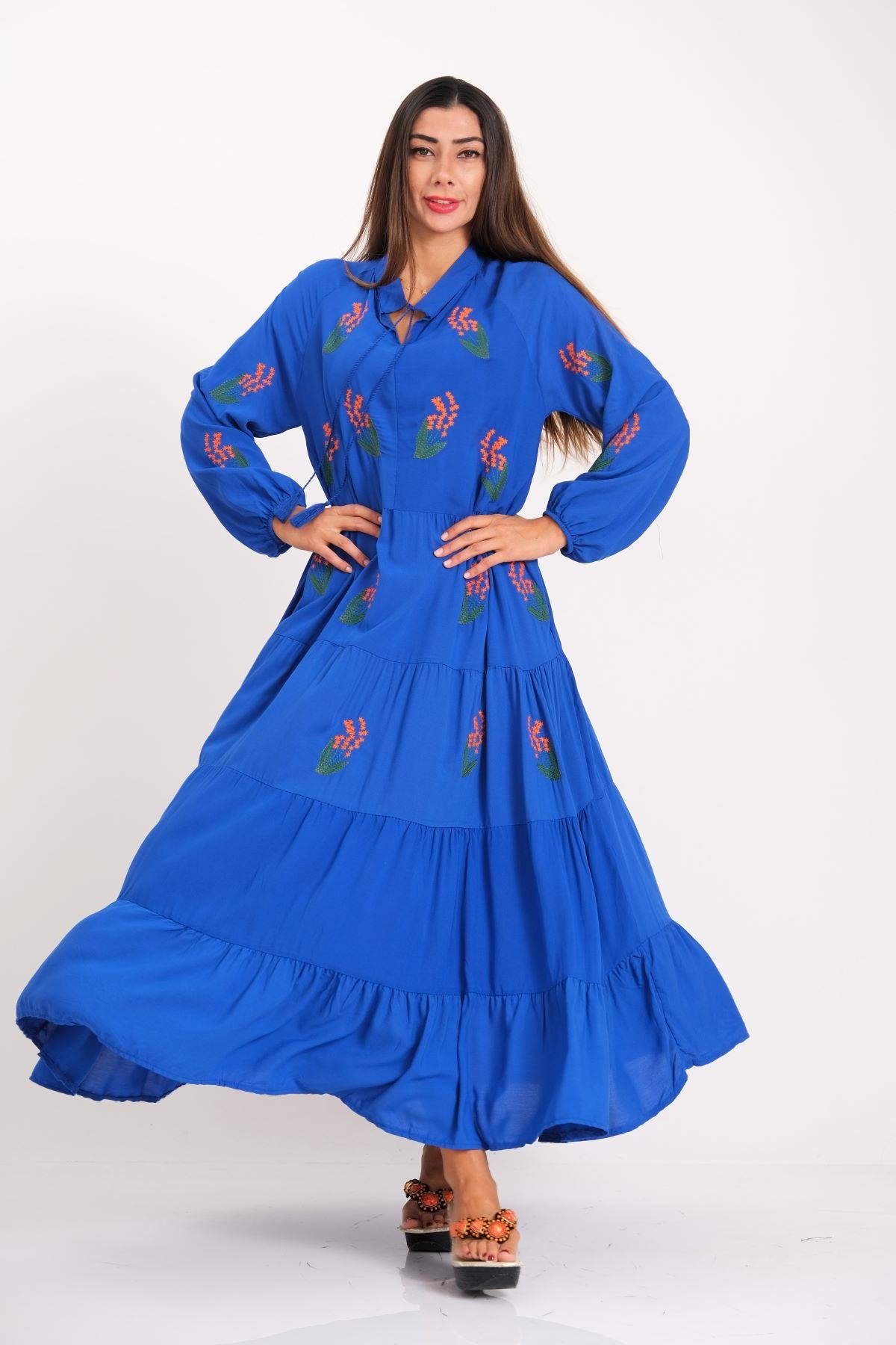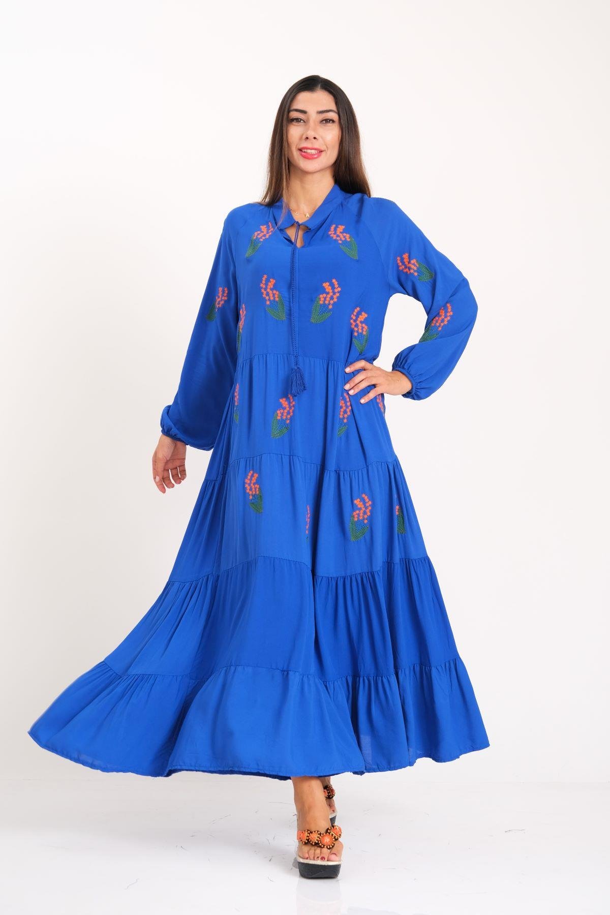 فستان طويل باللون الأزرق الساكس مع تطريز الزهور على الجهة الأمامية والأكمام وتنورة ذات طبقات