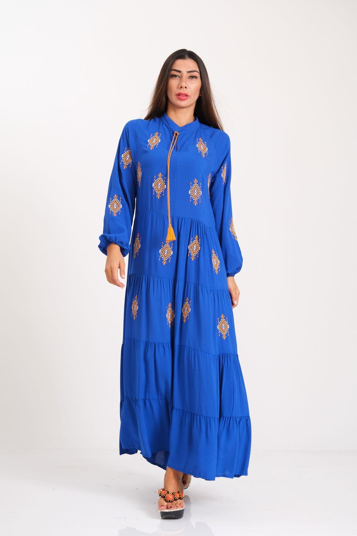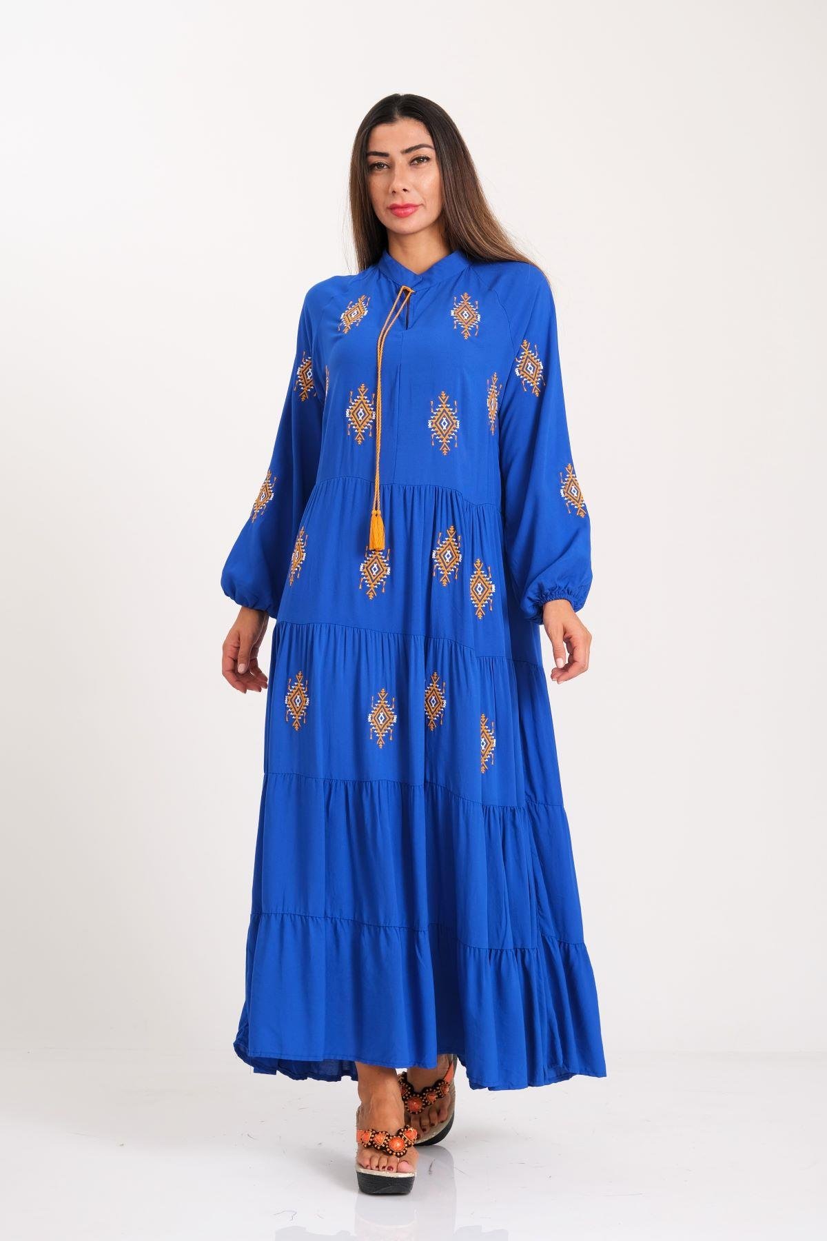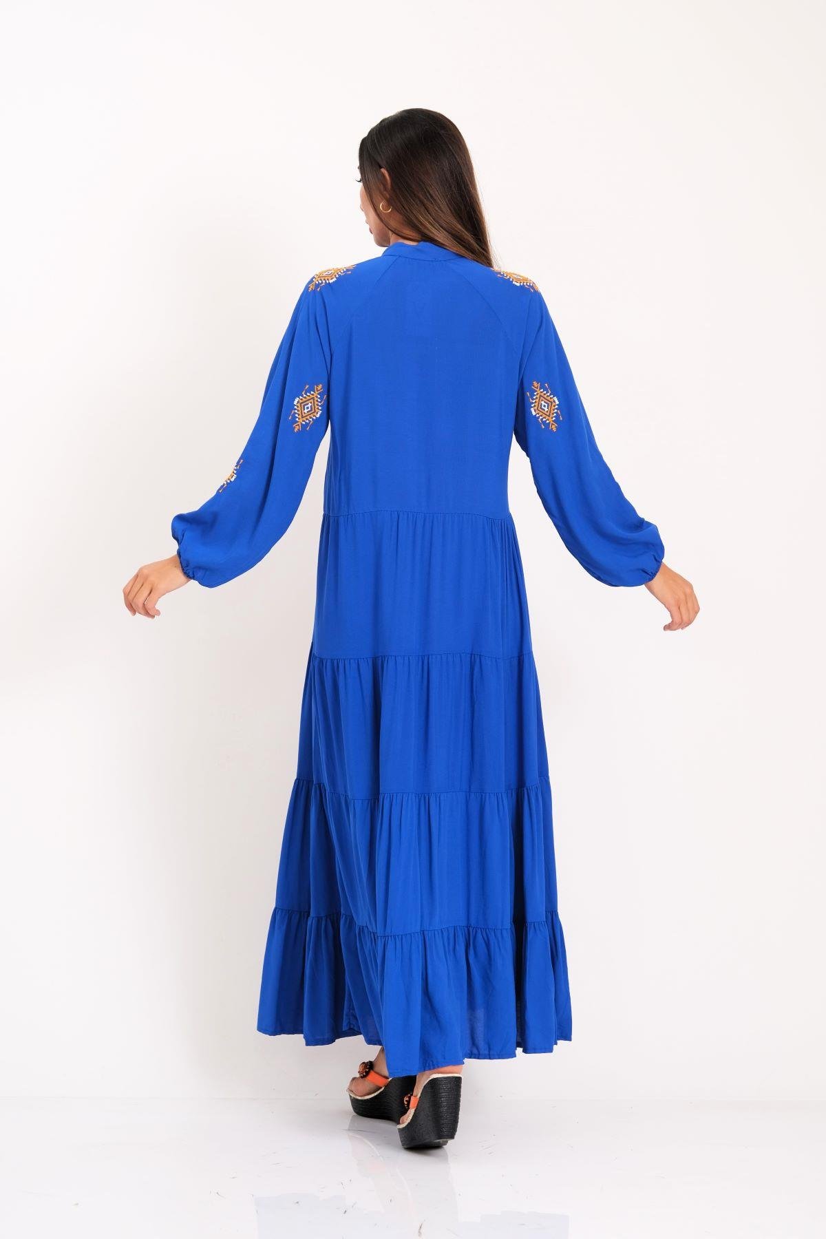 فستان طويل باللون الأزرق الساكس مع تطريز أصلي على الجهة الأمامية والأكمام وتنورة ذات طبقات