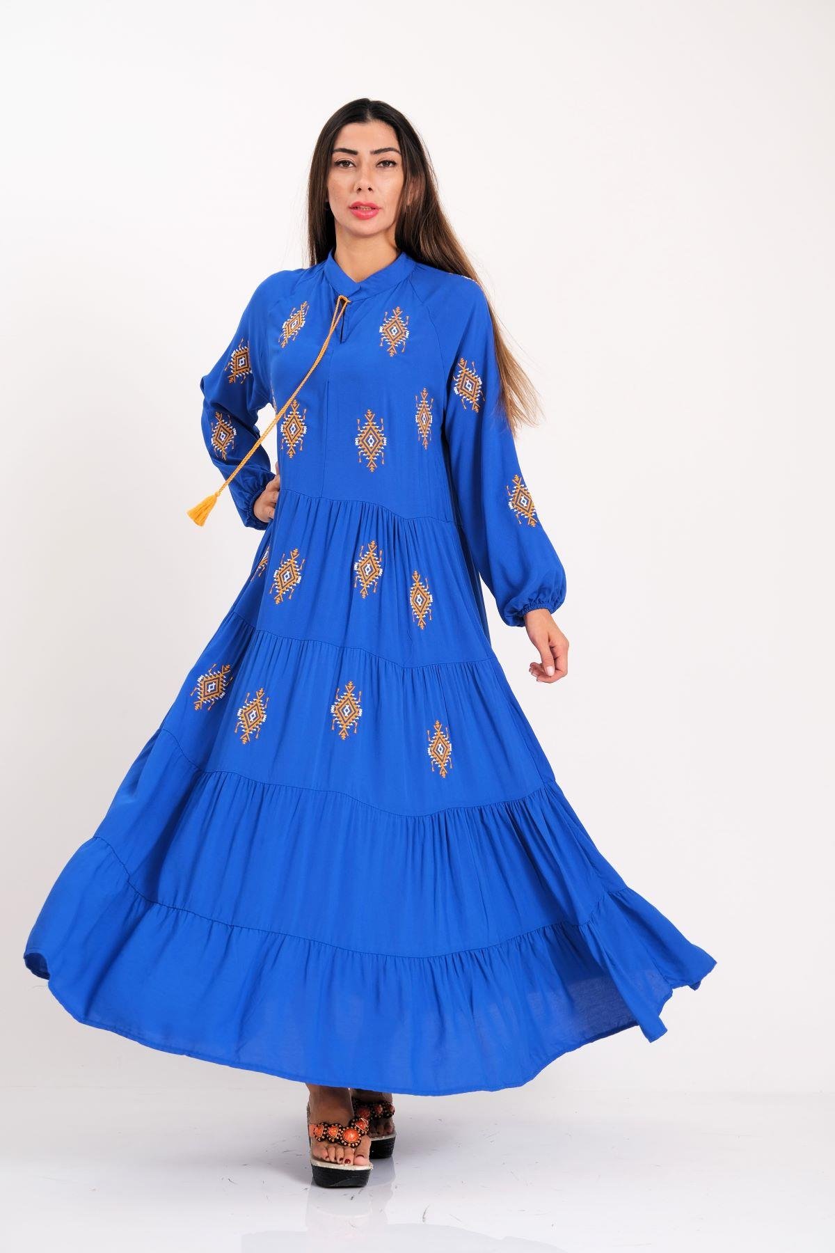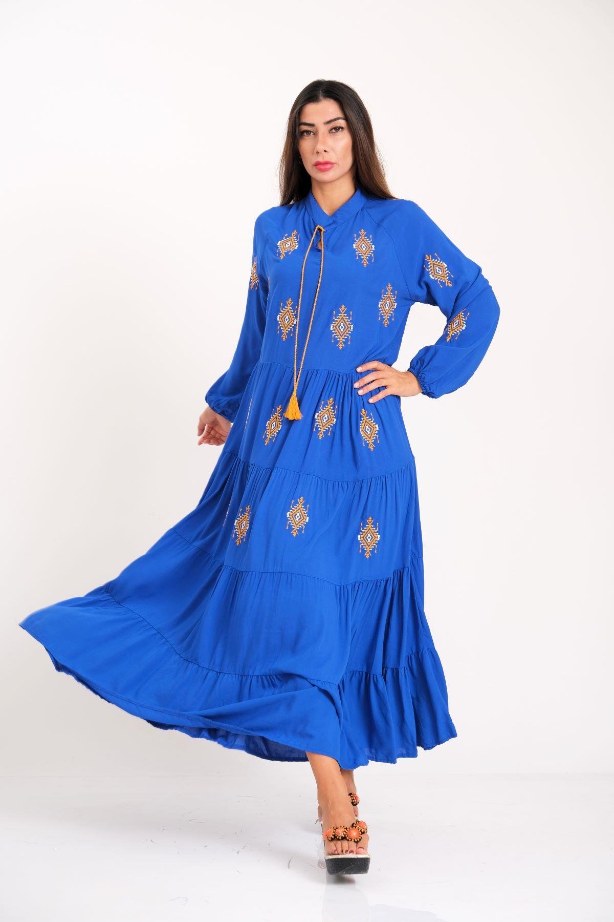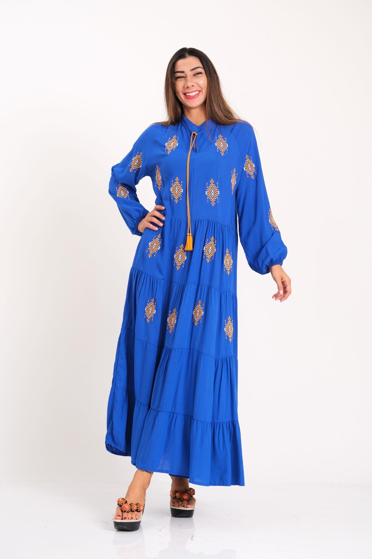 فستان طويل باللون الأزرق الساكس مع تطريز أصلي على الجهة الأمامية والأكمام وتنورة ذات طبقات