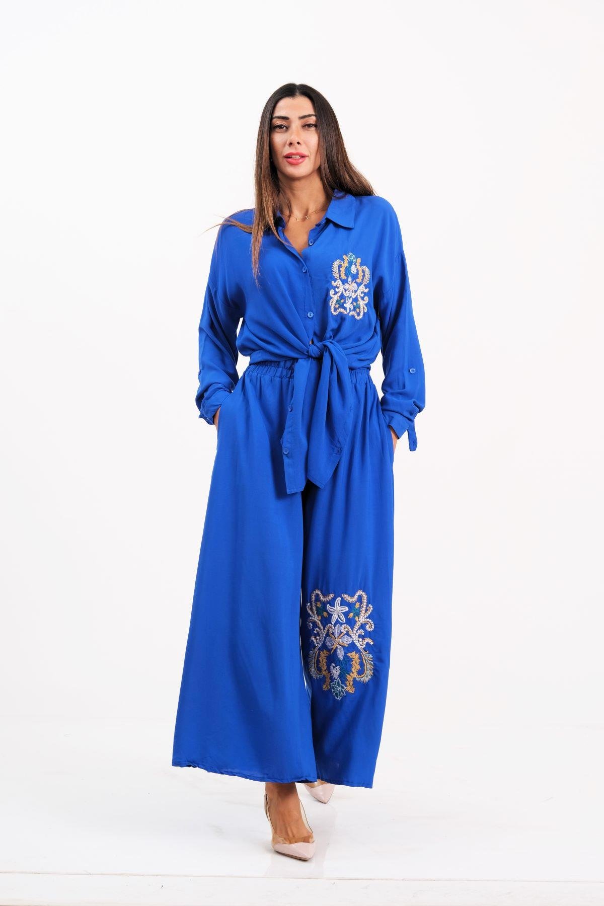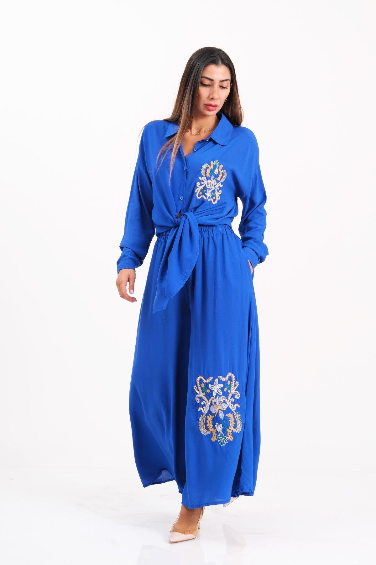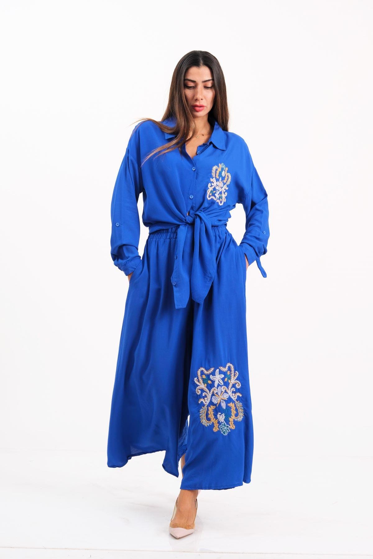 طقم قميص وبنطلون أزرق ساكس مطرز من الأمام والخلف مع كتاف على الأكمام