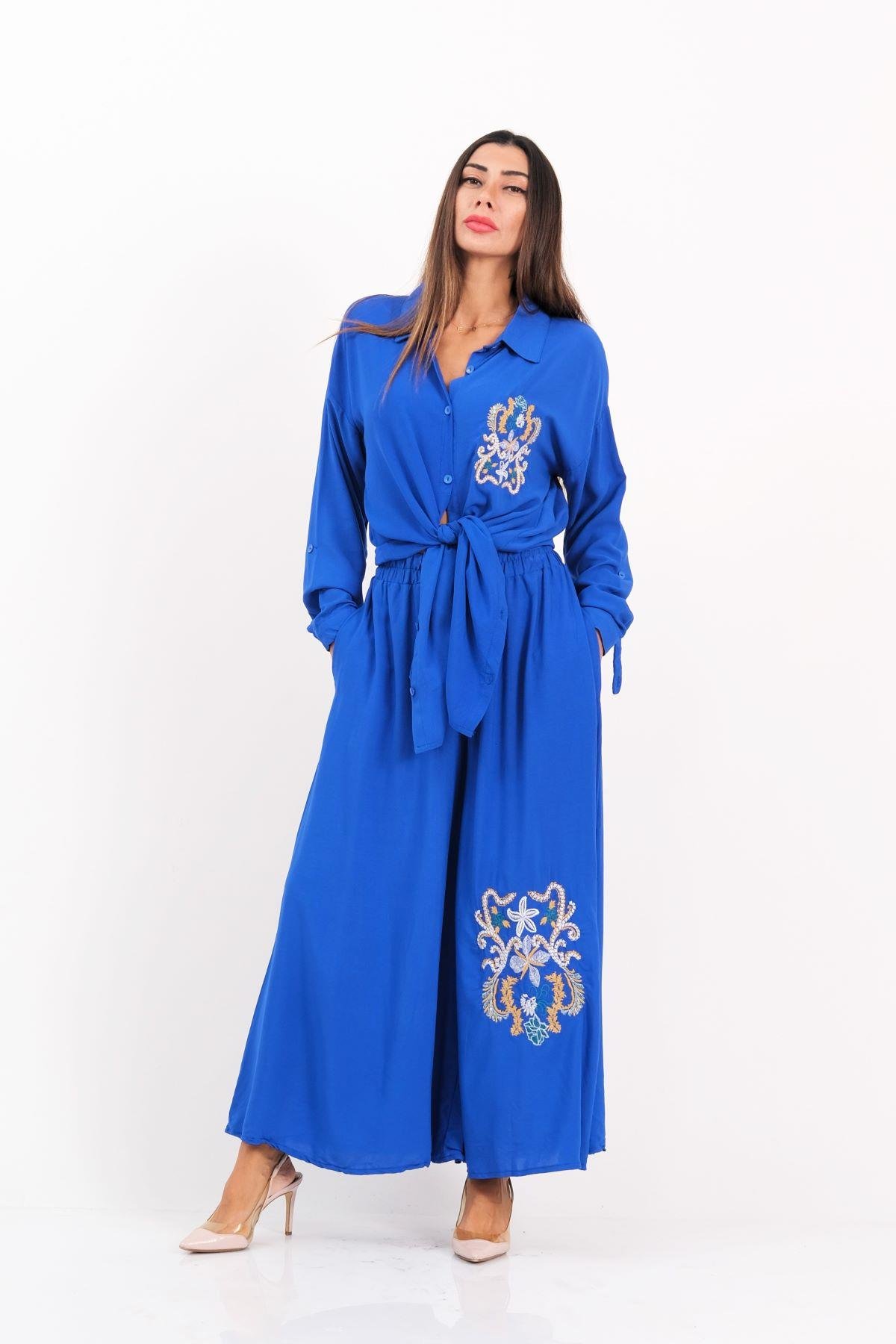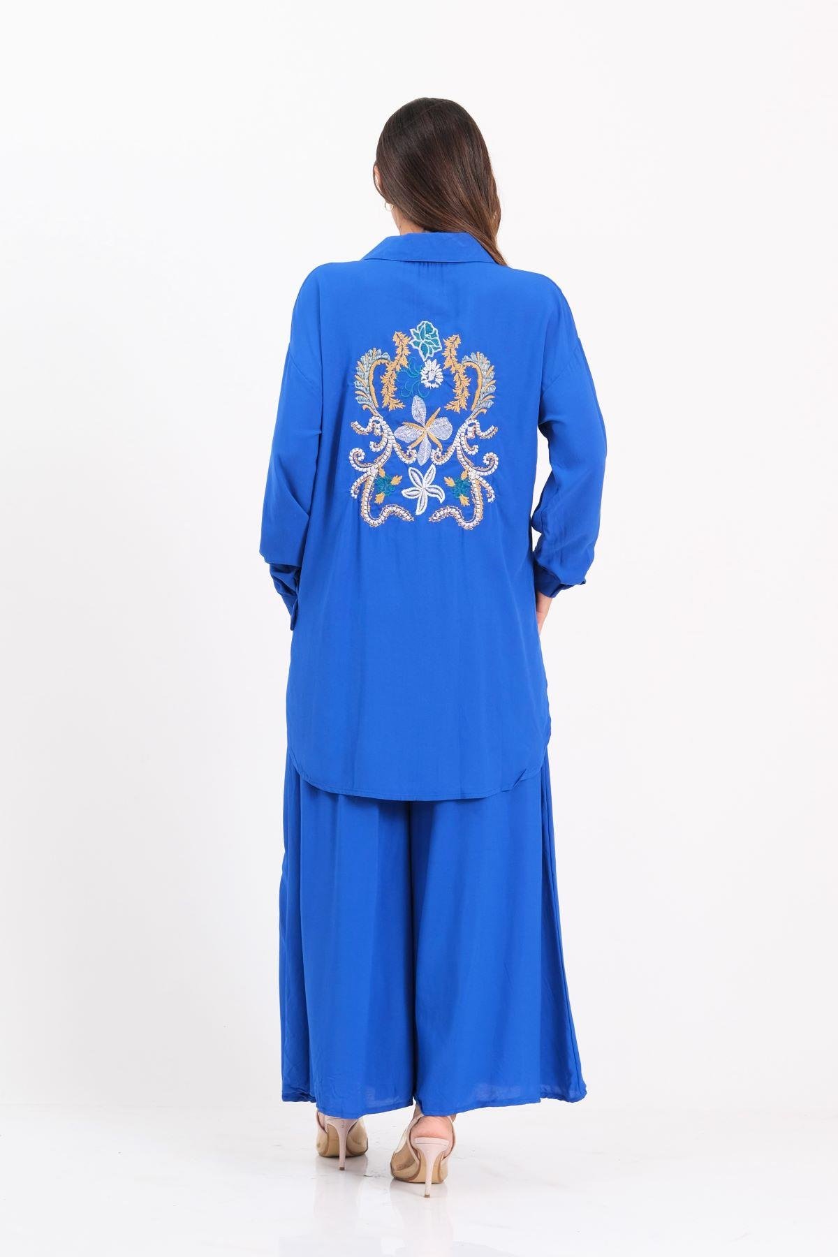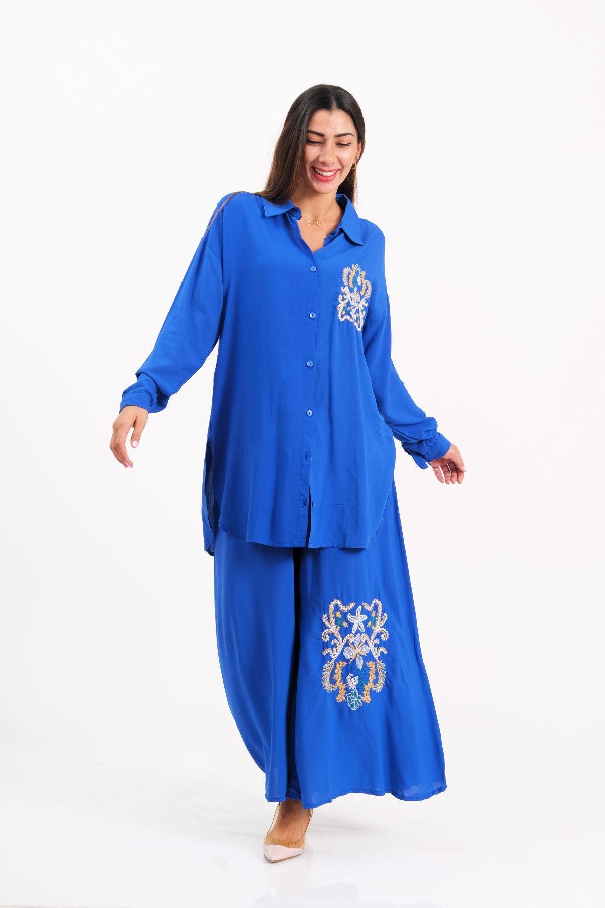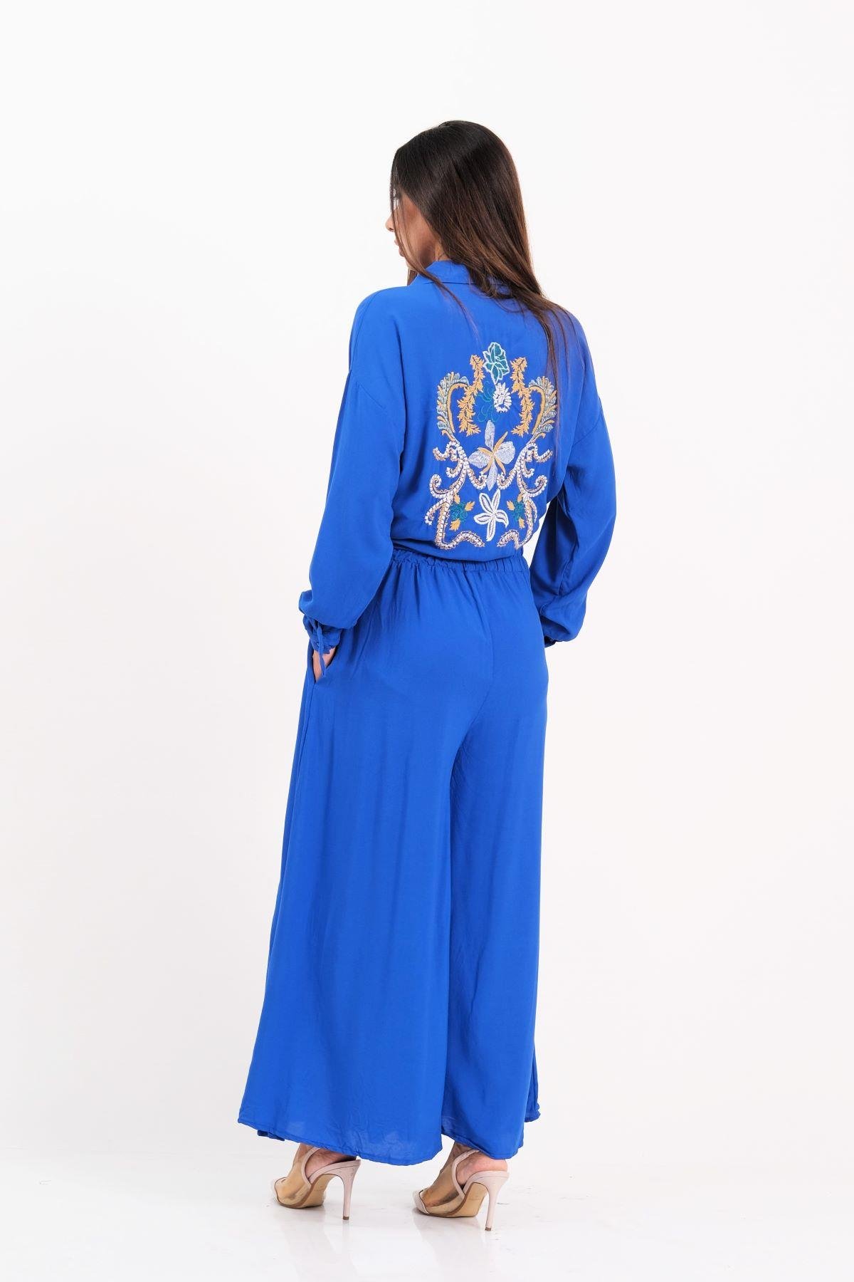 طقم قميص وبنطلون أزرق ساكس مطرز من الأمام والخلف مع كتاف على الأكمام