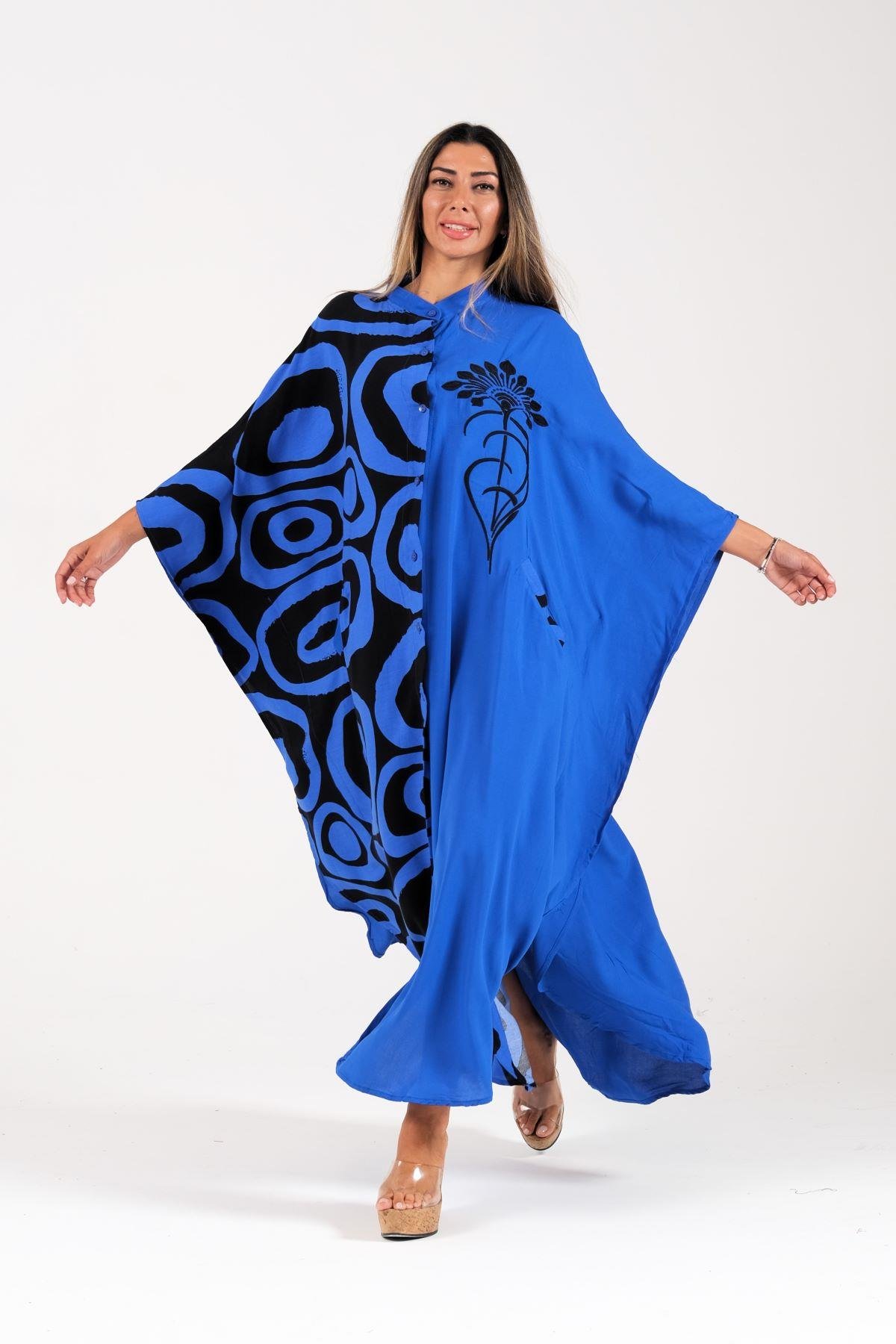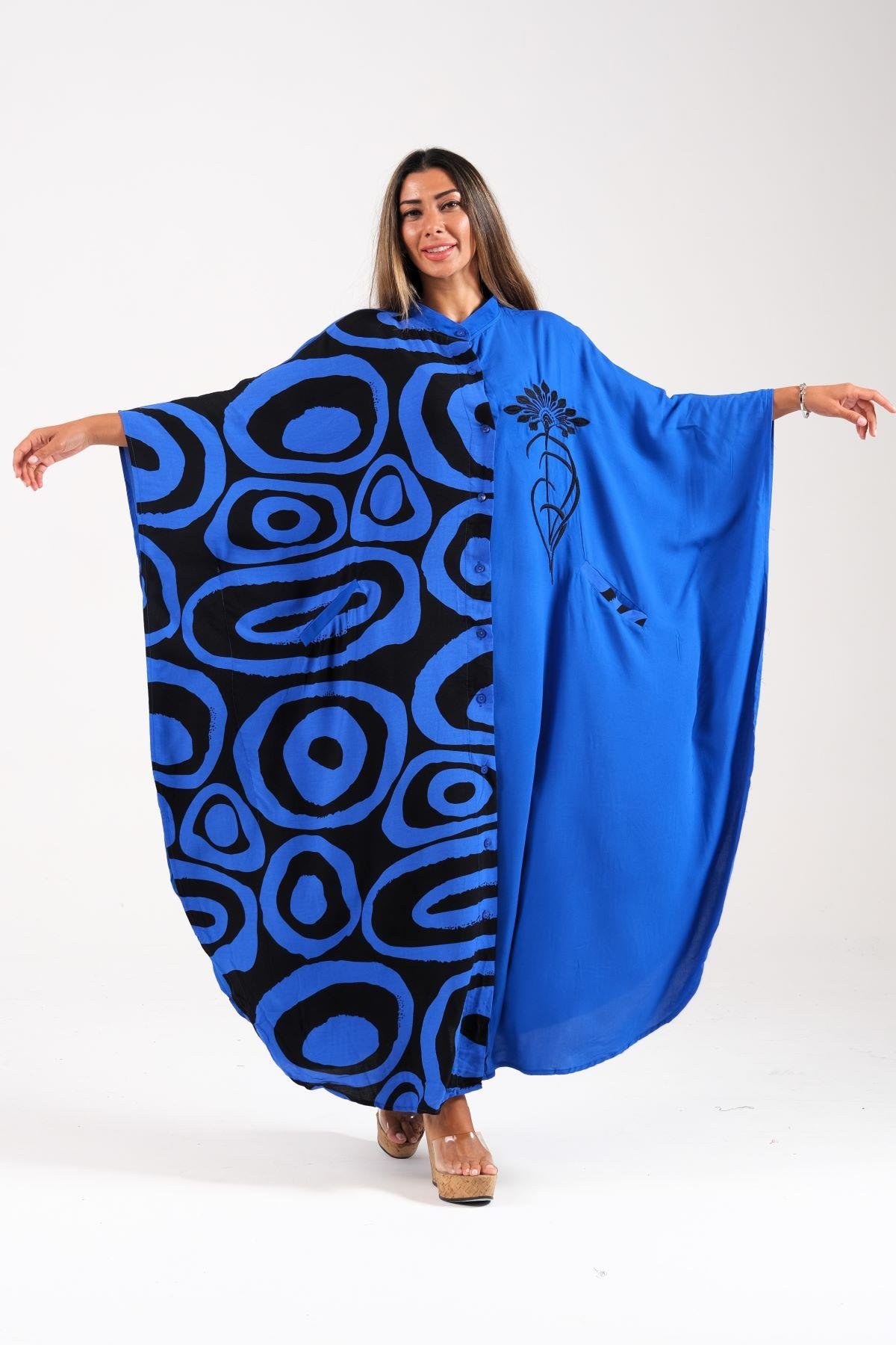 فستان طويل كبير الحجم أزرق ساكس بياقة دائرية وجيب مطرز