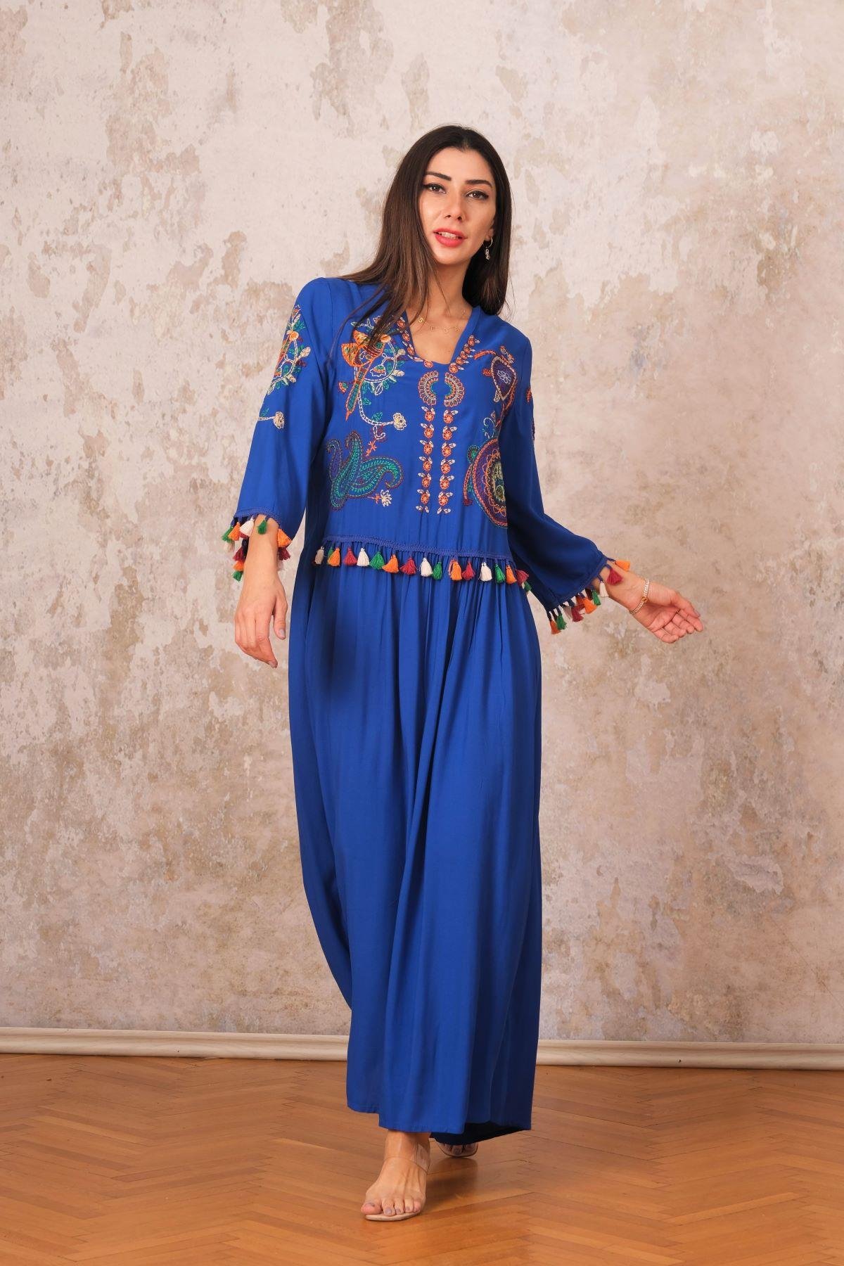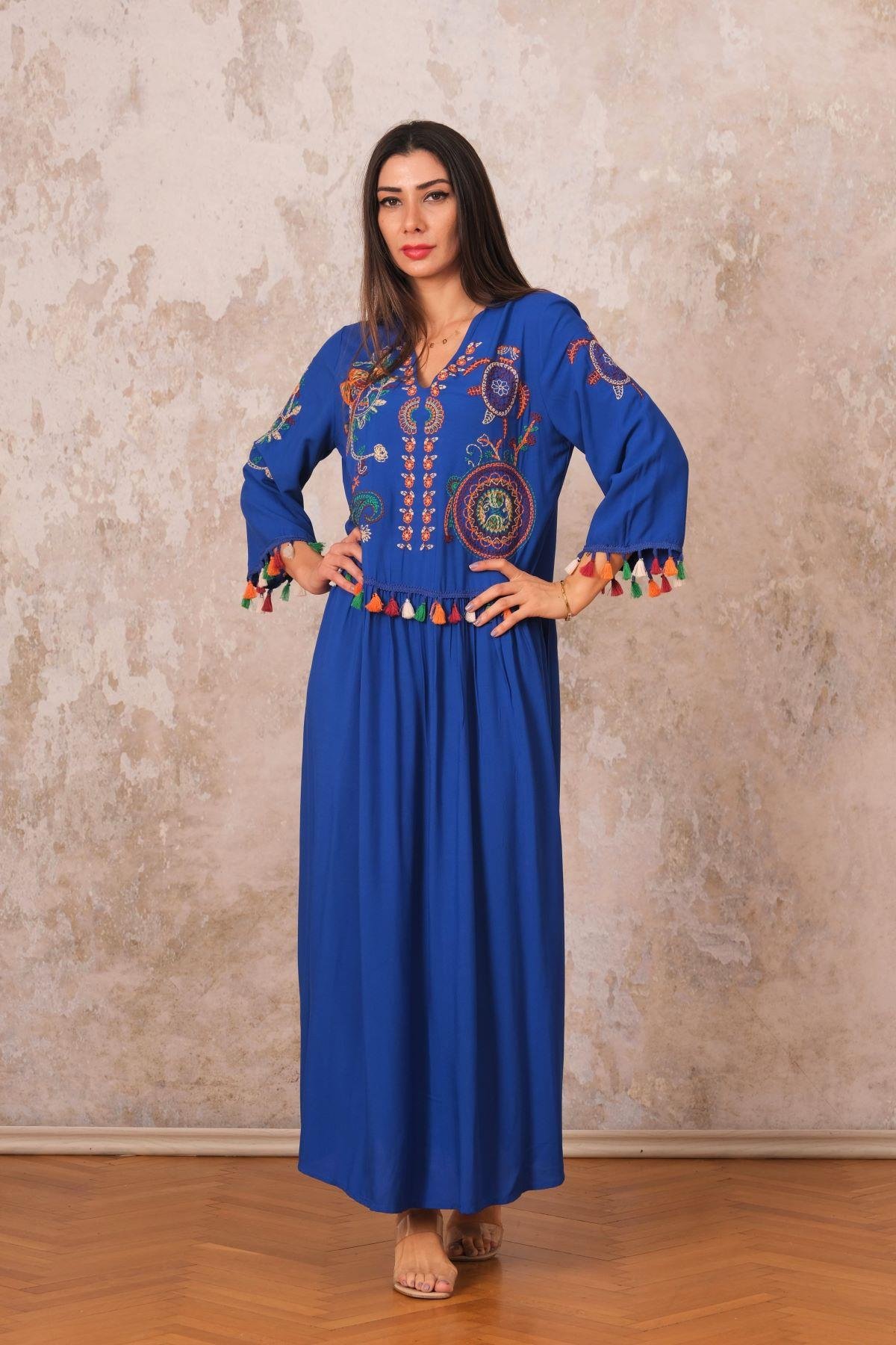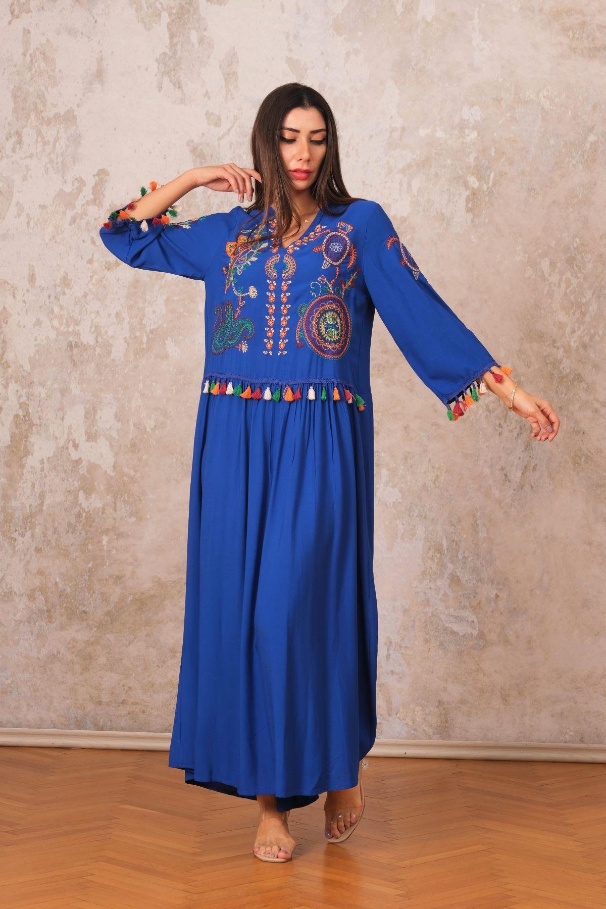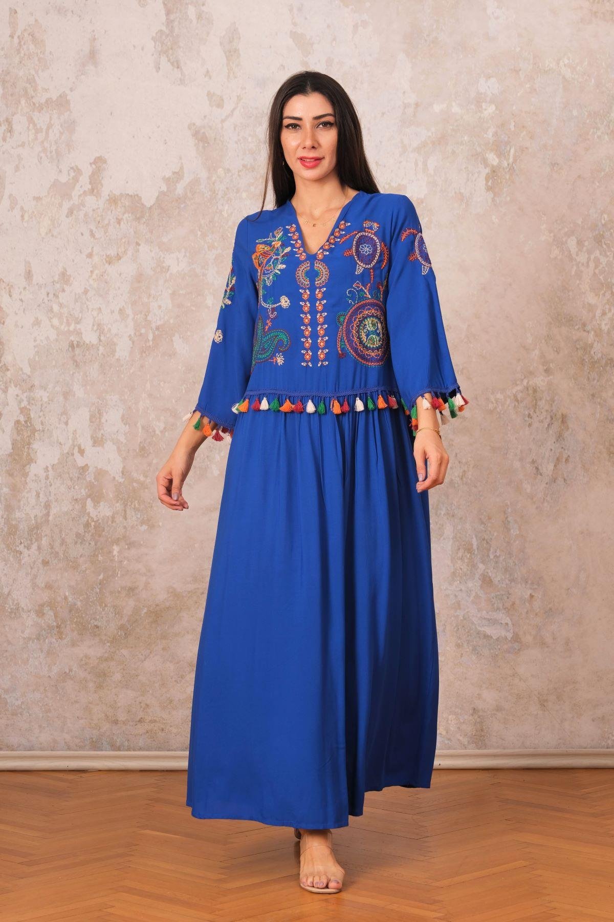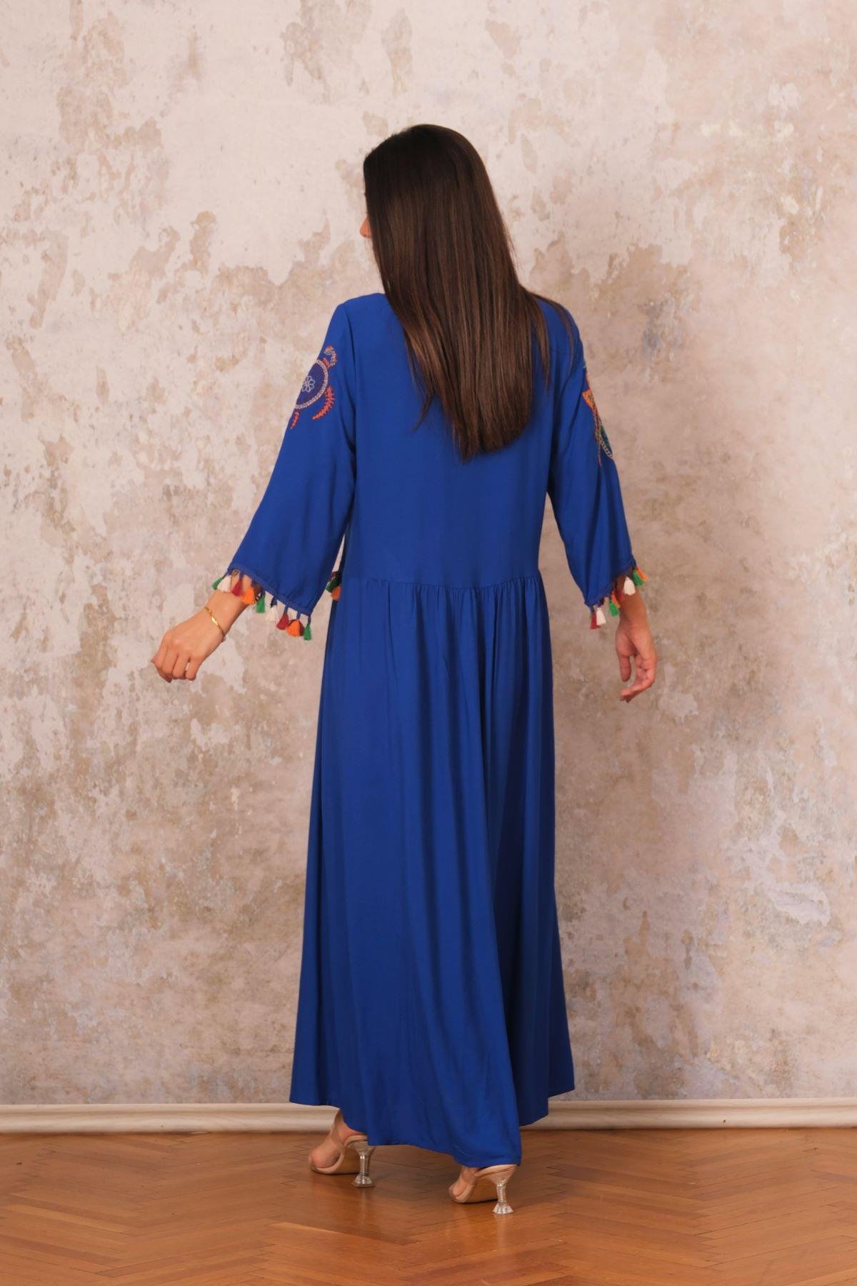 فستان طويل أزرق ساكس بياقة على شكل حرف V مع تطريز أصلي على الأمام والأكمام