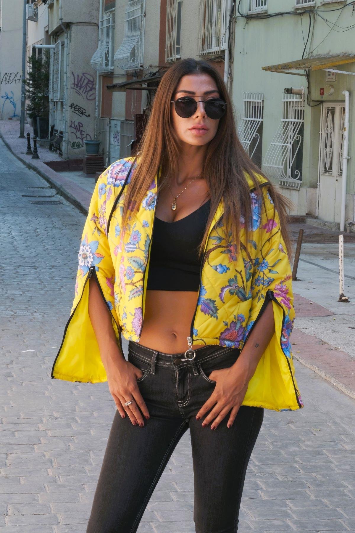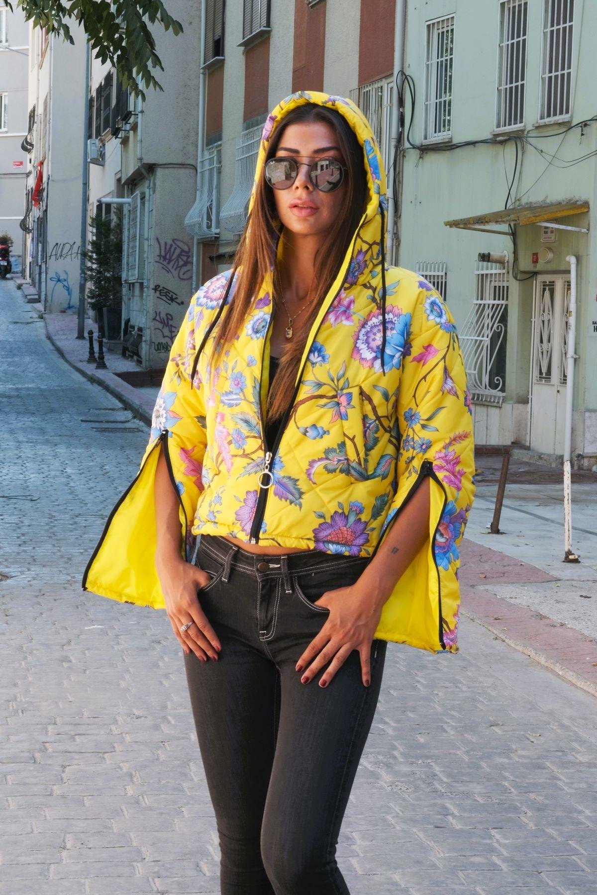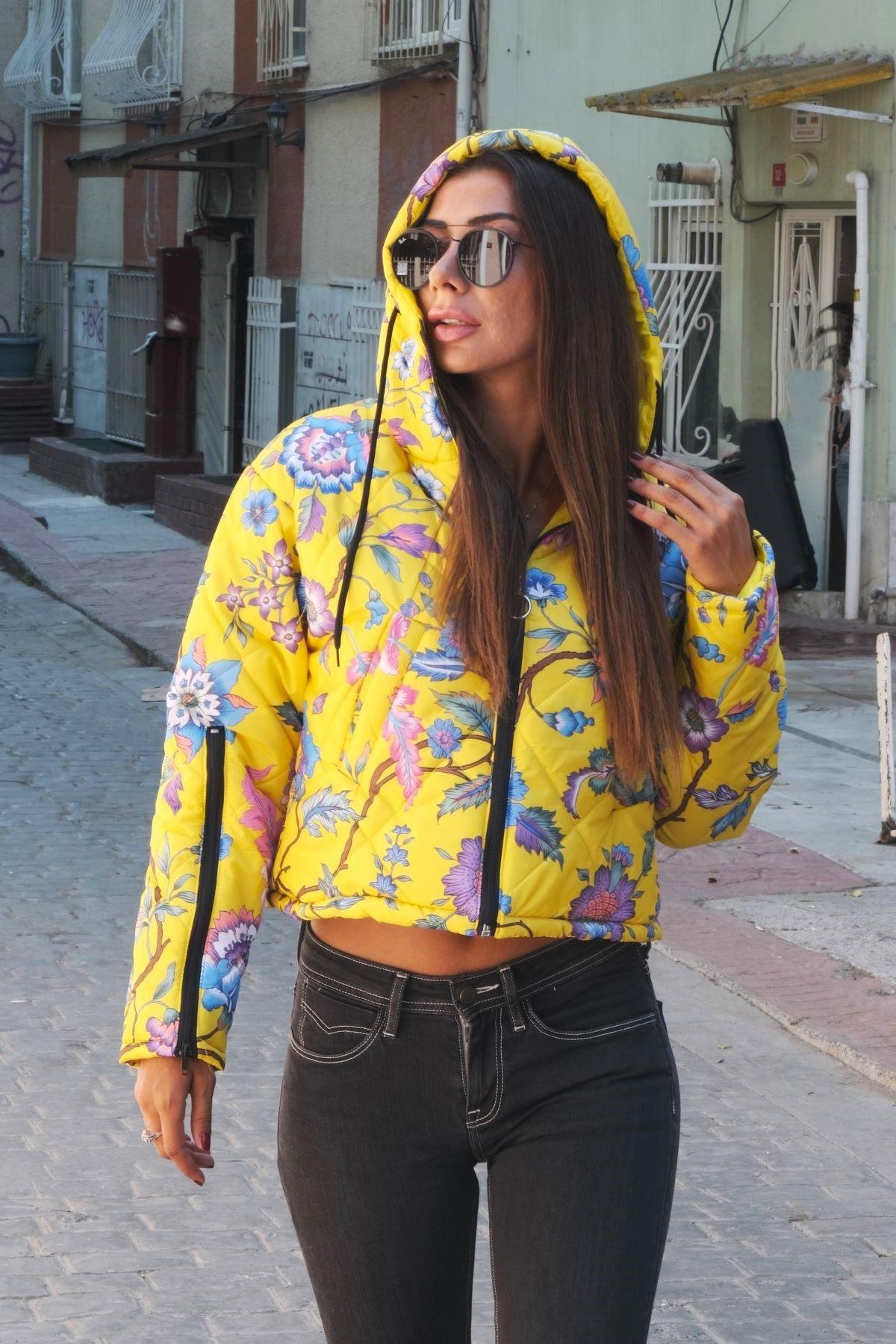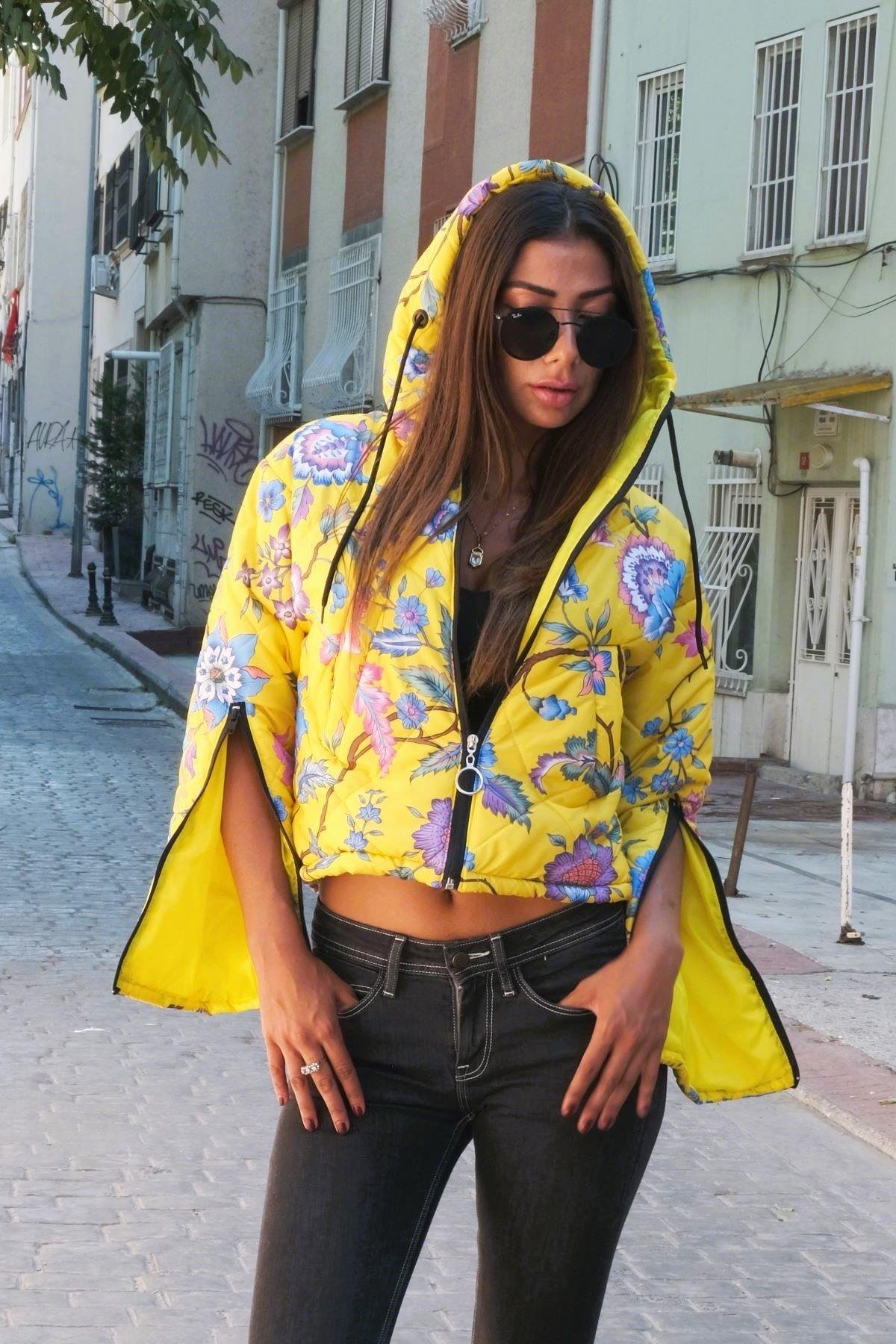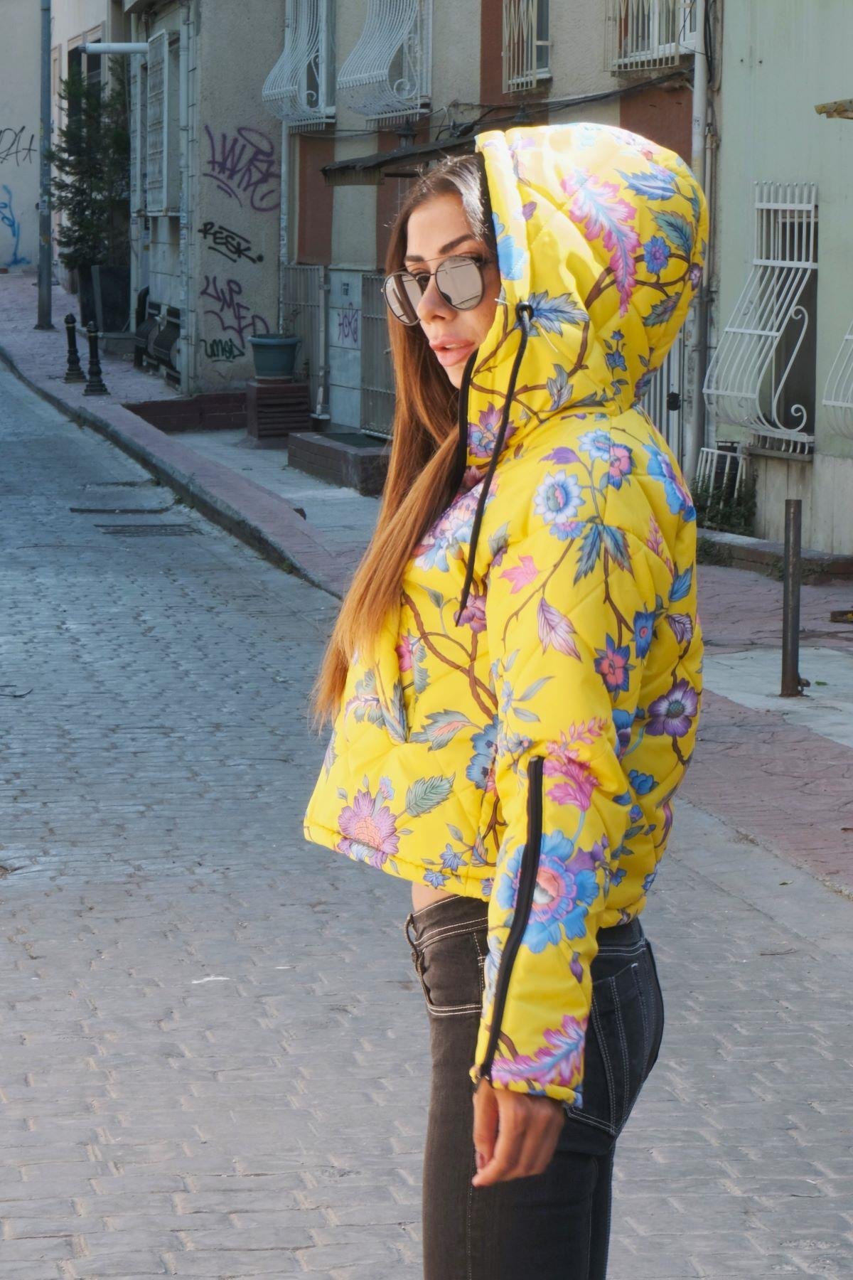 معطف منتفخ قصير بغطاء للرأس وأكمام بسحاب باللون الأصفر