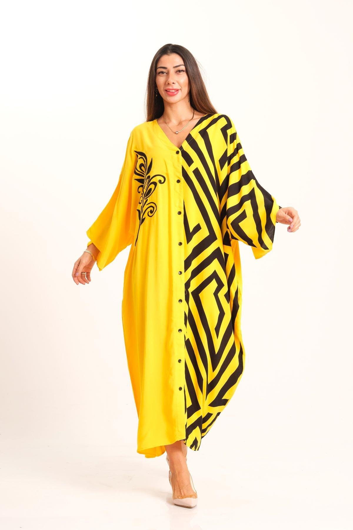 فستان قميص طويل كبير الحجم أصفر مزخرف برقبة على شكل حرف V وأكمام واسعة وجيب