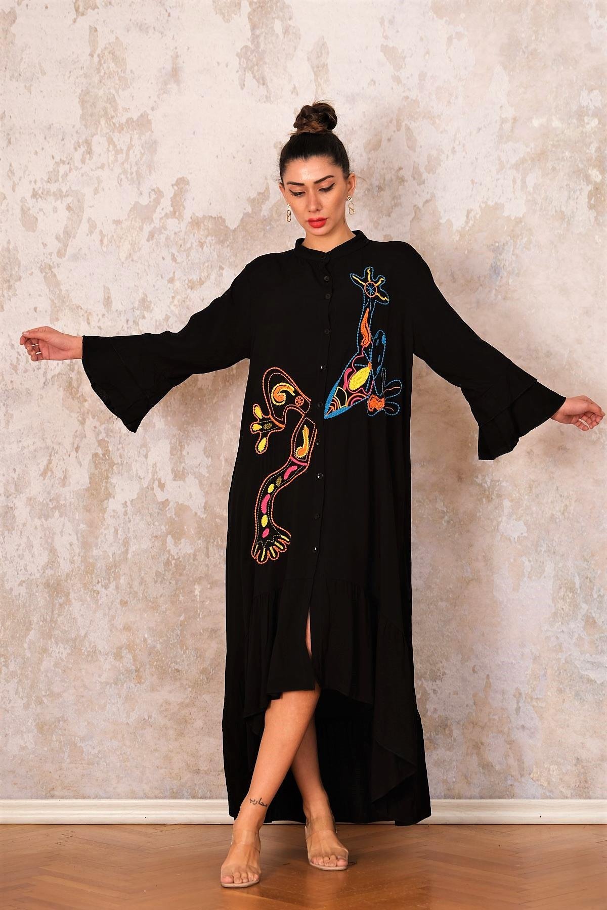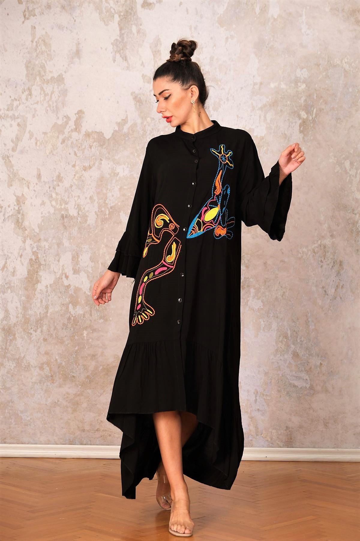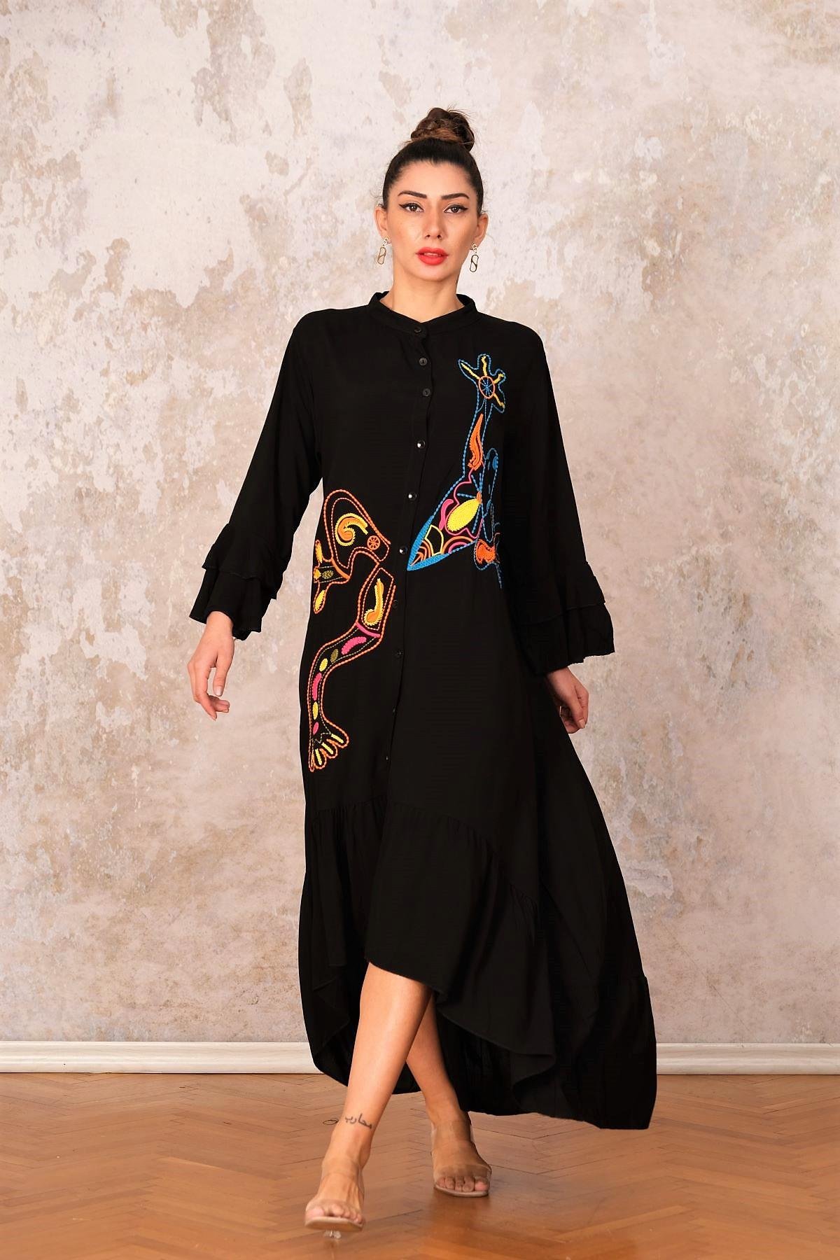 فستان طويل مقاس كبير أسود بياقة عالية، وأكمام وحاشية مكشكشة، ومطرز بجيب