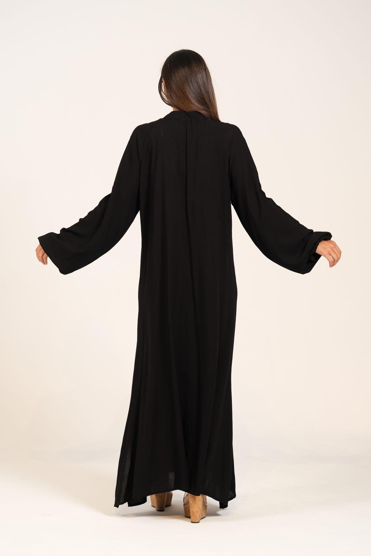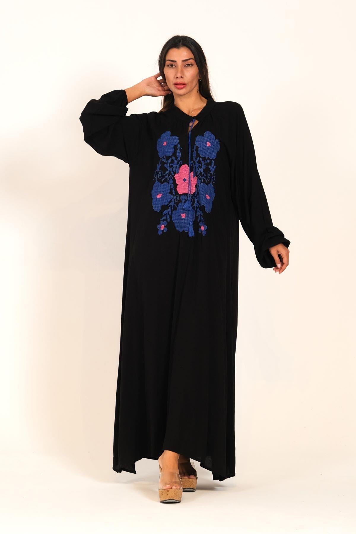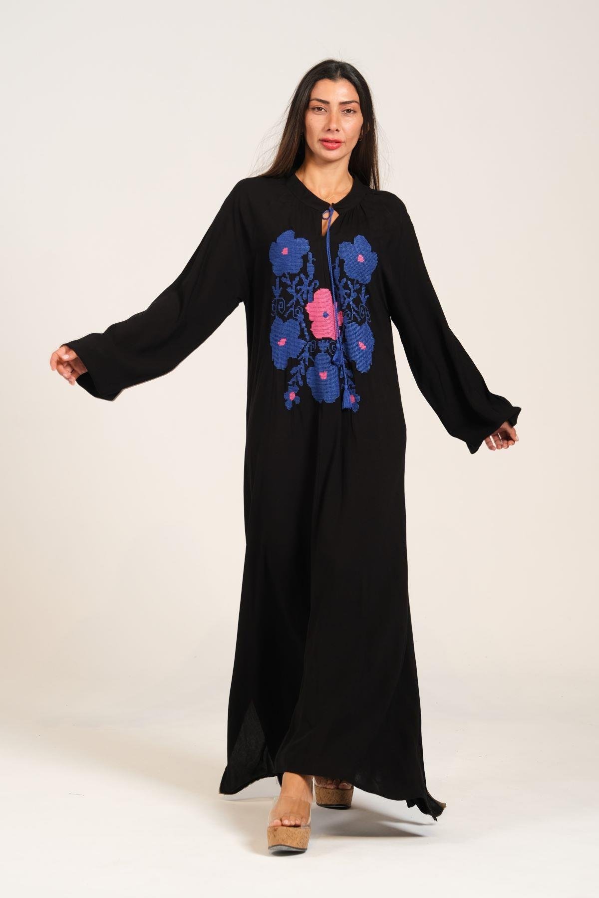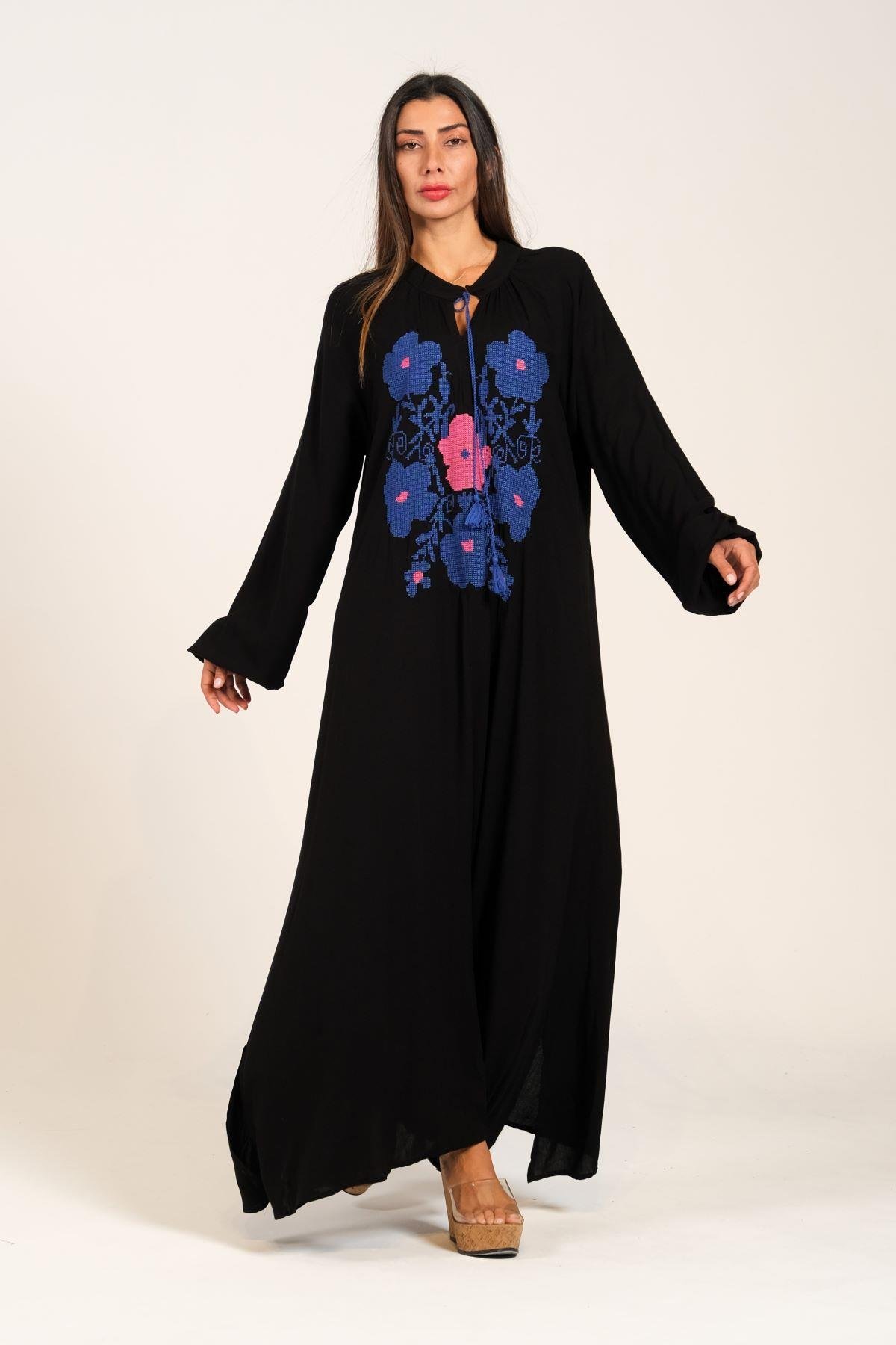فستان طويل أسود برقبة دائرية وأكمام واسعة ومطرز بالورود