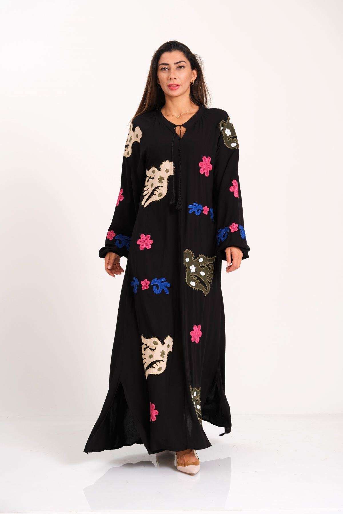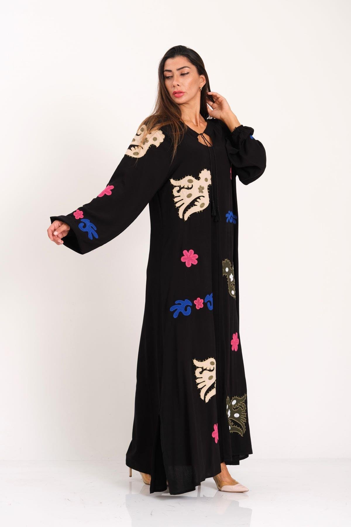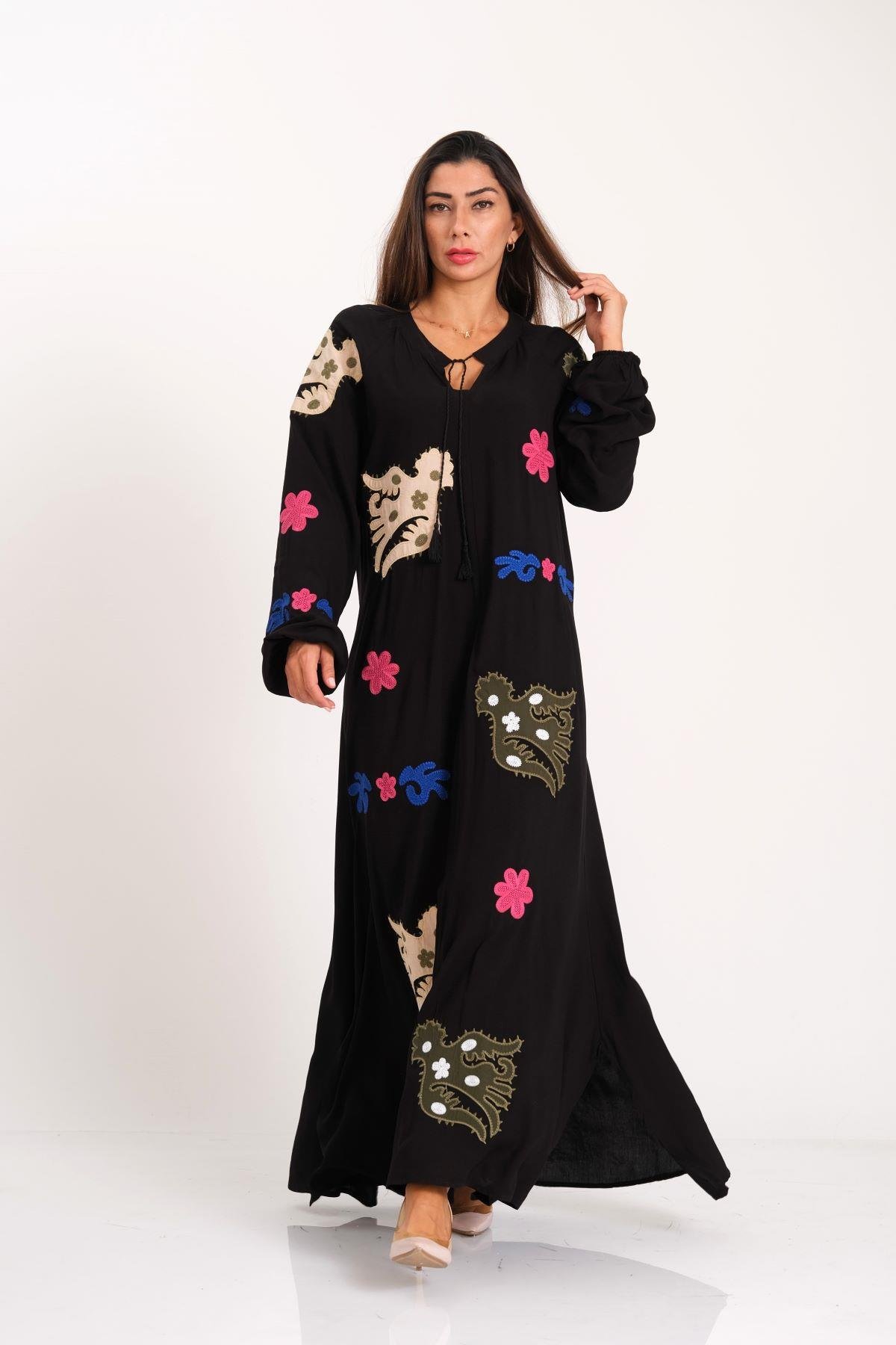 فستان طويل أسود بفتحة رقبة دائرية وأكمام طويلة ومطرز بشراريب