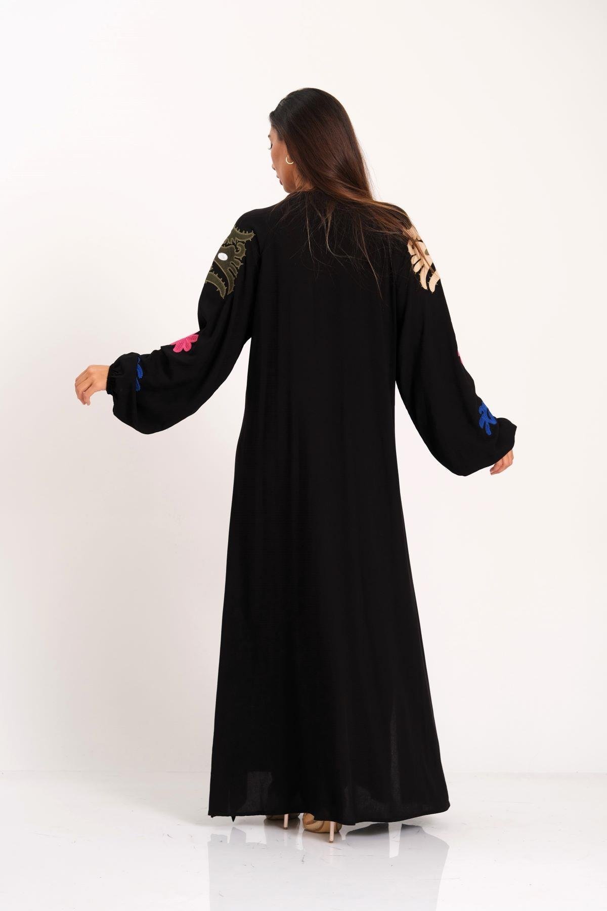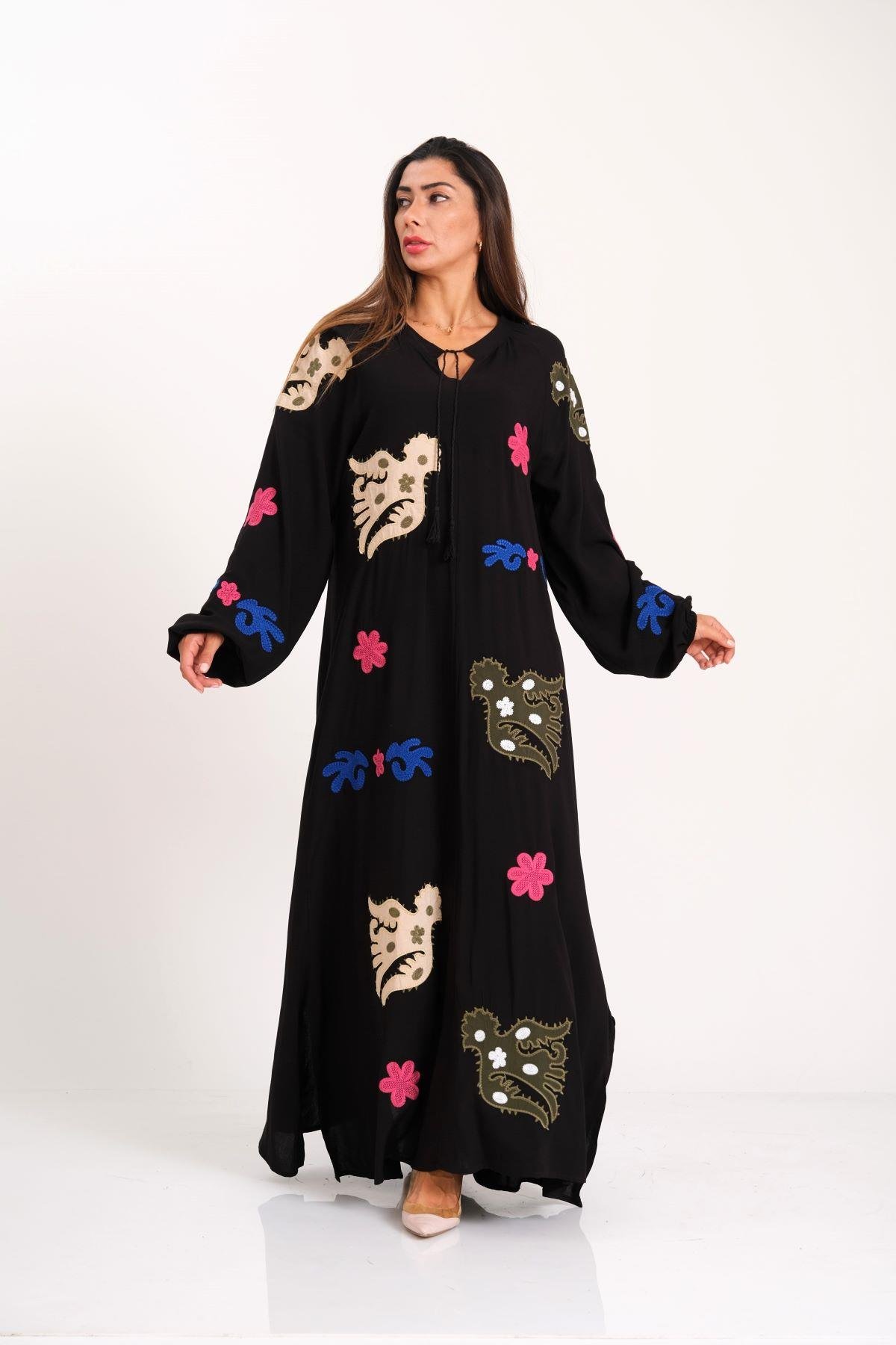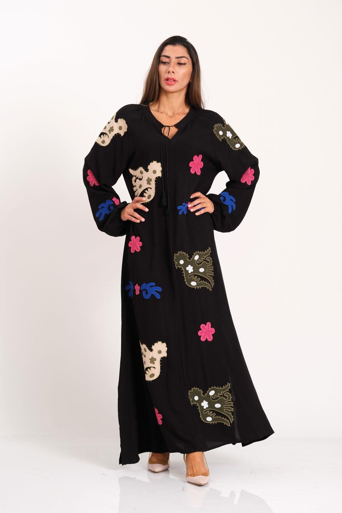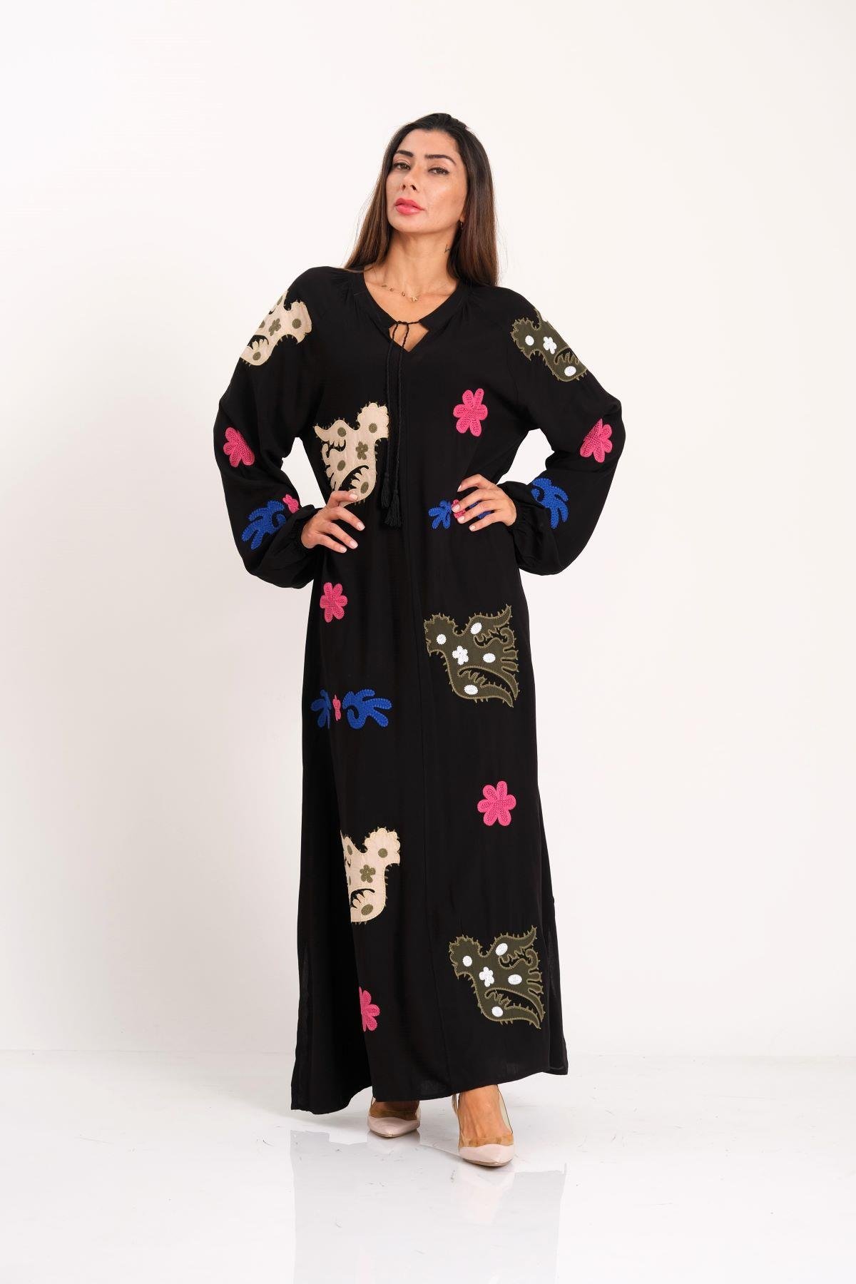 فستان طويل أسود بفتحة رقبة دائرية وأكمام طويلة ومطرز بشراريب