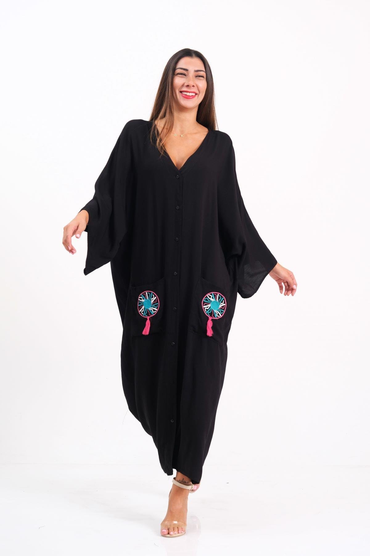 فستان طويل أسود كبير الحجم بفتحة على شكل V ومطرز على الظهر وجيوب