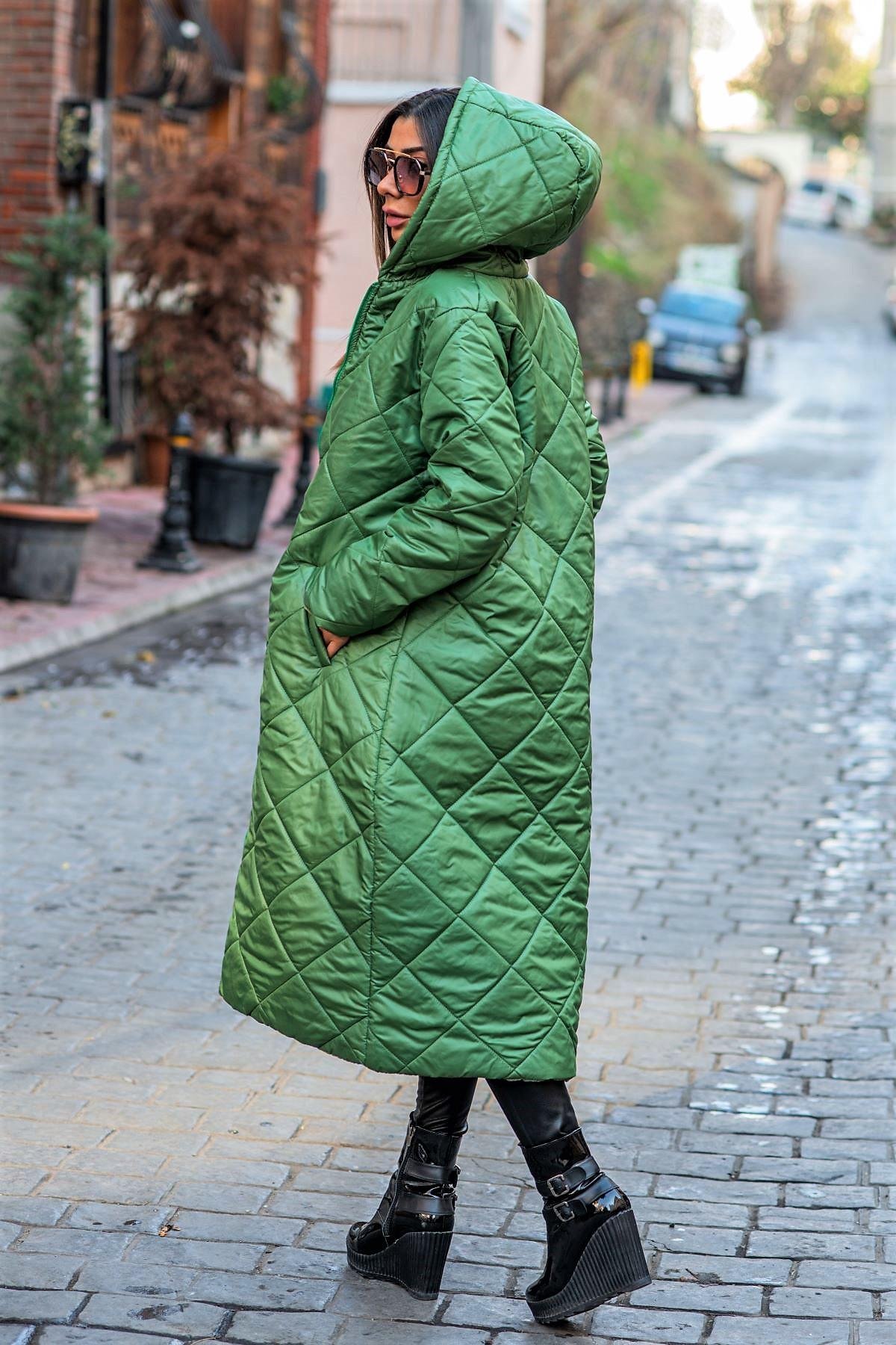معطف منتفخ طويل بغطاء للرأس باللون الأخضر بتصميم ماسي ومقاس كبير