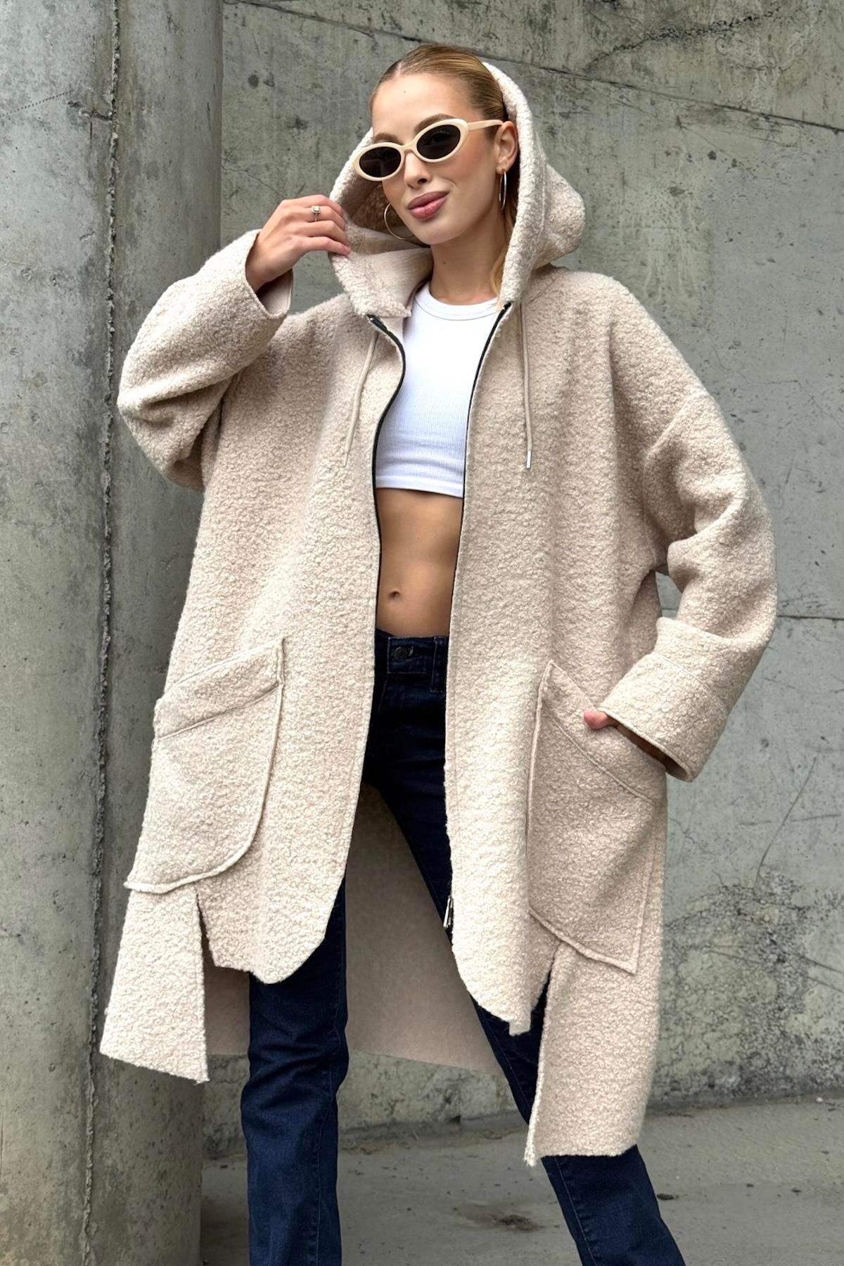 Bej Kapüşonlu Cepli Asimetrik Kesim Tasarım Buklet Kaban (KWSKBTTV609)