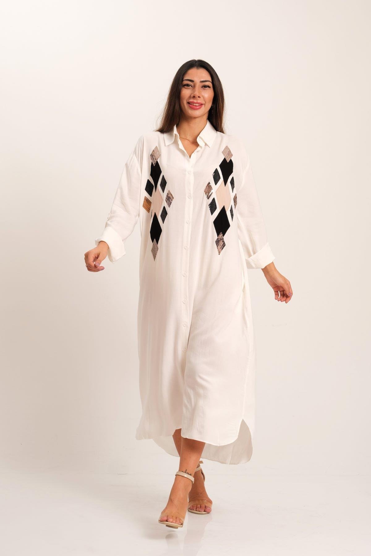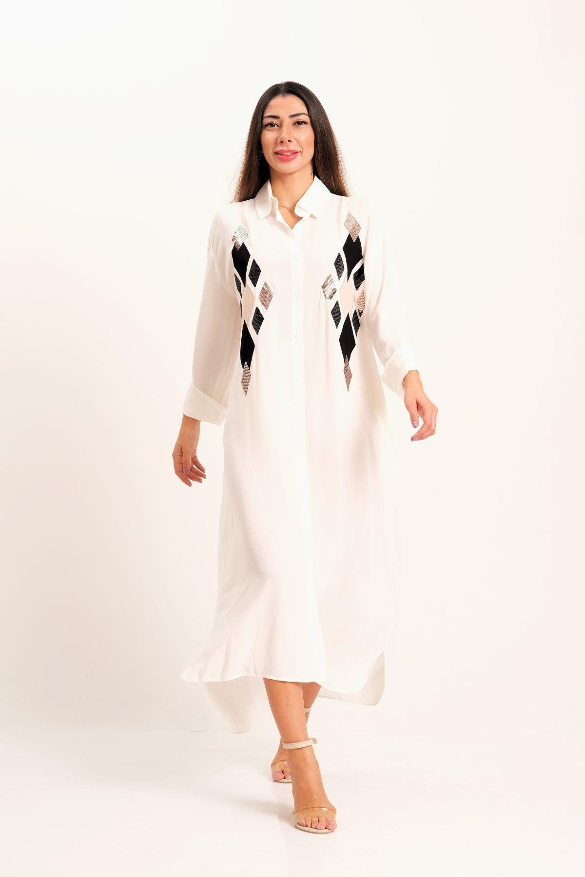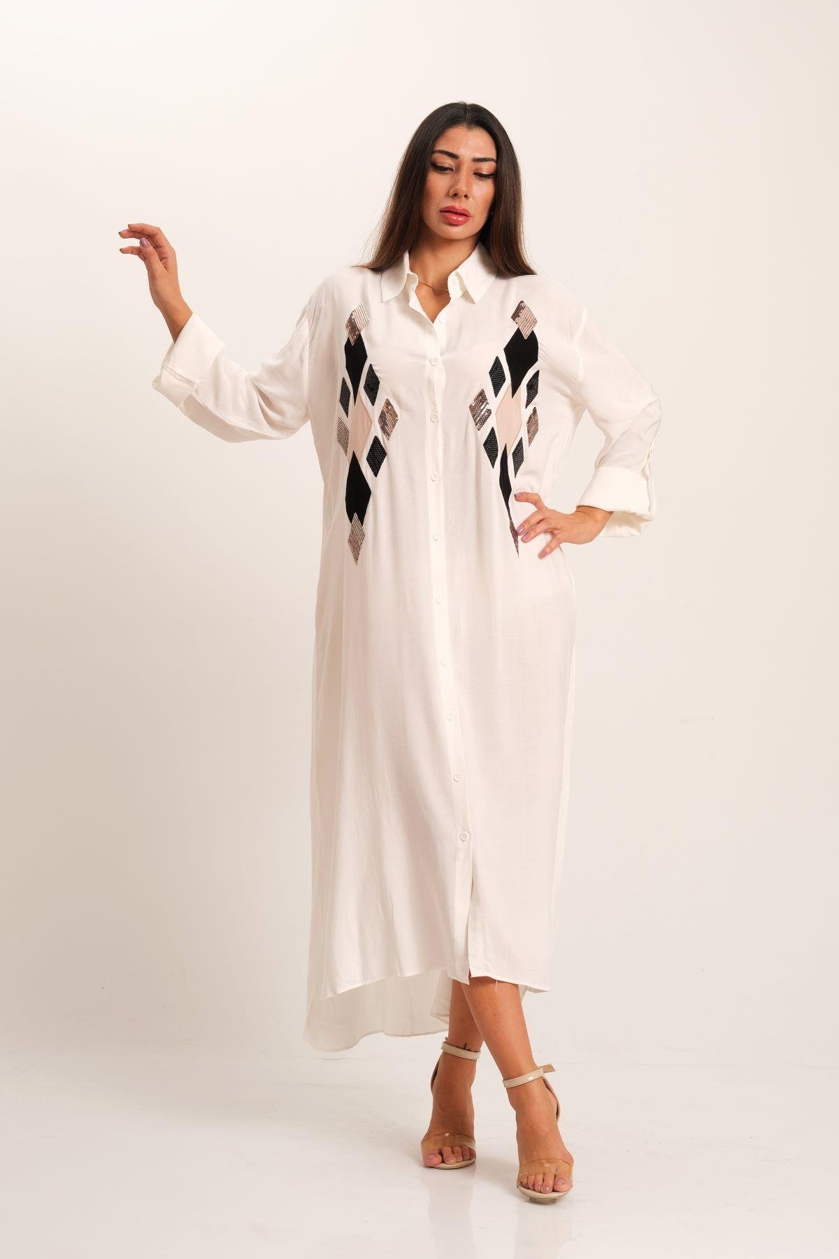 Beyaz Önü Pul Payet Aplike Nakışlı Kolu Apoletli Uzun Gömlek Elbise