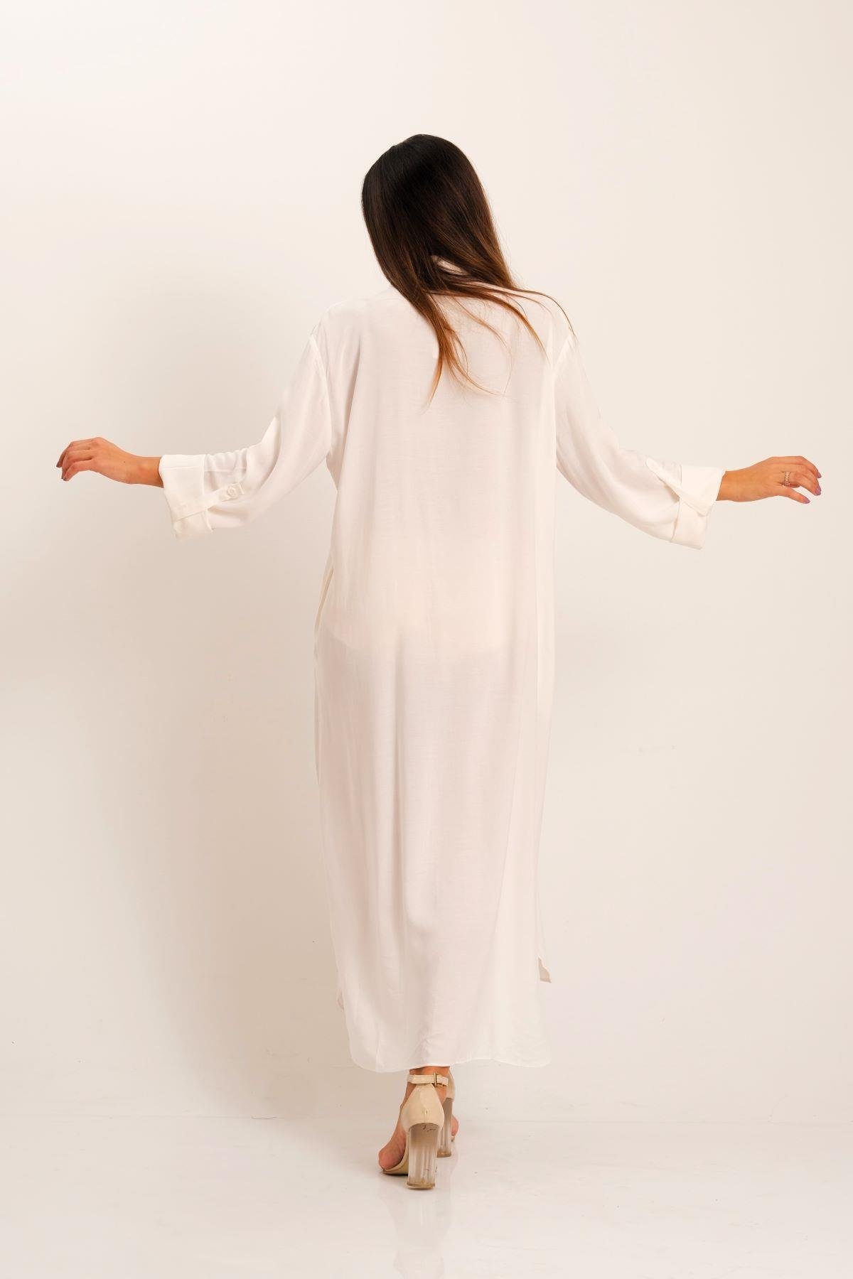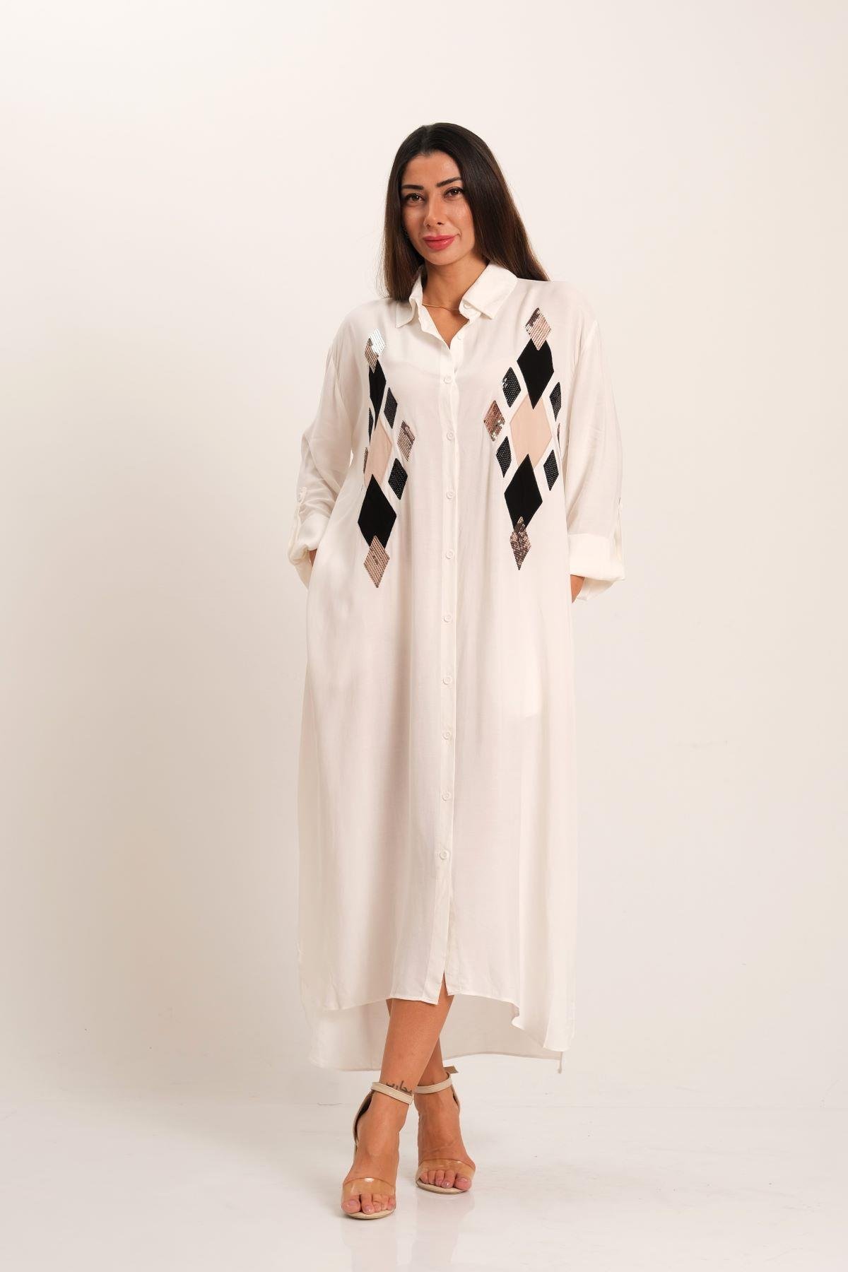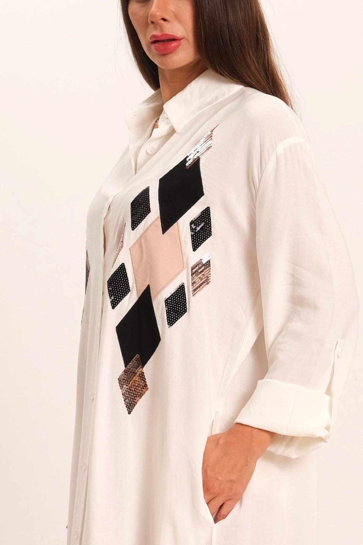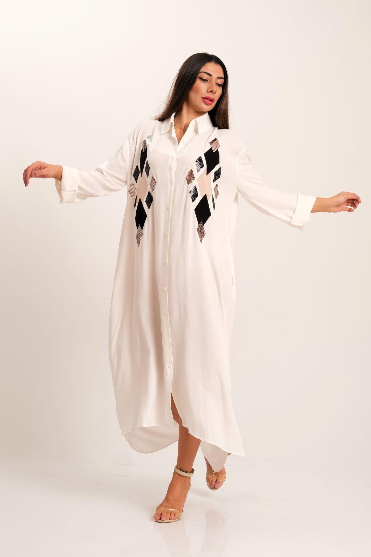 Beyaz Önü Pul Payet Aplike Nakışlı Kolu Apoletli Uzun Gömlek Elbise
