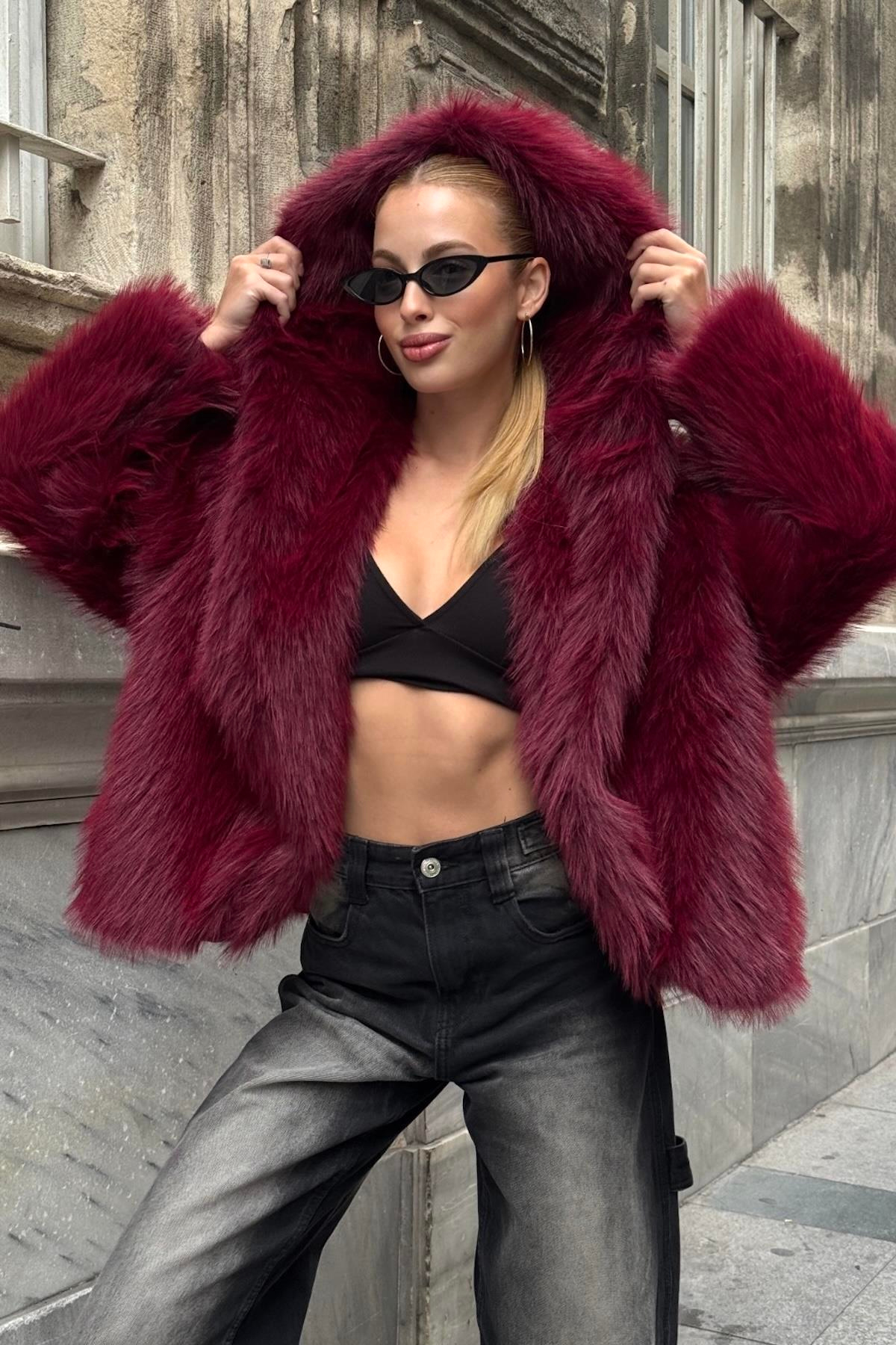 Bordo Kapüşonlu Suni Kürk Mont (MWSKBRTTV220)