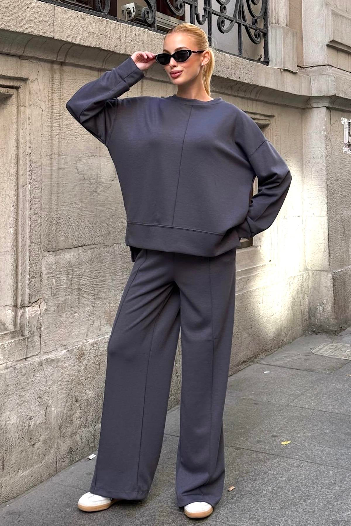 Gri Bisiklet Yaka Beli Lastikli Bol Paça Oysho Kumaş İkili Takım (TKWOBGSSV216)