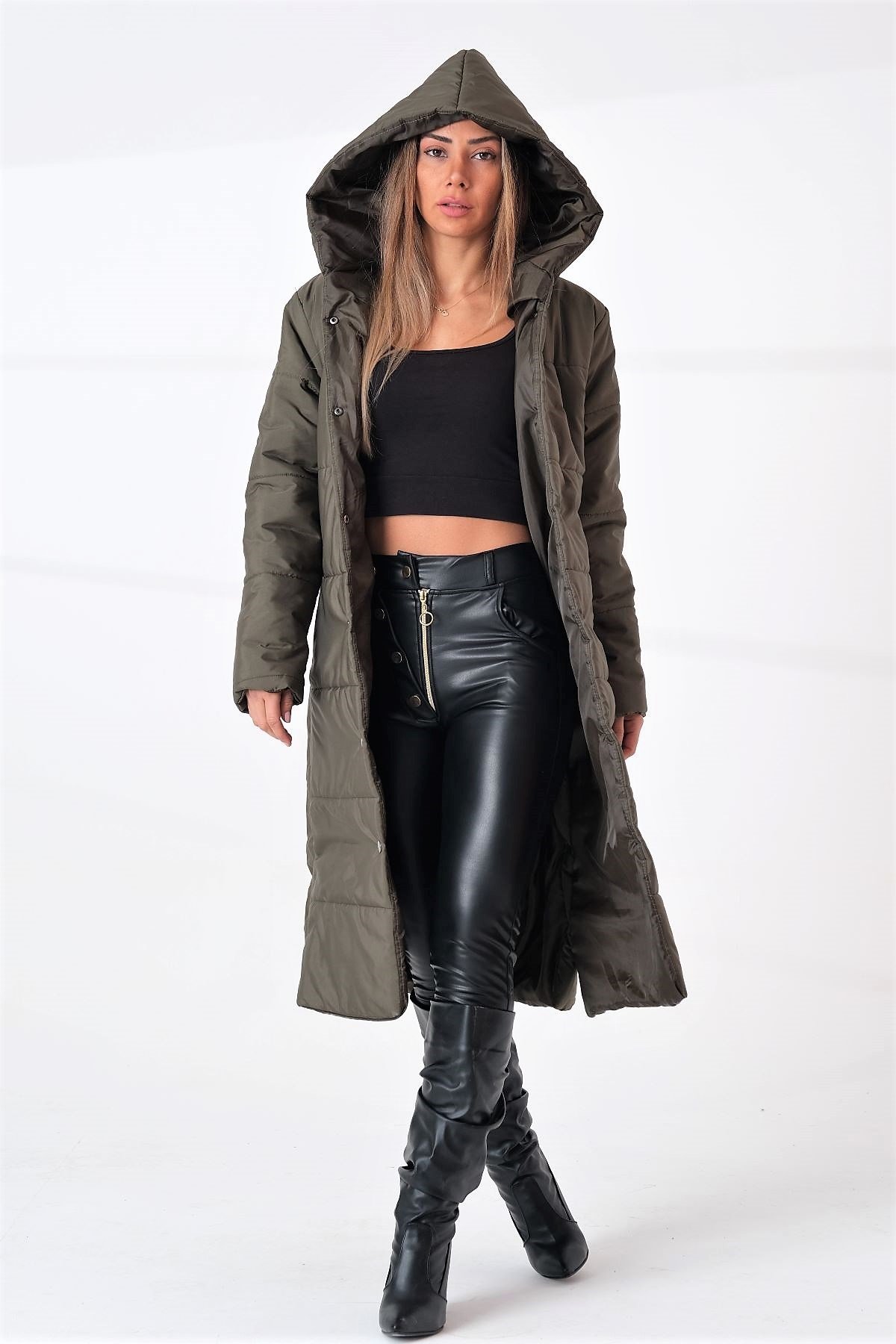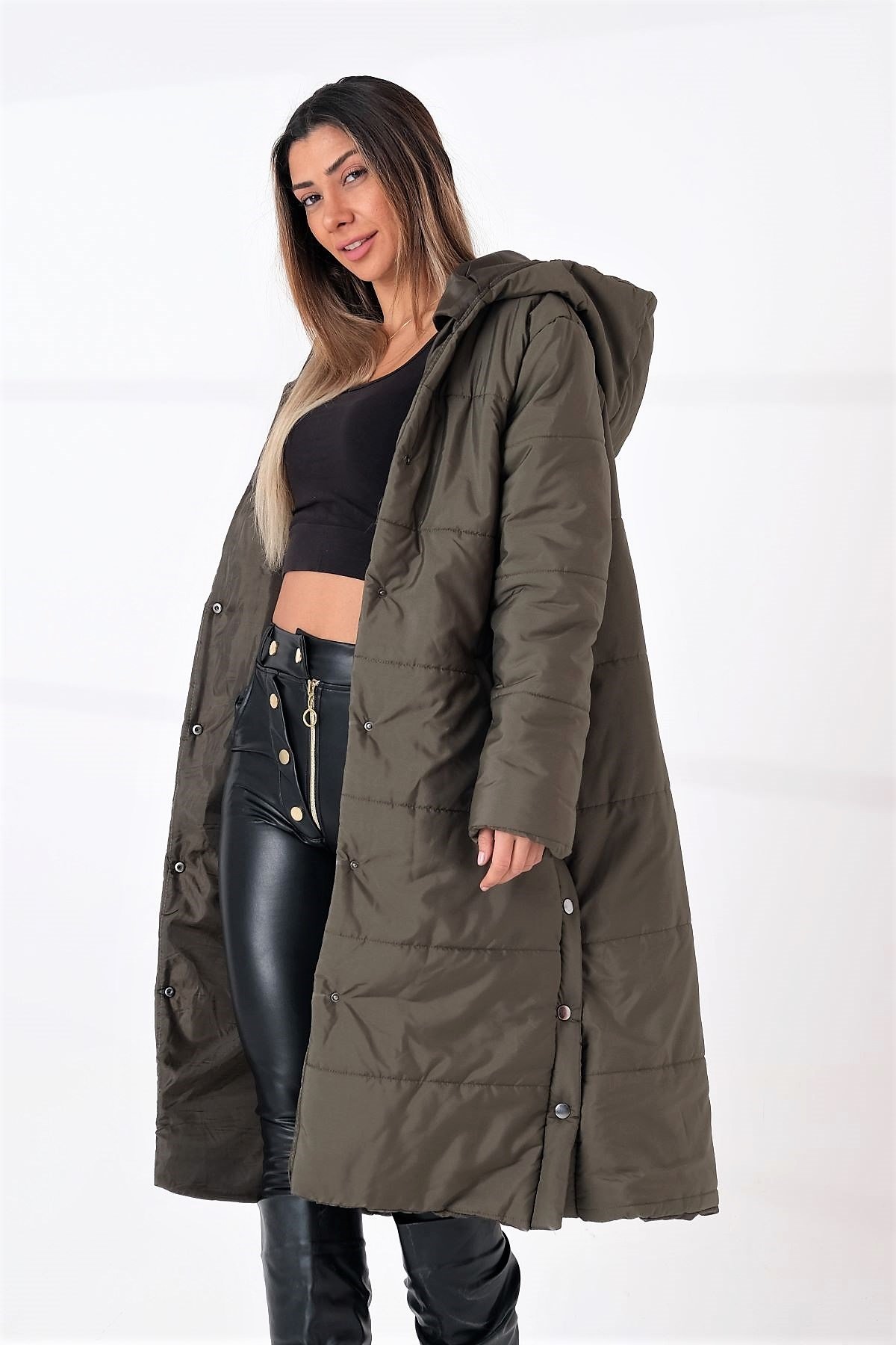 Haki Kapüşonlu Uzun Şişme Mont