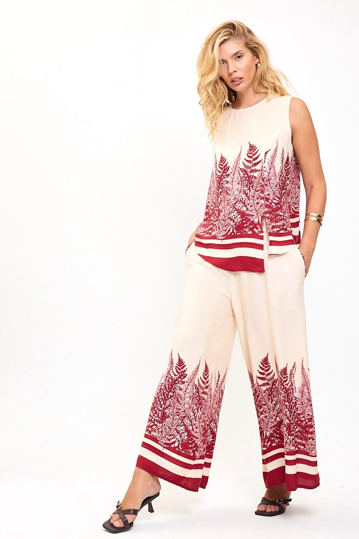 Kırmızı Desenli Beli Lastikli Cepli Bol Paça Bluz Pantolon Takım