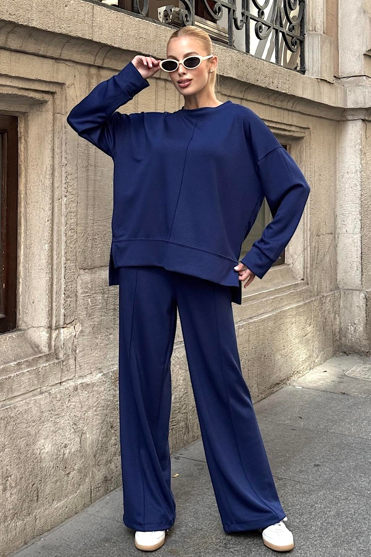Lacivert Bisiklet Yaka Beli Lastikli Bol Paça Oysho Kumaş İkili Takım (TKWOBLSSV216)