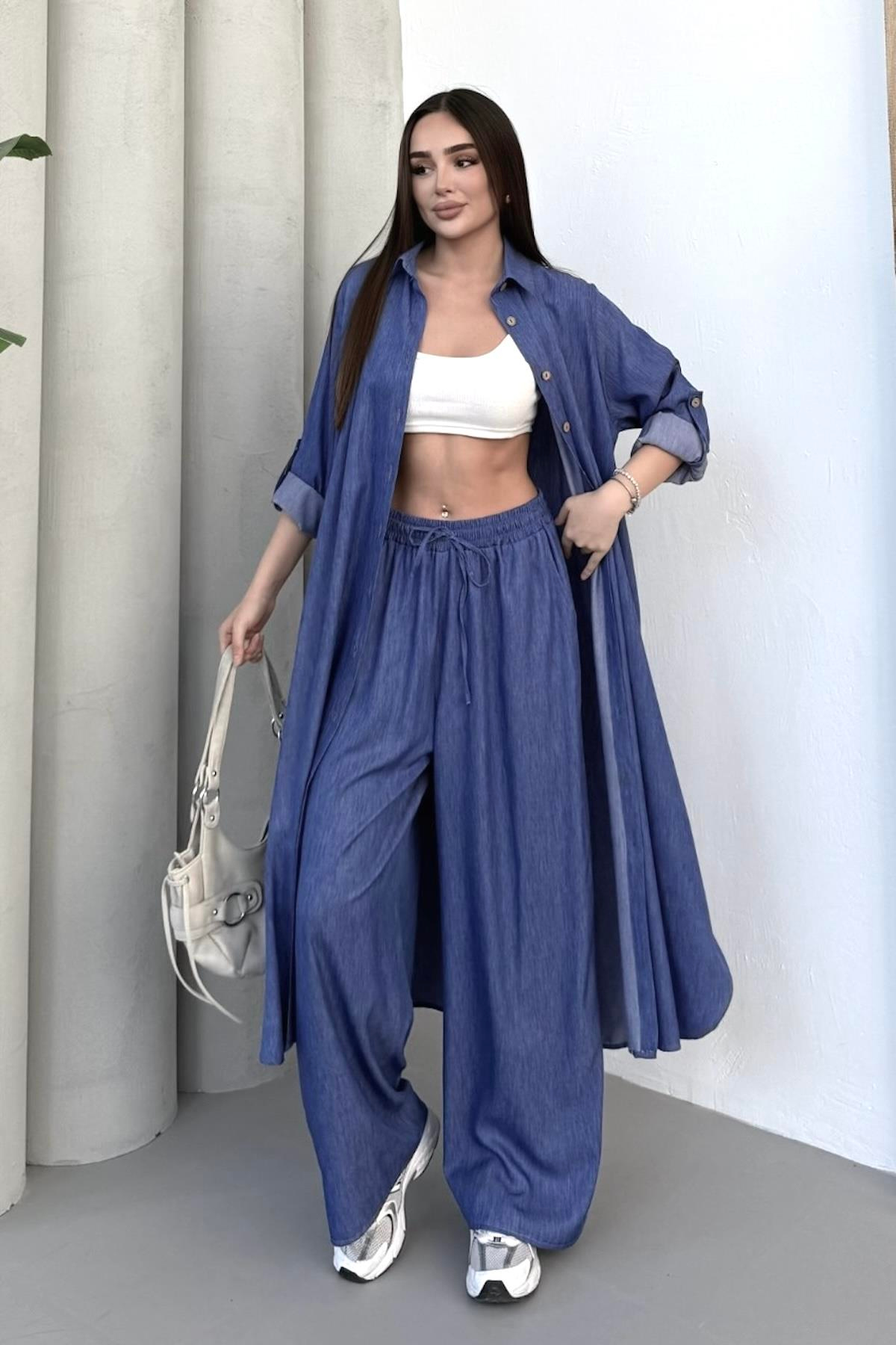 Mavi Kot Görünümlü Beli Lastikli Bol Paça Gömlek Pantolon İkili Takım