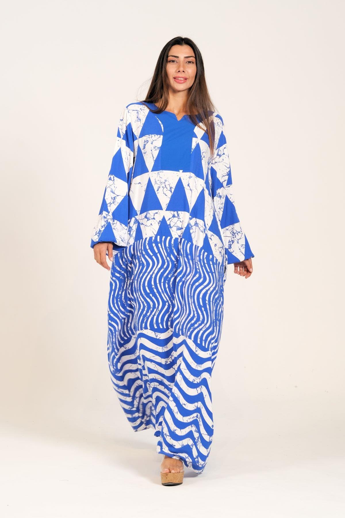 Mavi Kayık Yaka Balon Kollu Desenli Uzun Elbise