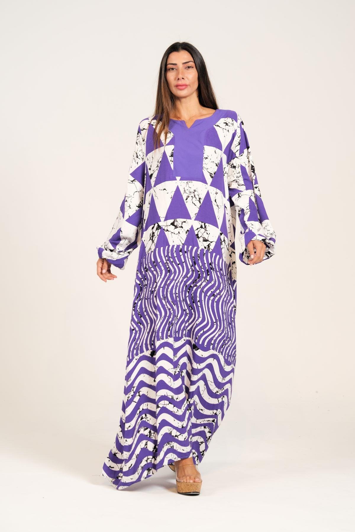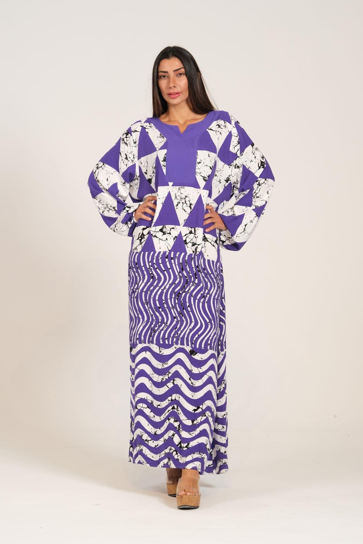 Mor Kayık Yaka Balon Kollu Desenli Uzun Elbise