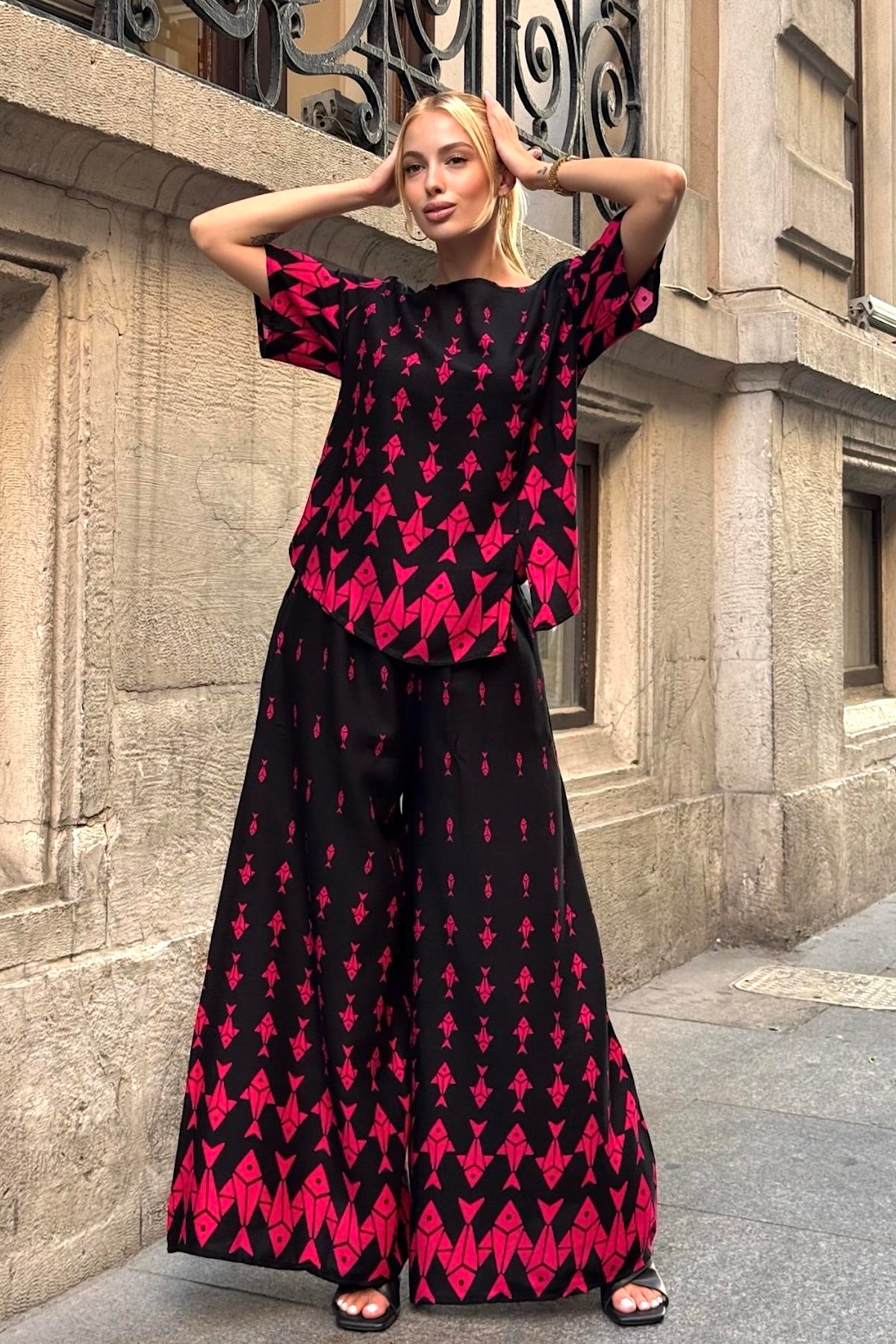 Siyah Balık Desenli Kayık Yaka Beli Lastikli Cepli Bol Paça İkili Takım