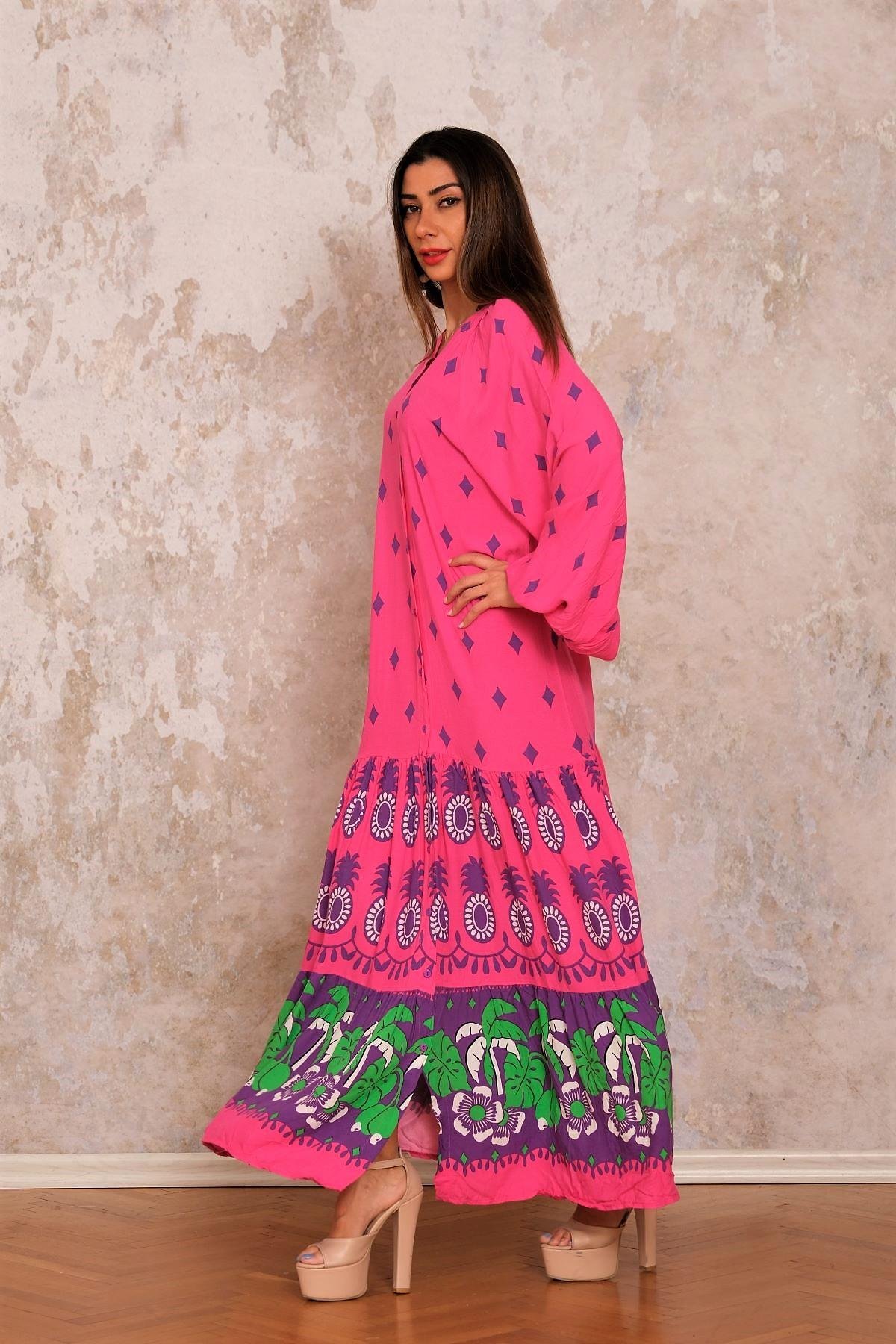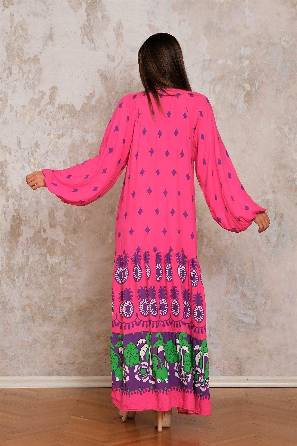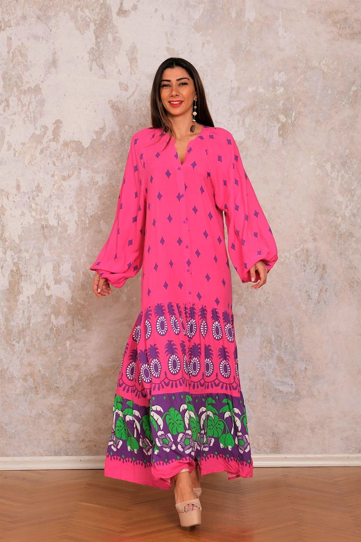 Pembe Etnik Desenli V Yaka Balon Kol Önden Düğmeli Eteği Kat Kat Uzun Elbise