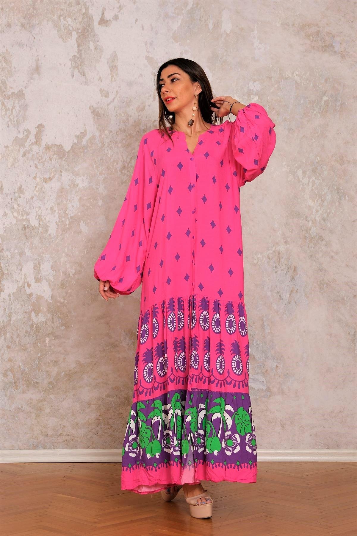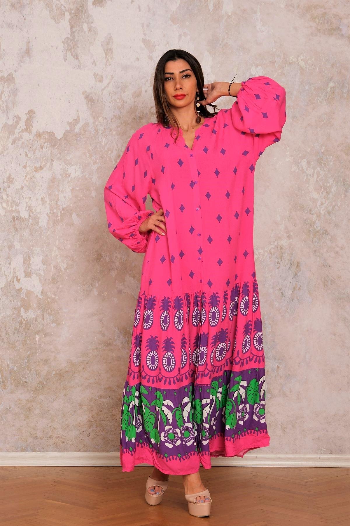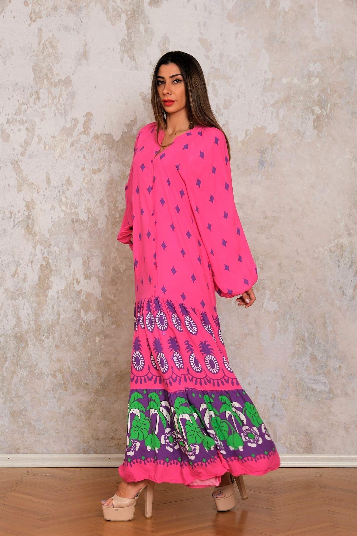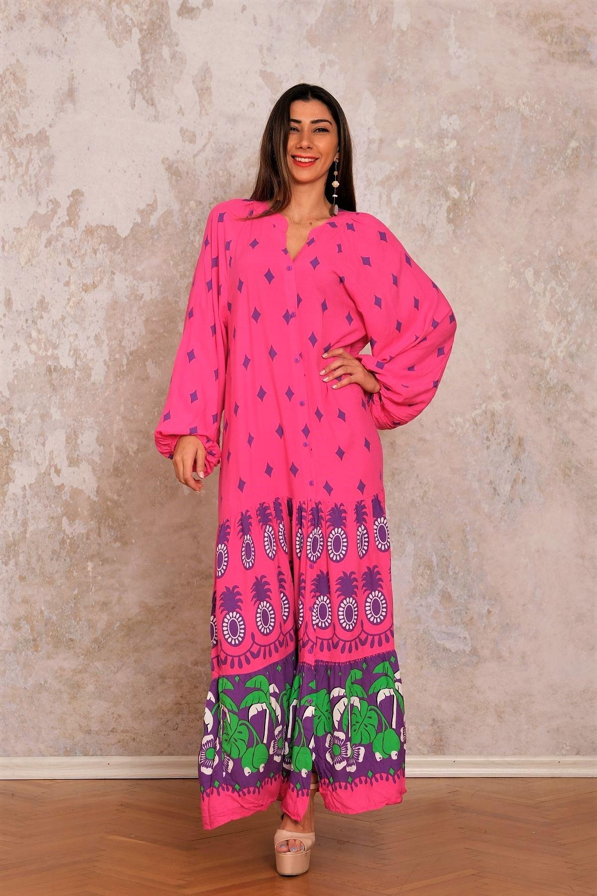 Pembe Etnik Desenli V Yaka Balon Kol Önden Düğmeli Eteği Kat Kat Uzun Elbise